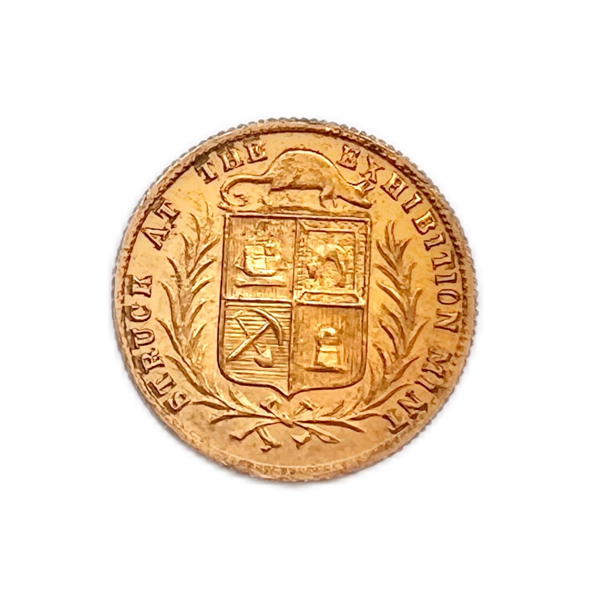 The portrait on the obverse was cut by Julius Hogarth for Stokes and Martin in 1872. The reverse shows an Australian shield and the inscription “Struck at the Exhibition Mint”.