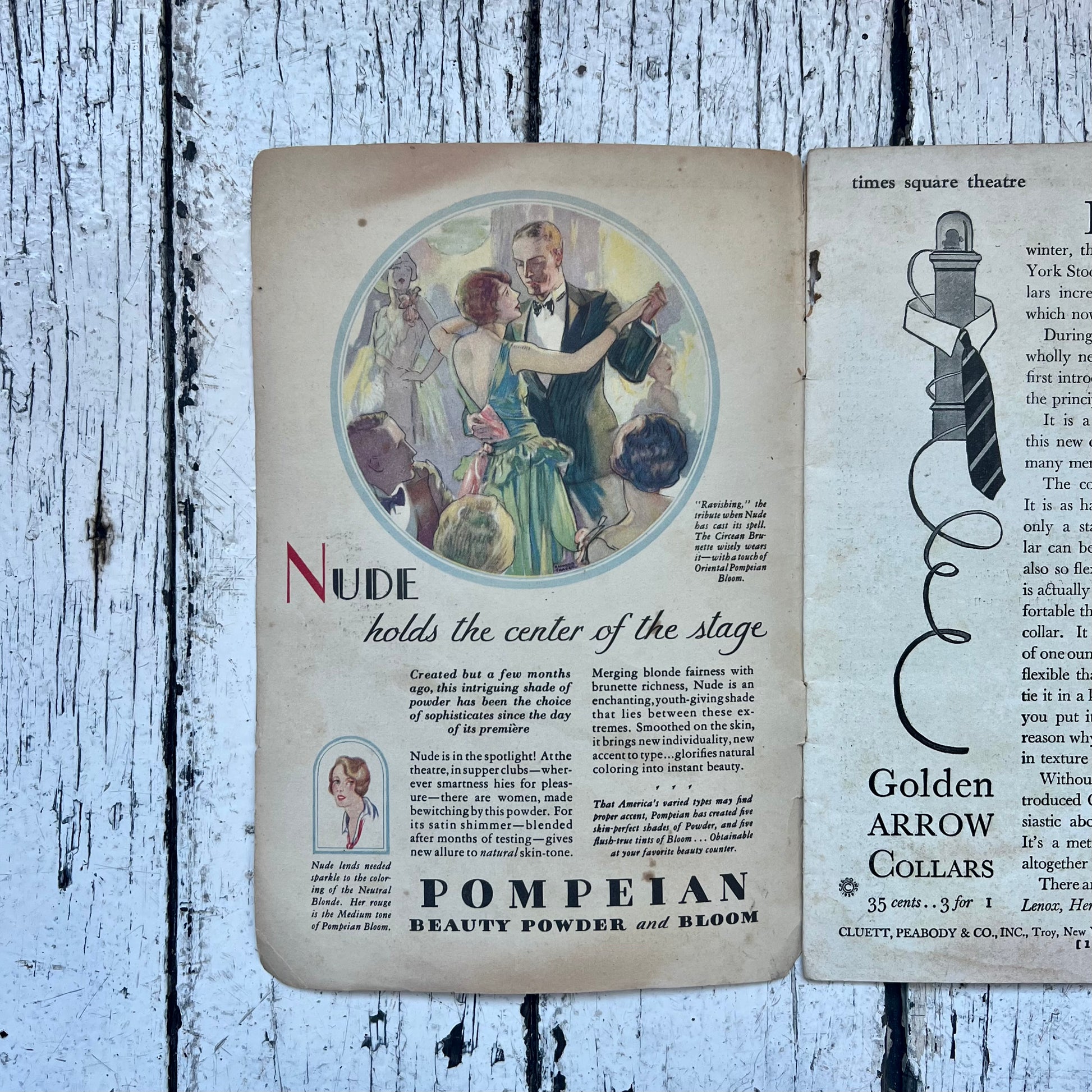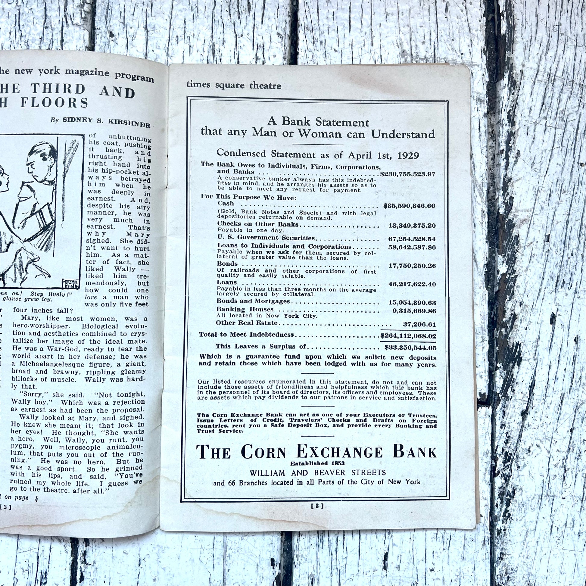 A lovely quintessentially American Art Deco Times Square Theatre playbill circa 1929, capturing the spirit of the Roaring Twenties just before it all came crashing down. Jed Harris, a highly successful Broadway producer, was manager at the time.