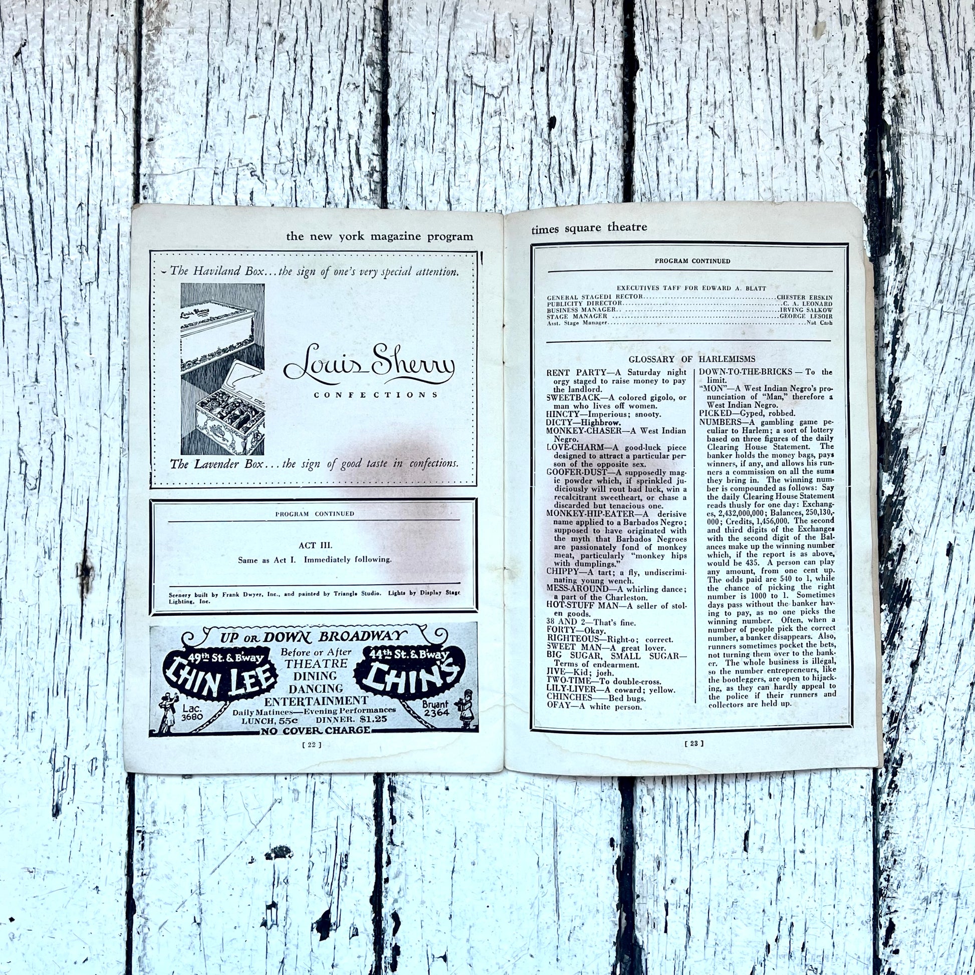 The advertisements, “Harlemisms” and other fancies of the time are captured in this playbill to charming, at times comic, effect. We’ll let the pages do the talking!