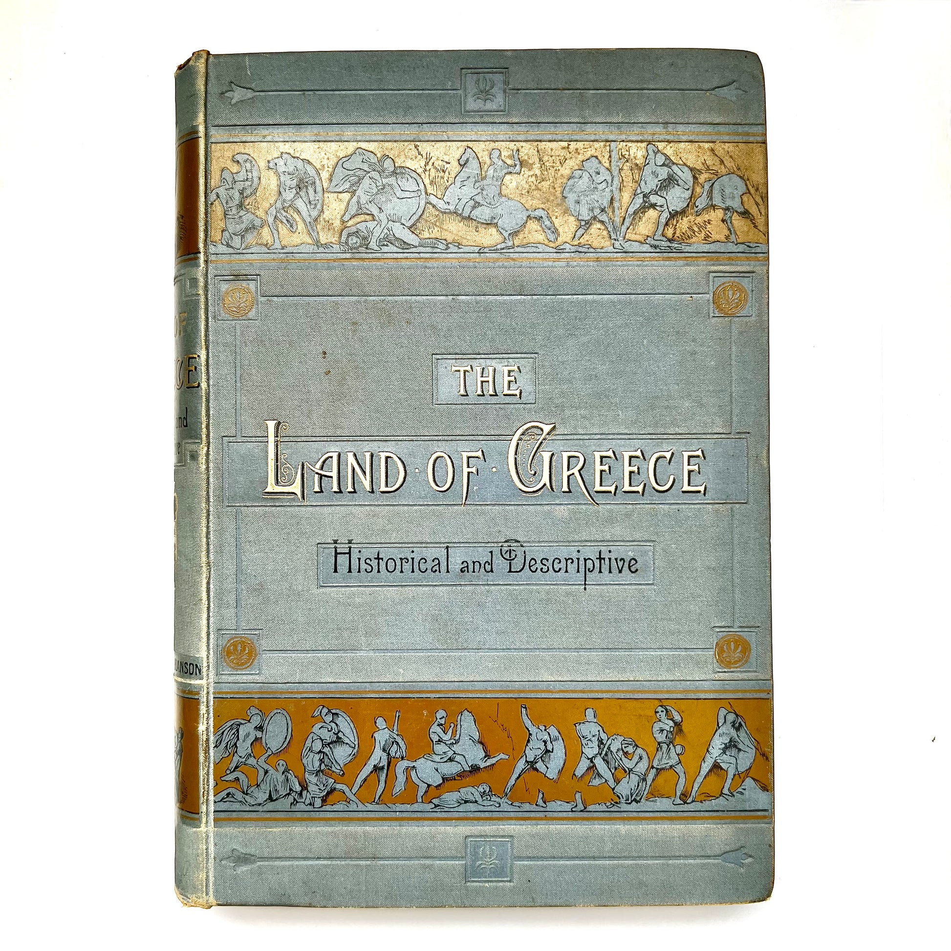 A very handsome antiquarian late 19th century volume on Greece’s history and geography, this 1st edition of “The Land Of Greece Described And Illustrated’ by Charles Henry Hanson. The first edition has gilt details to the title, spine and leaves which in this particular example remain bright. Illustrations inspired by Greek history to the cover, in bands of beautiful gilt bronze background.