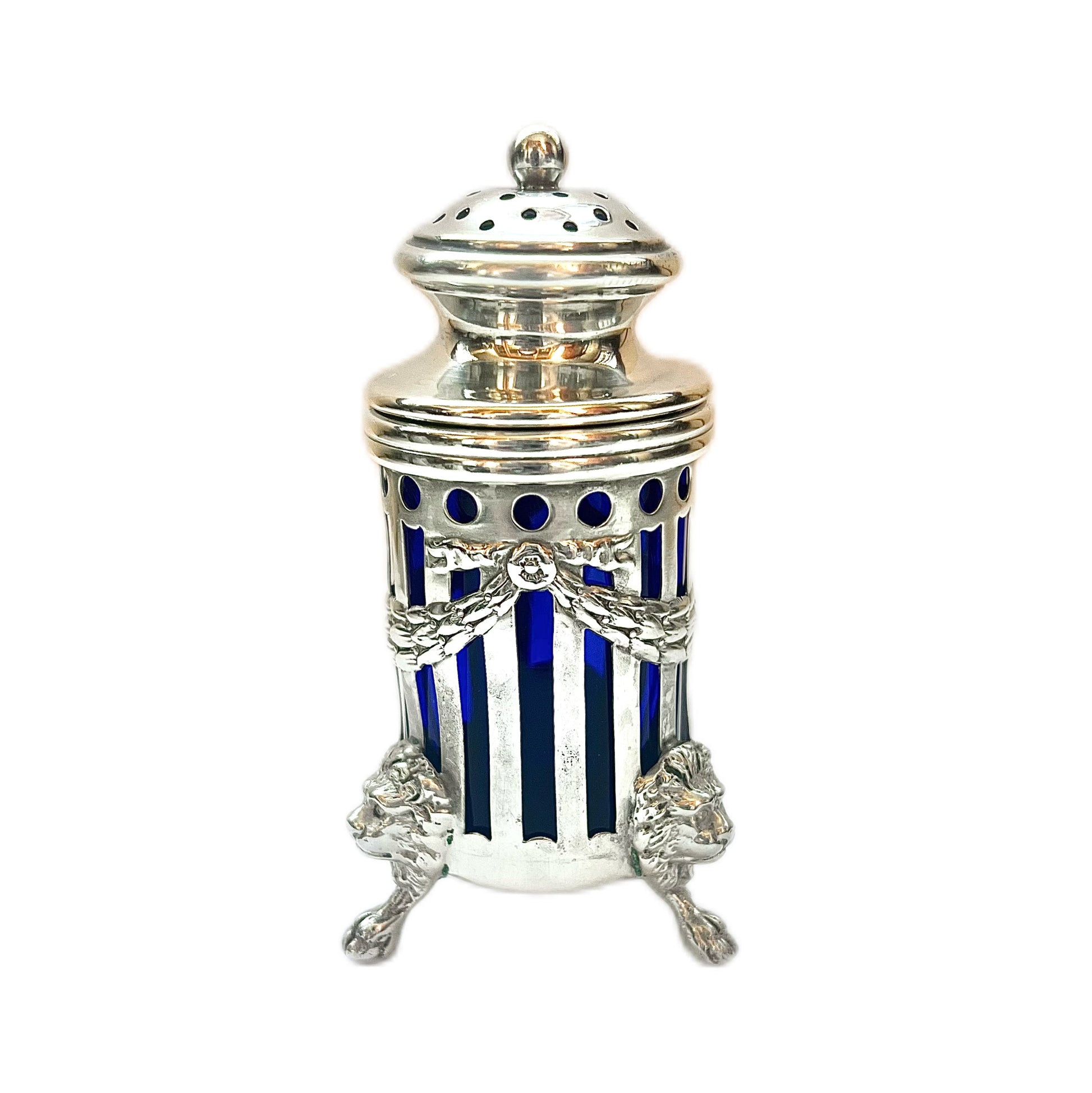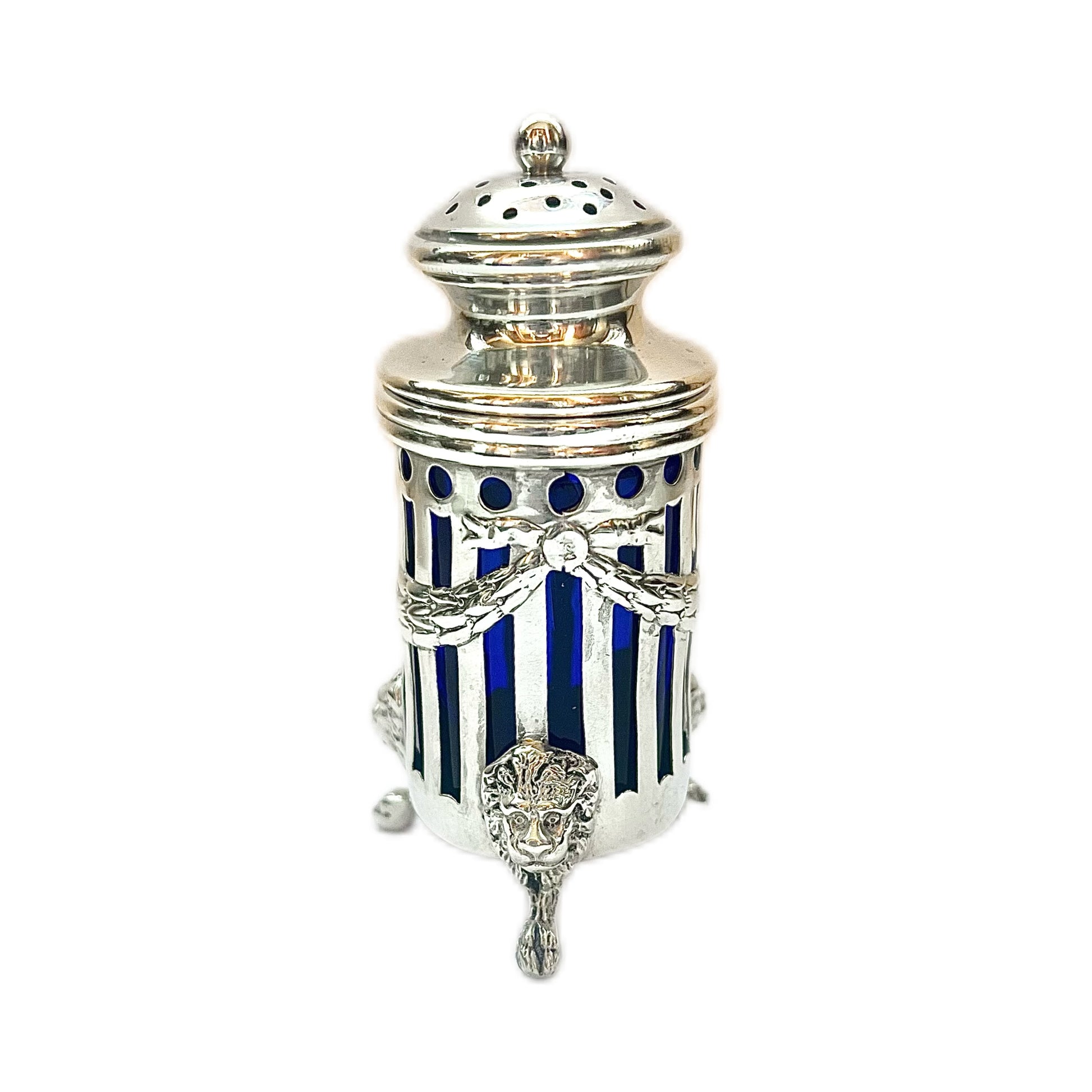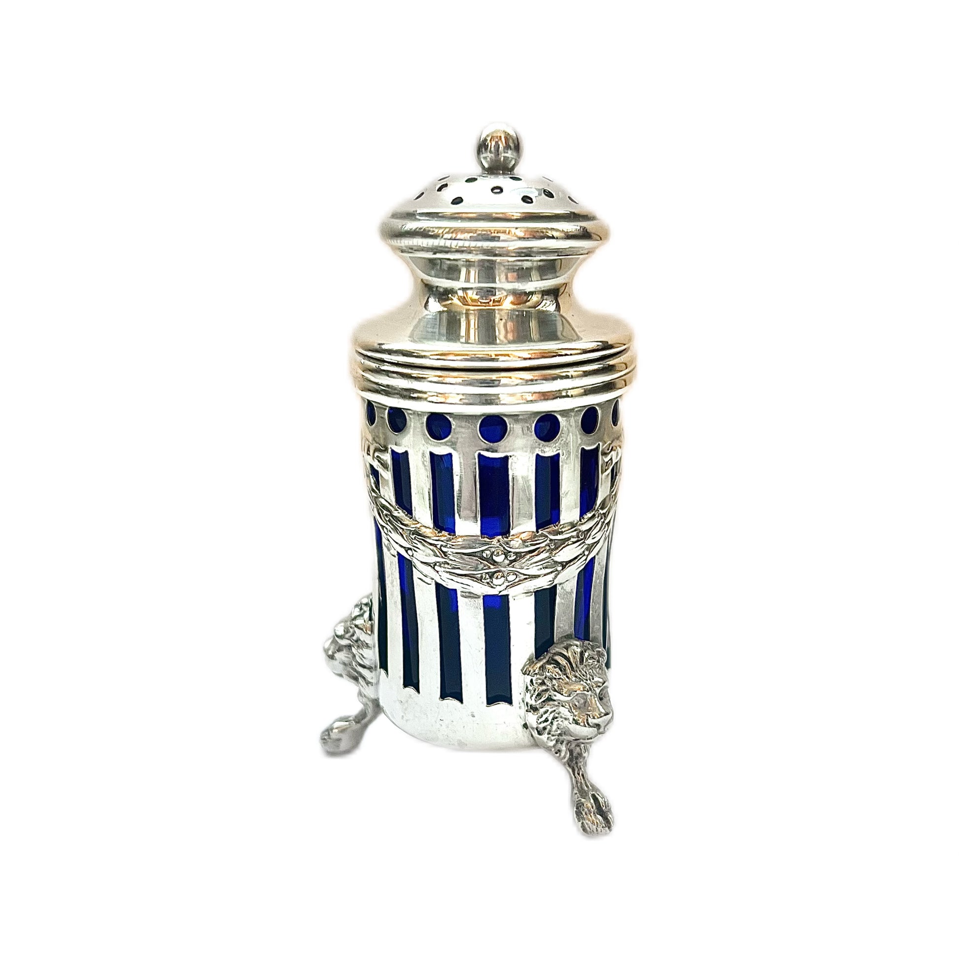 Lovely antique sterling silver pepperette with cobalt glass liner, with marks for Graff Washbourne and Dunn, New York silversmiths who were active from 1899 to 1961. This would have been made during the start of their partnership and is well cast and of thick gauge. A quality piece and an excellent example of Gilded Age American silver.