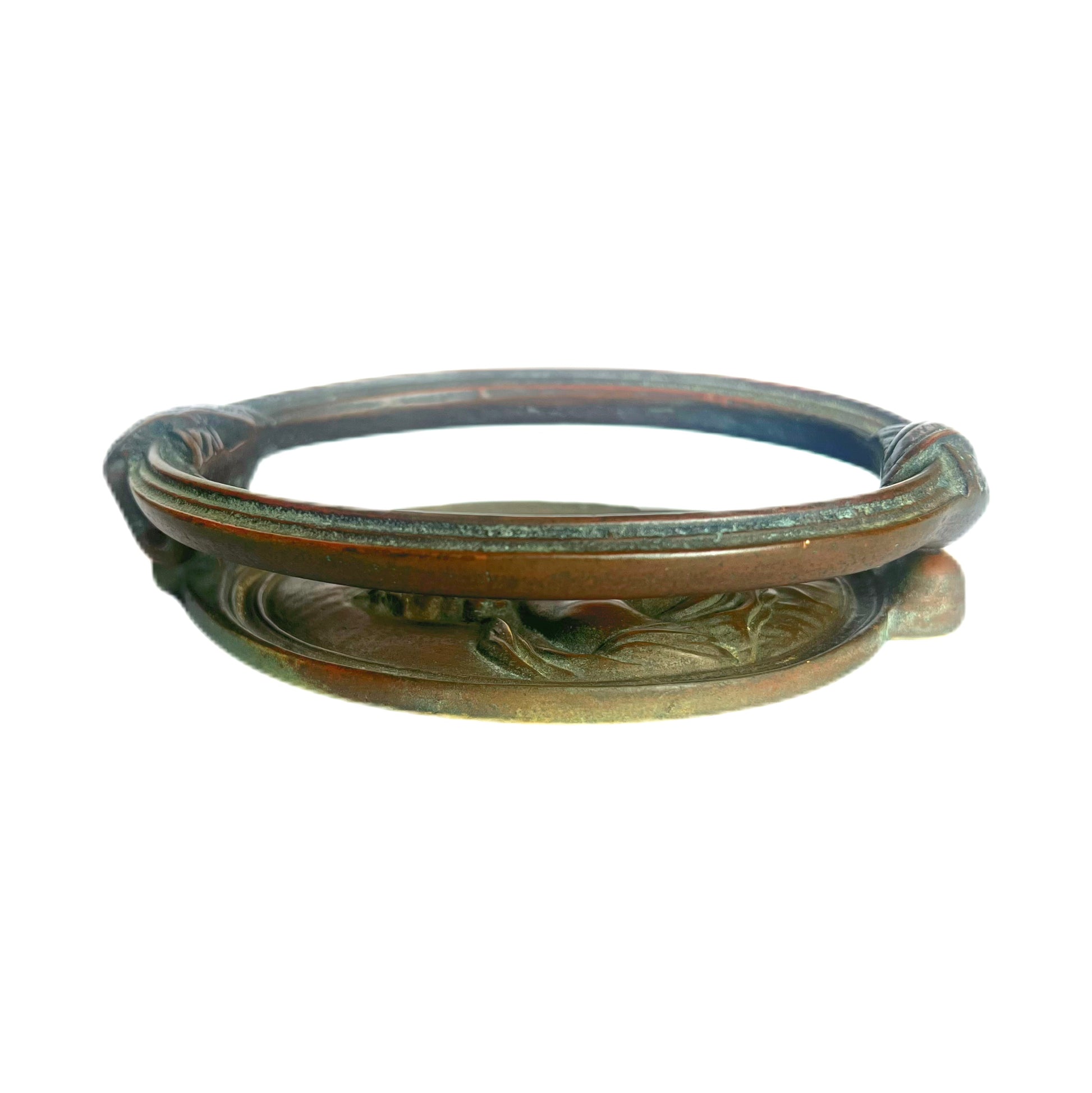 Antique bronze neo-classical door knocker depicting a Greek goddess, possibly Hebe, goddess of youth and first cupbearer to the gods. Elegantly made, this would be a beautiful addition to any home.
