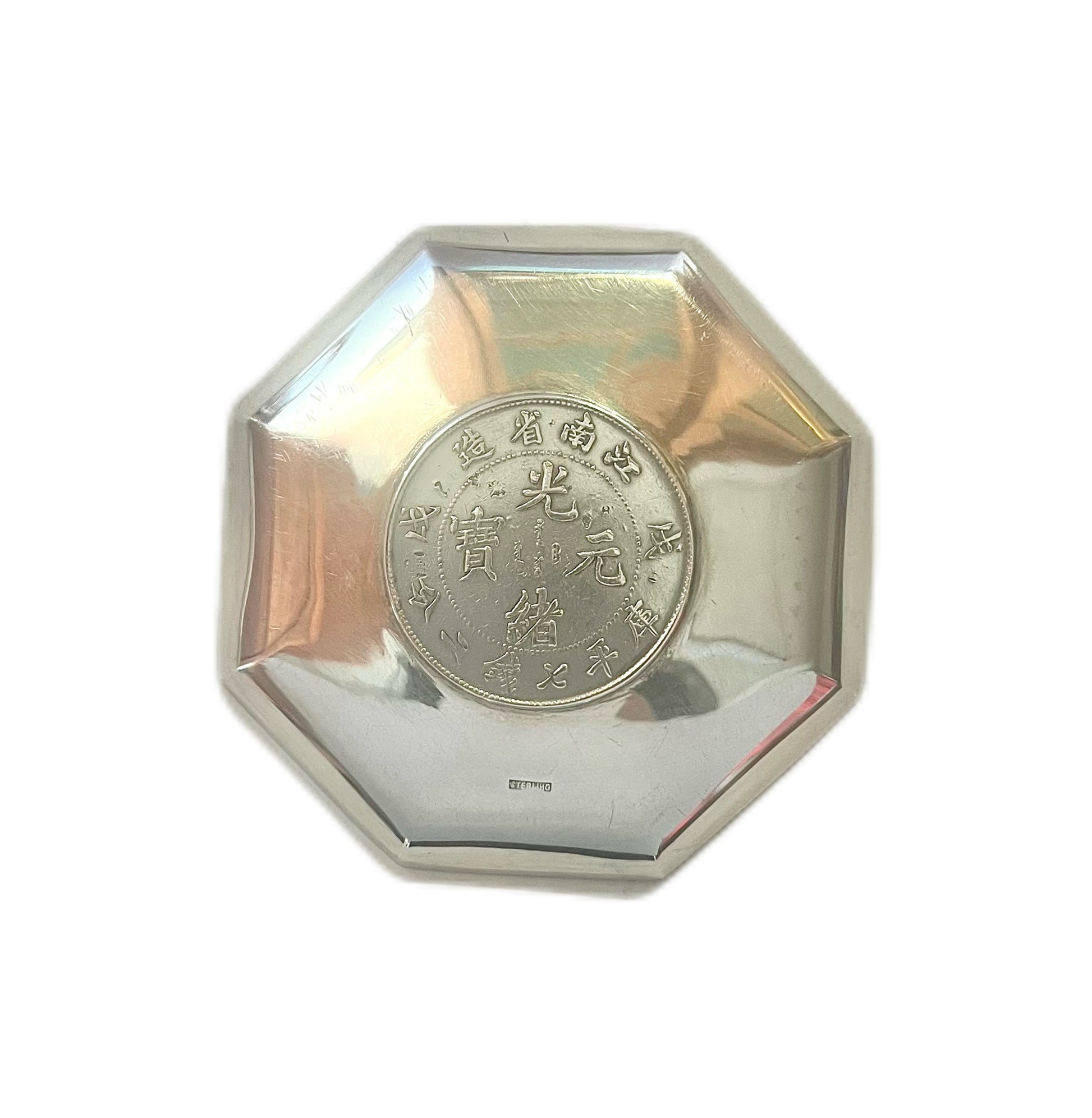 Antique Chinese export silver trinket dish with Guangxu Period Jiang nan (Kiang Nan) 7 Mace 2 Candareen coin
