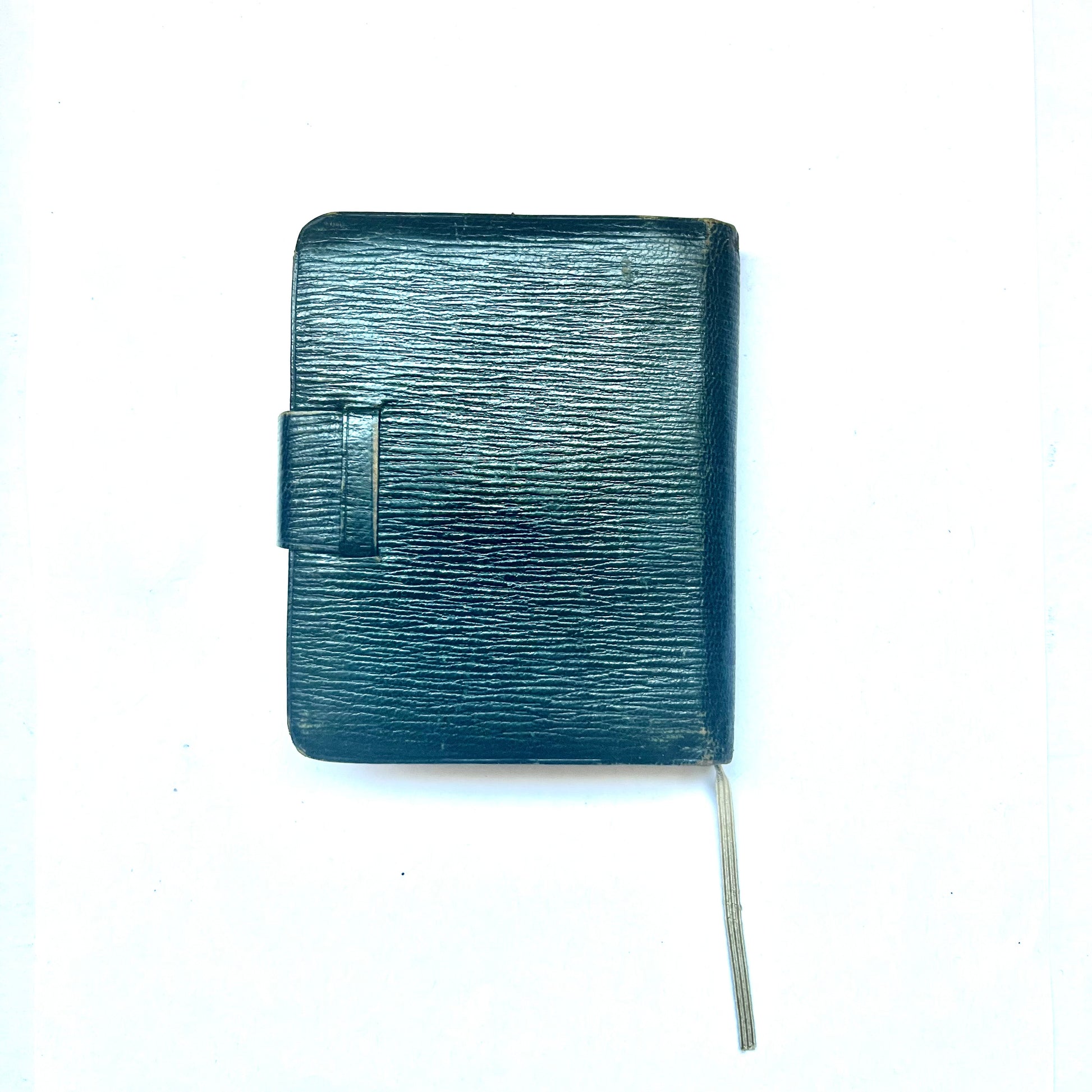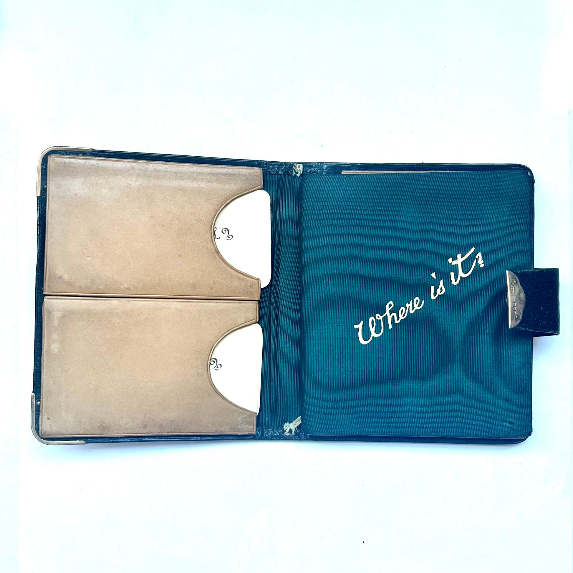 Beautifully made and bound in black leather, within are handsome beige leather card compartments with the original owner’s calling cards still within, but the little address book itself is in good unused condition, with lovely gilt edges and the pages within blank. Charmingly inscribed “Where is It?” to the interior book cover.