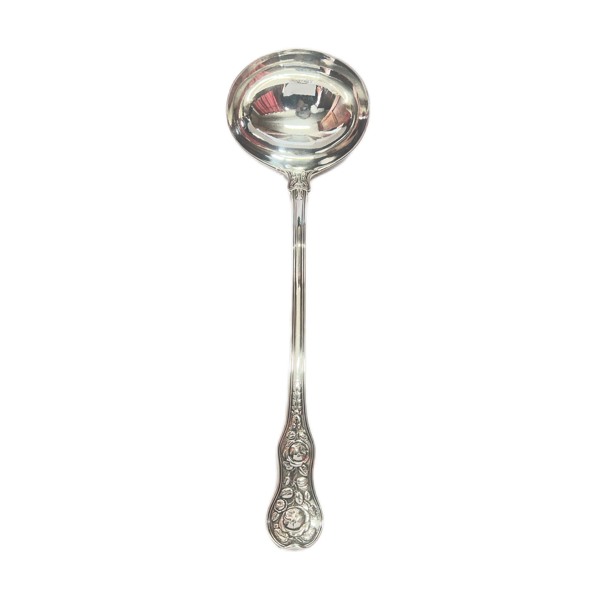 Antique George III sterling silver crested Rose Pattern ladle with marks for London, 1819. The crest, whilst rubbed, depicts a lion rampant. Whilst the sponsor mark is rubbed, this ladle is of exceptional quality, being substantial and of thick gauge with double-struck Rose Pattern to handles, as well as scalloped motifs to the bowl.