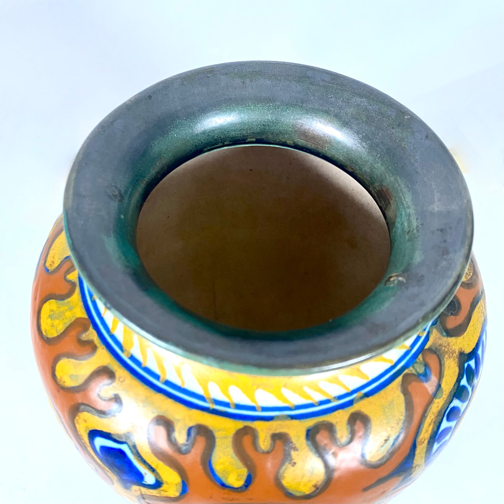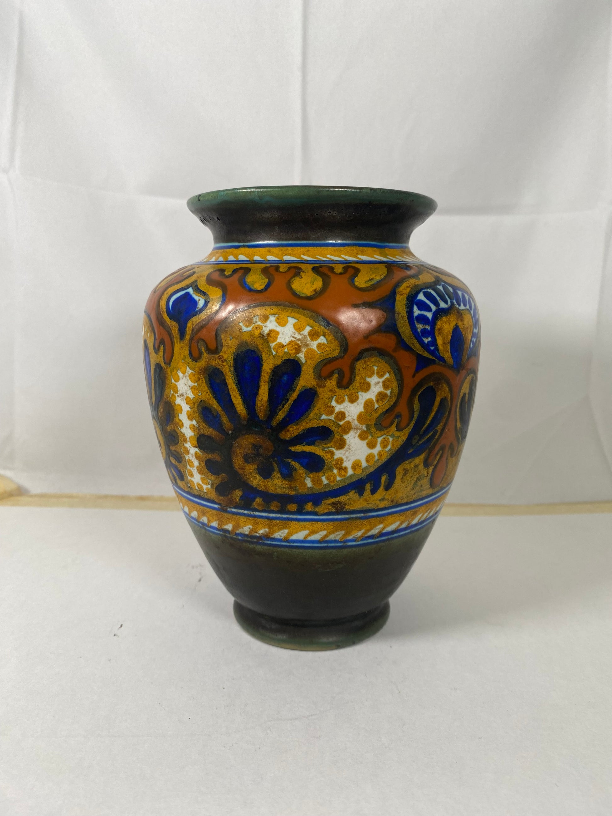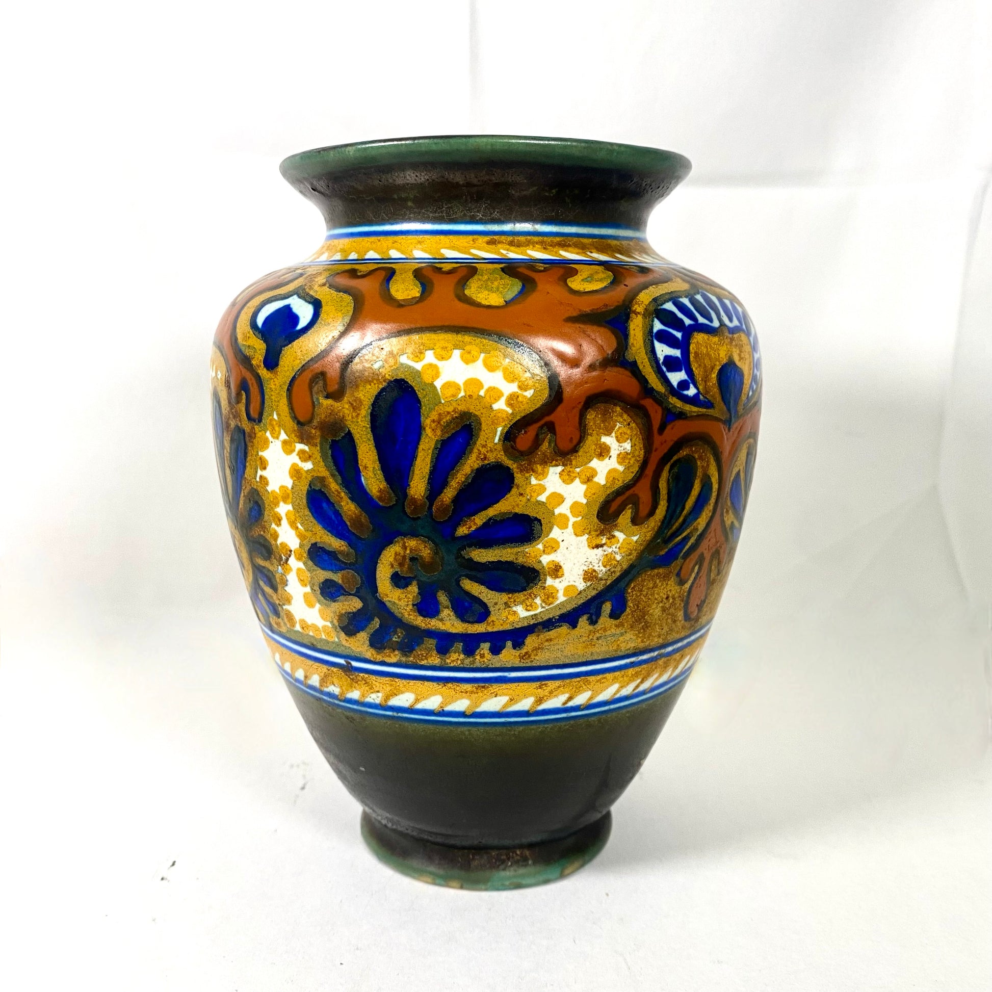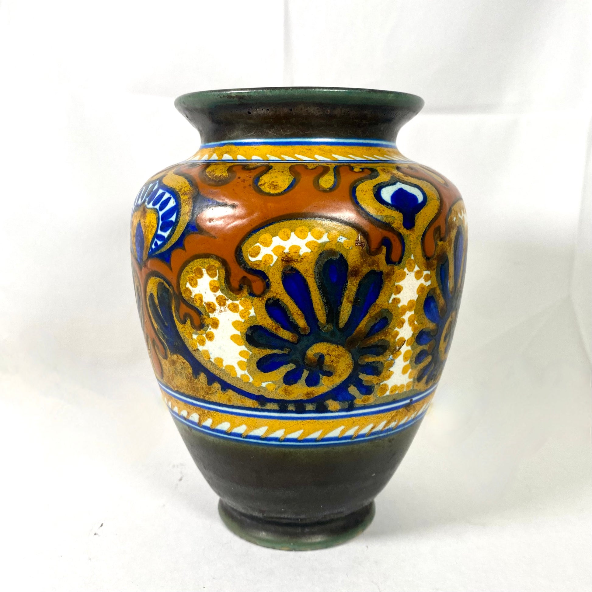 This antique Gouda Art Deco vase is a lovely examples we have seen from the renowned Dutch Art Pottery PZH factory. Made in their main PZH factory circa 1920s to 1930s, this classic Rhodian pattern is a quintessential Art Deco style. In a stylised floral pattern, this has been hand-painted with vibrant jewel tones strongly influenced by Orientalism and the Jugendstil movement.