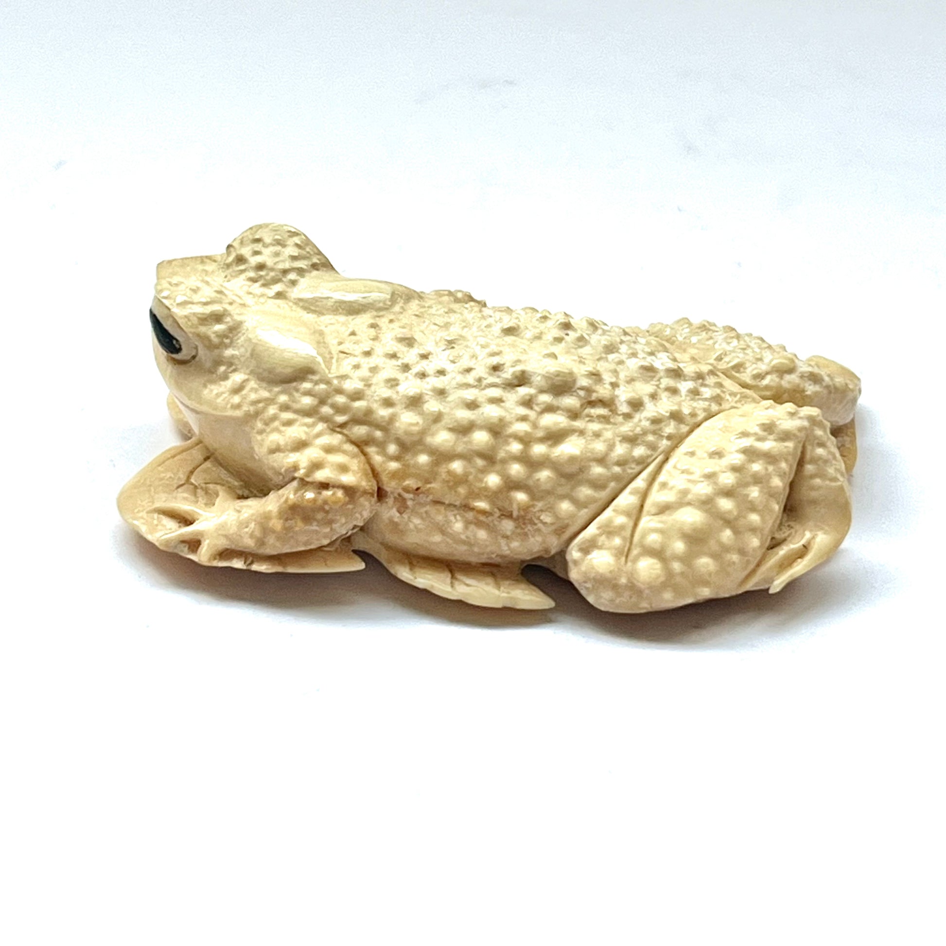 A beautiful antique Japanese ivory okimono depicting a toad upon a leaf circa mid-Meiji Period (late 19th century). Beautifully carved with skin texture and its anatomical details carefully depicted. Unsigned but clearly made by a skilled maker, with the leaf lightly tea-stained to juxtapose with the toad.