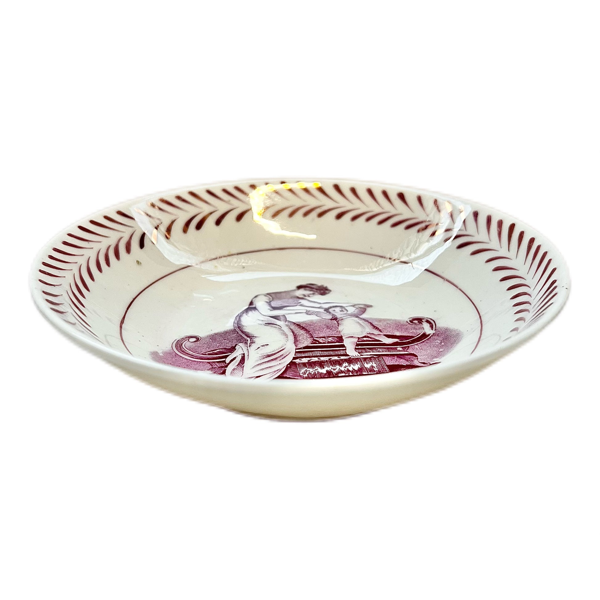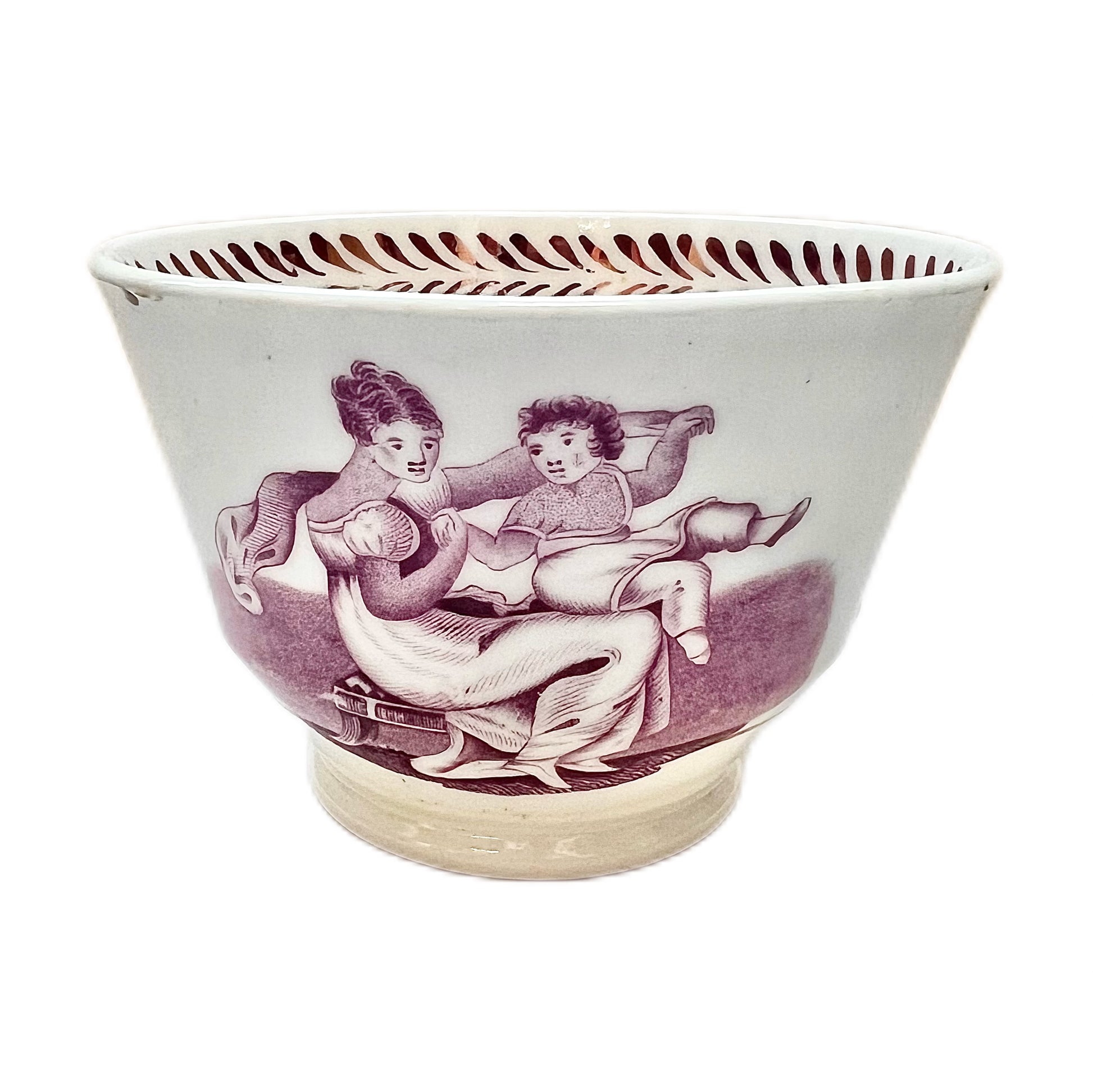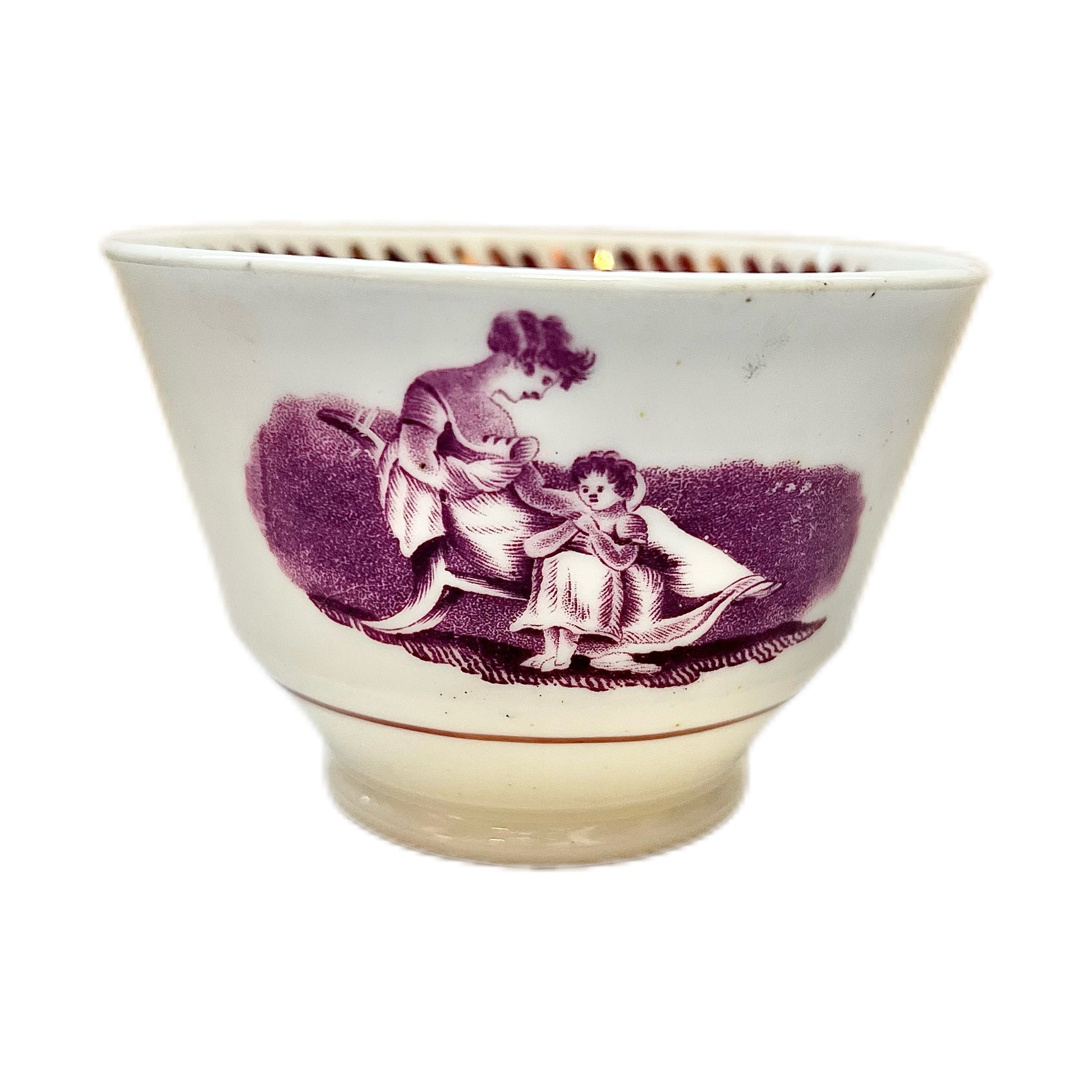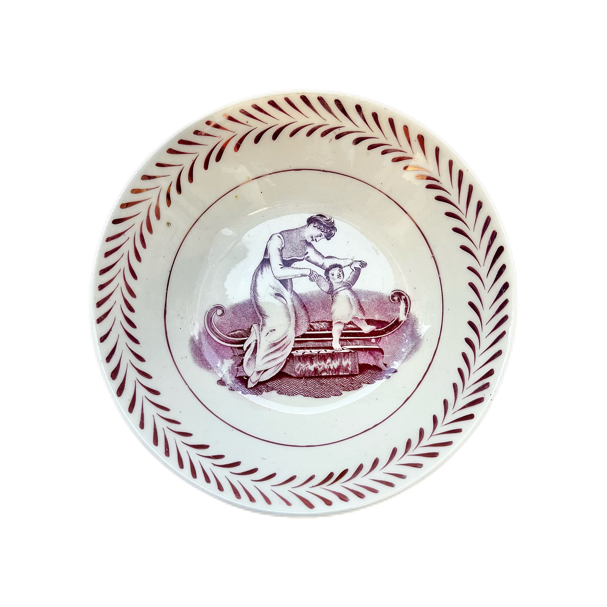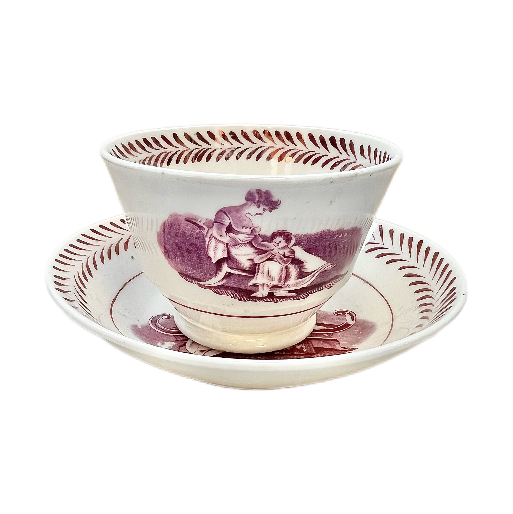A beautiful early 19th century Miles Mason English tea bowl and matching saucer circa 1810 with “bat” print scenes of mother and child. Miles Mason was active at the Delphi works at Stoke-upon-Trent from 1806 to 1811, making this a rare and collectible piece.