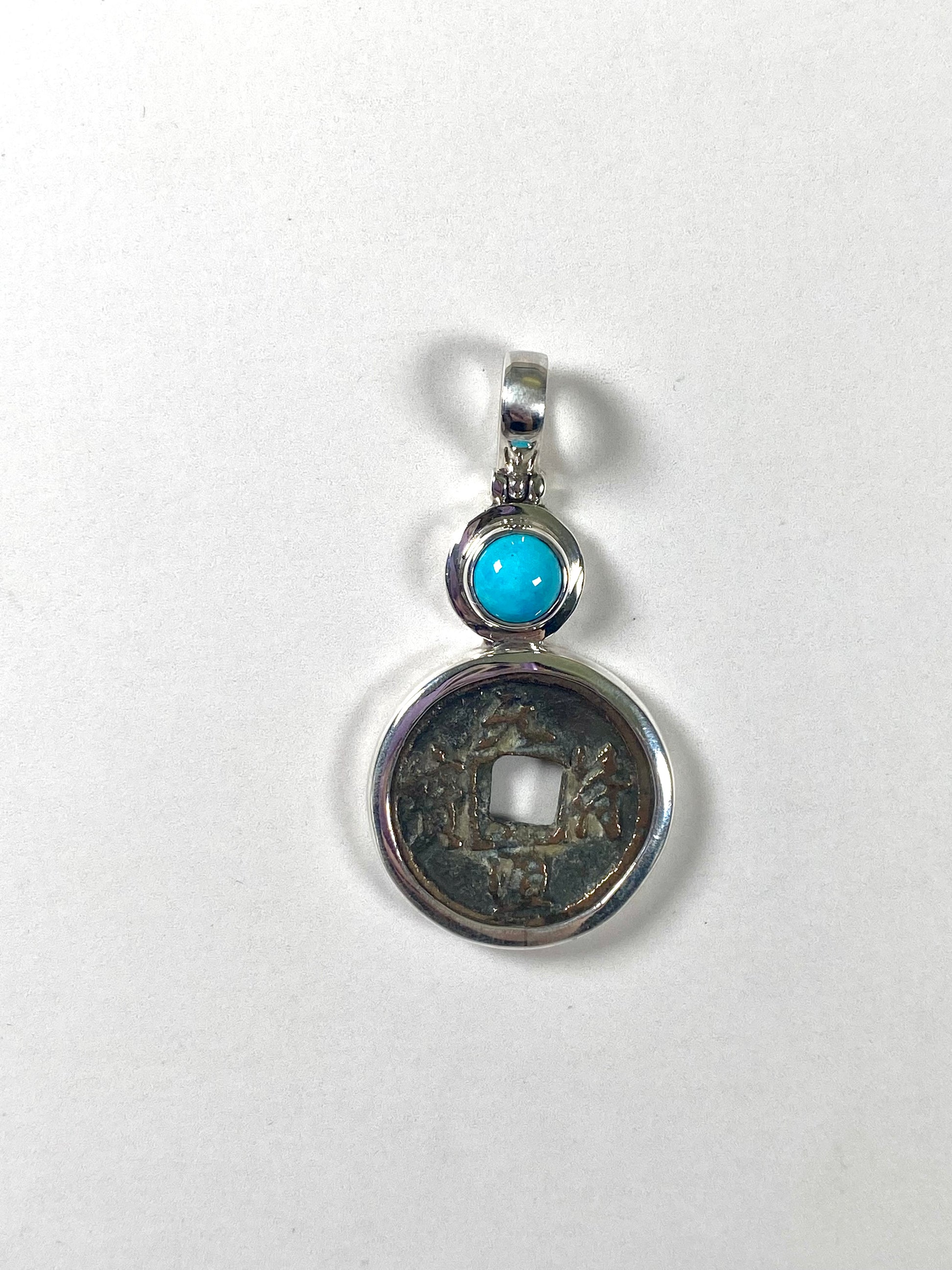 Antique Northern Song Shenzong Reign Cash Coin Pendant- Sterling Silver w Turquoise circa 1078-1085