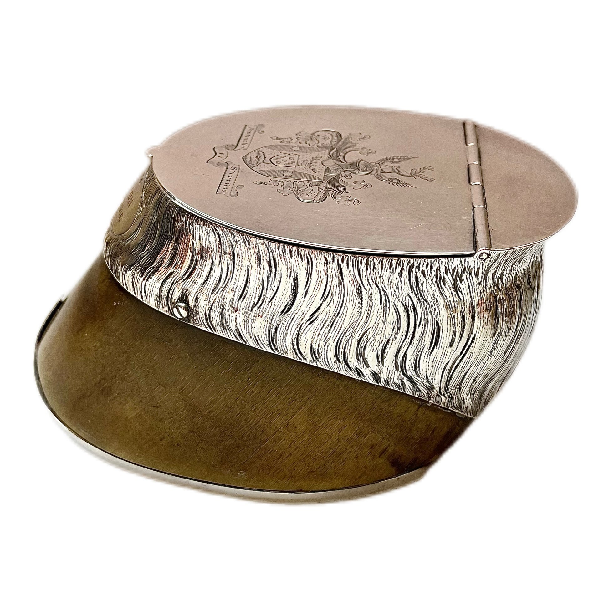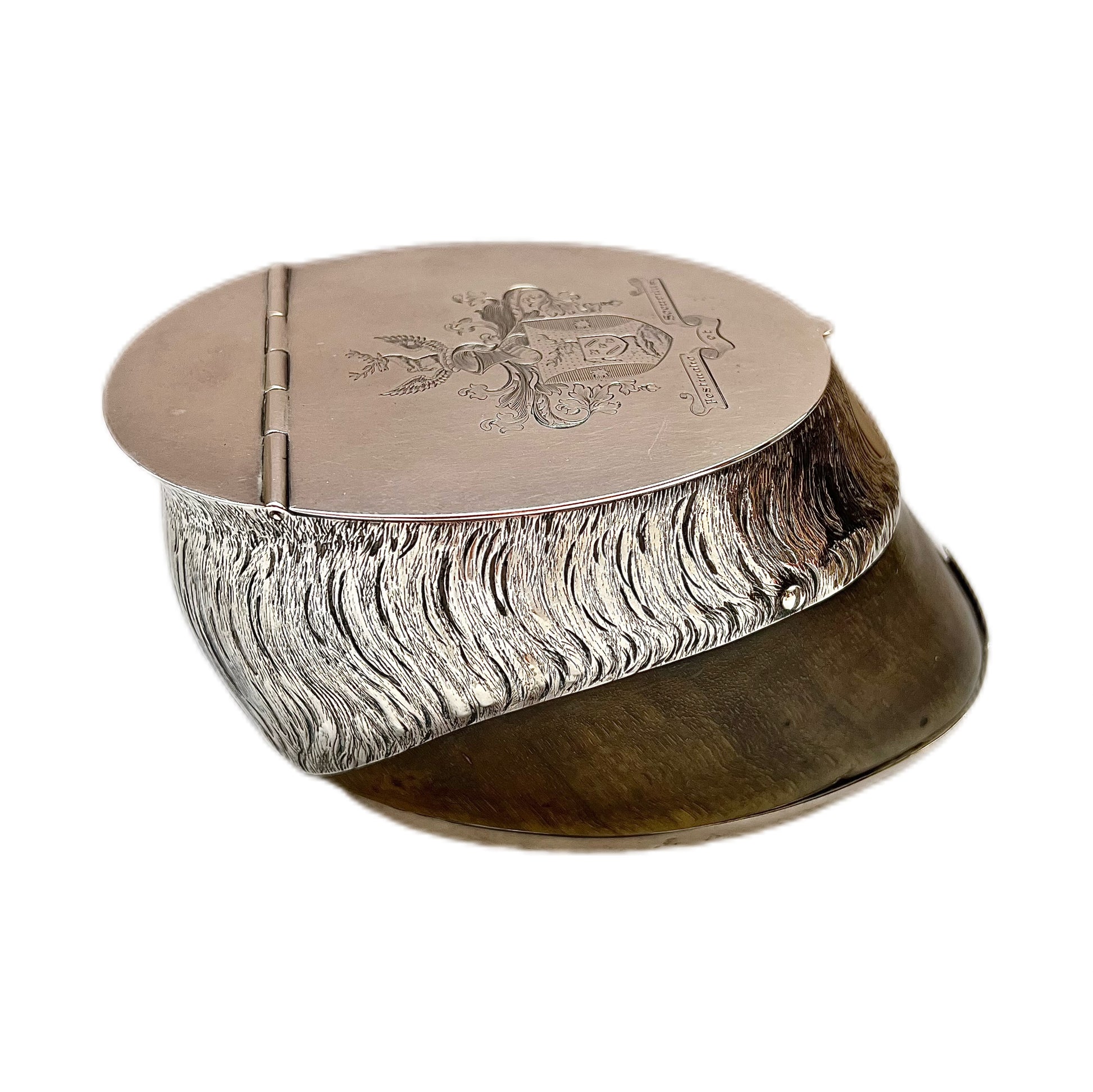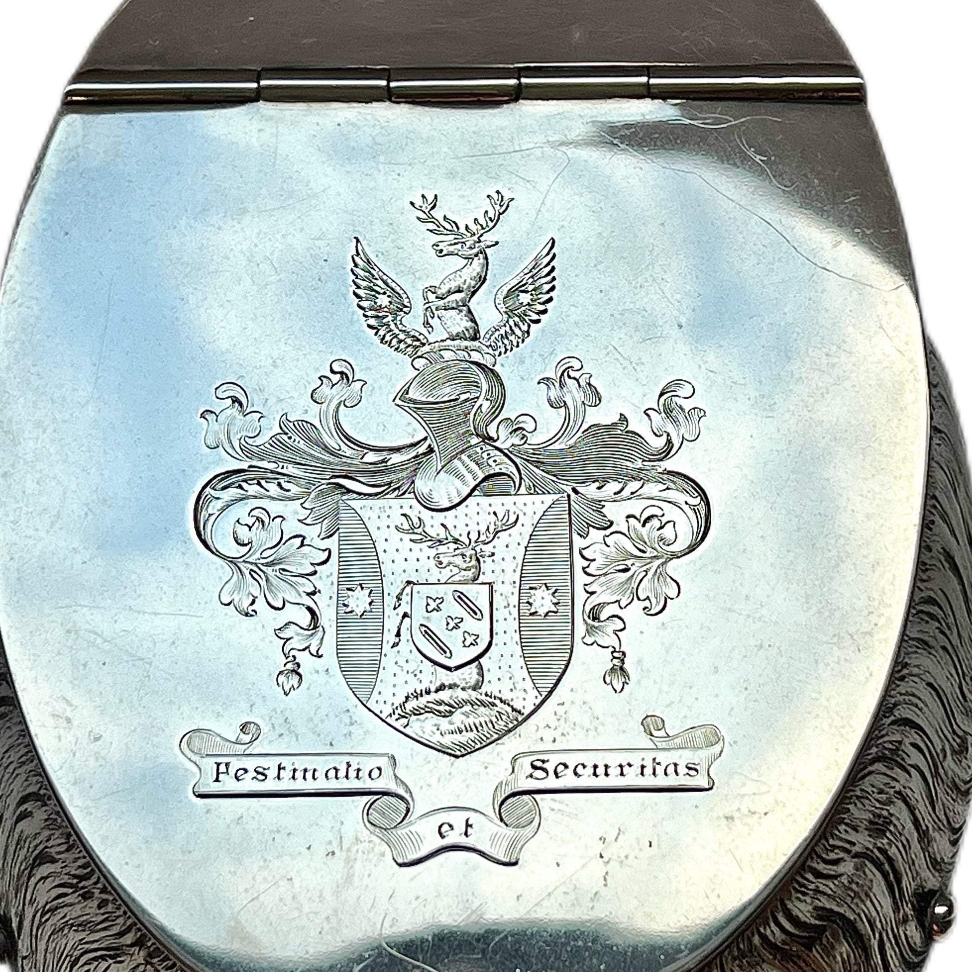 The top is beautifully engraved with a crest depicting a Demi-stag rampant arising from a winged helm. The family motto “Festinatio et Securitas” which loosely translates as “Swiftness and Safety”, a wonderful motto for a racehorse.
