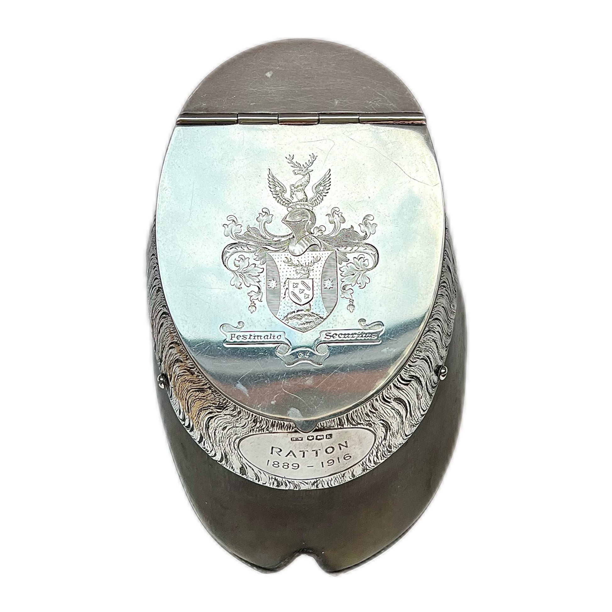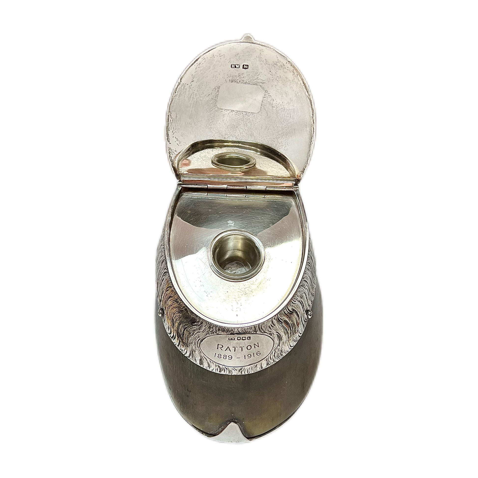 Antique rare sterling silver racehorse hoof "Ratton" inkwell with original glass liner, Sheffield, 1927, Henry Wigfull