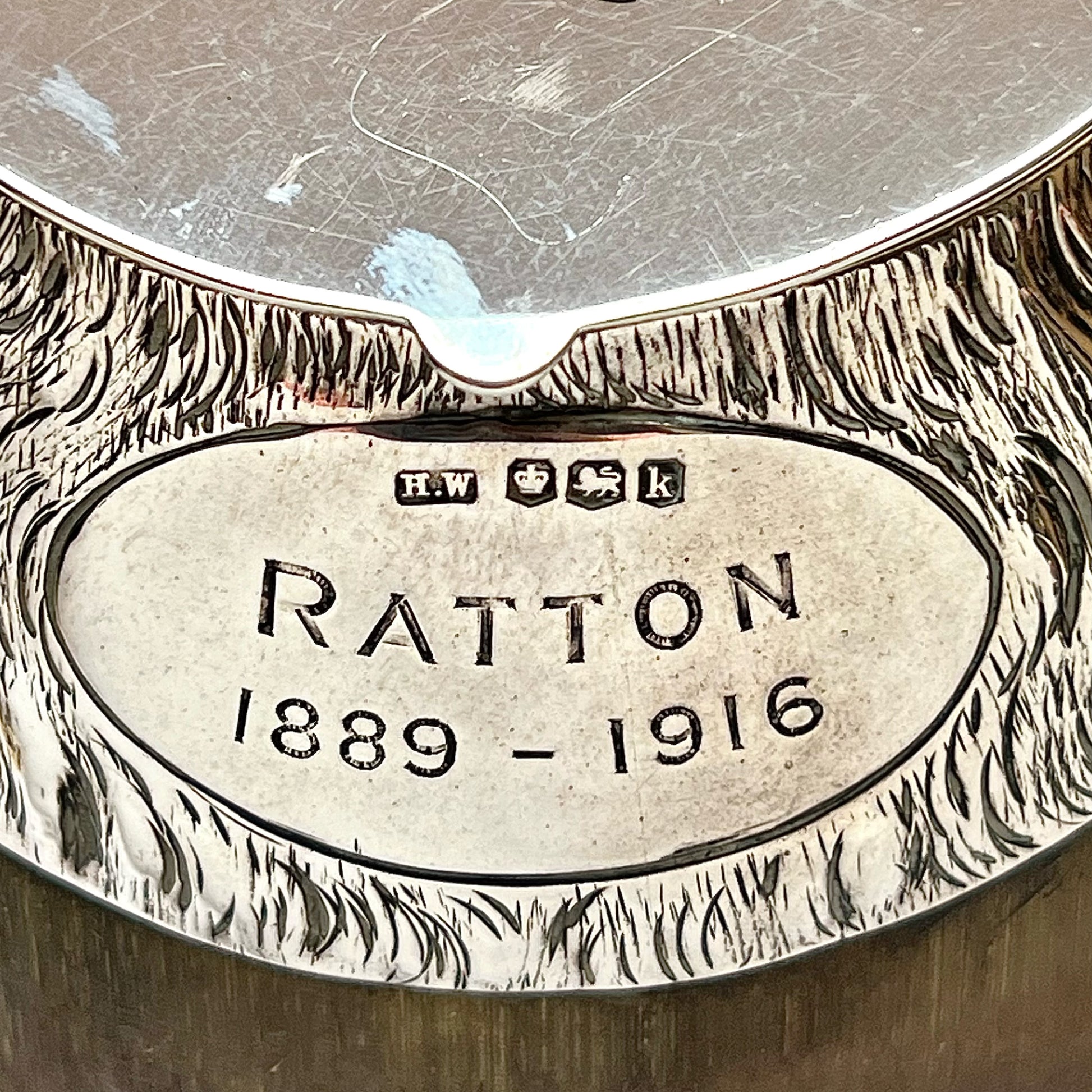 Inscription for “Ratton // 1889-1916”. Based upon our initial research on the associated horse and crest, Ratton was a racehorse owned by Mr. AG Bonsor that raced in the All Aged Stakes in 1893, the latter of which is now known as the Diamond Jubilee Stakes.