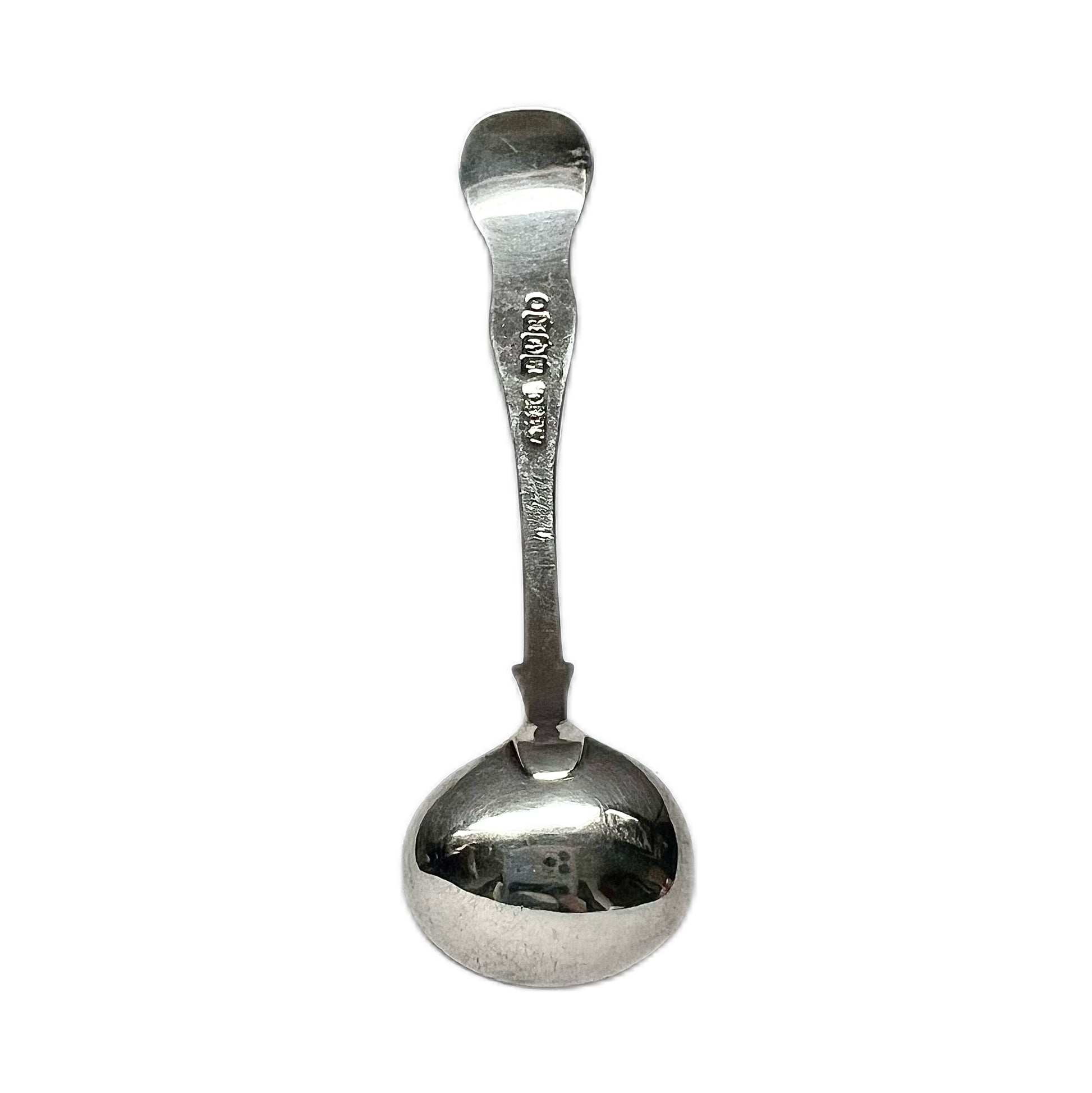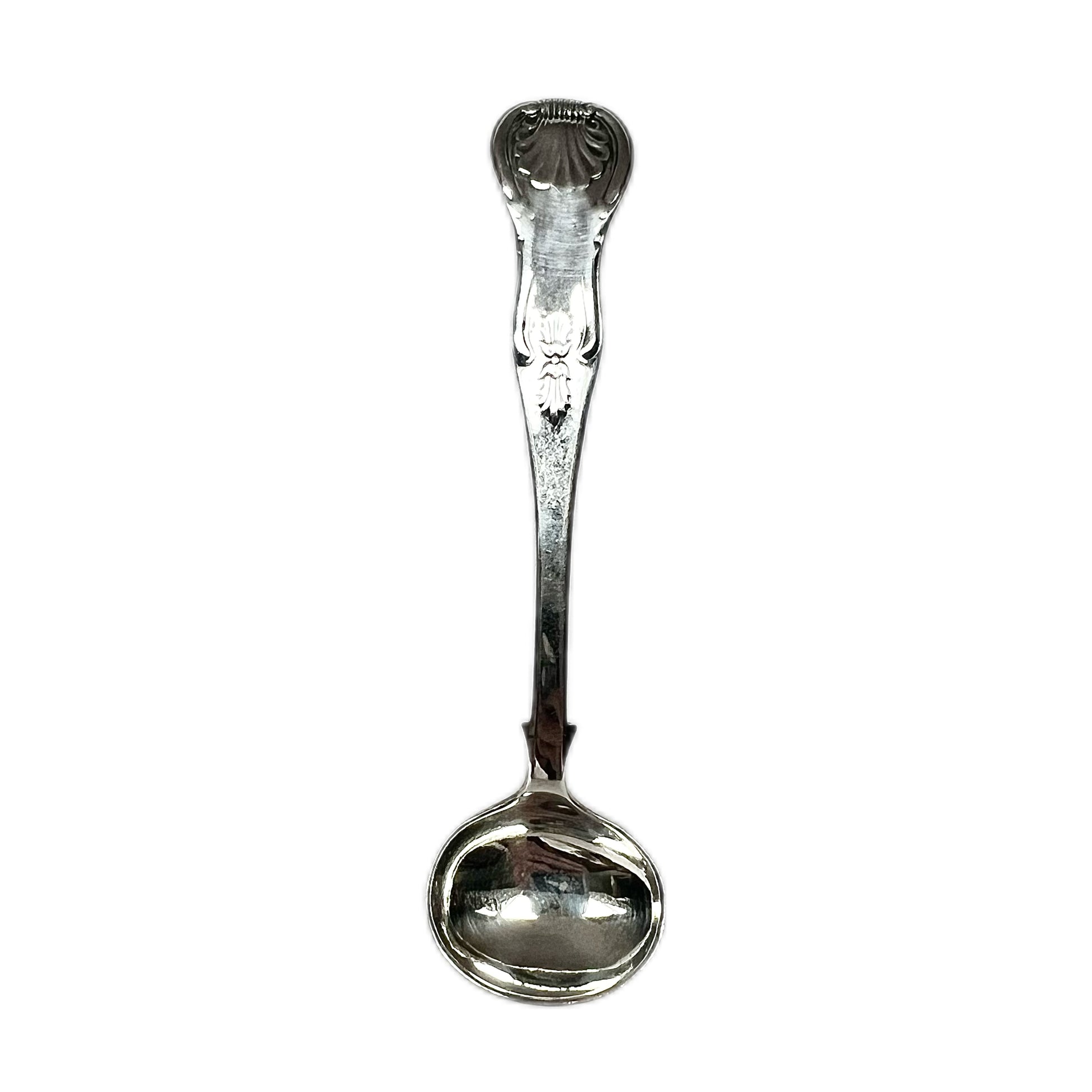 Antique Scottish Victorian sterling silver condiment spoon with marks for Edinburgh, 1848, AM & Co. Active from 1837 to 1884, this firm was possibly Adam Mossman & Co. but remains formally “unidentified” by the Ediburgh Incoporation of Goldsmiths.