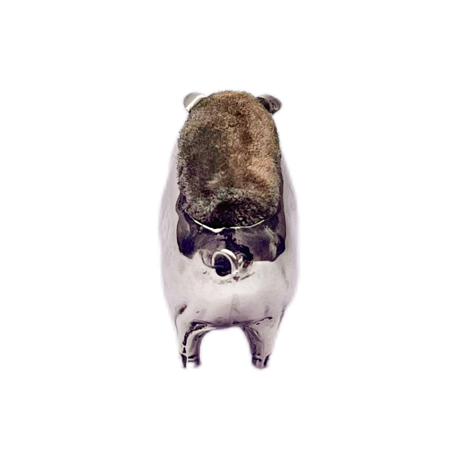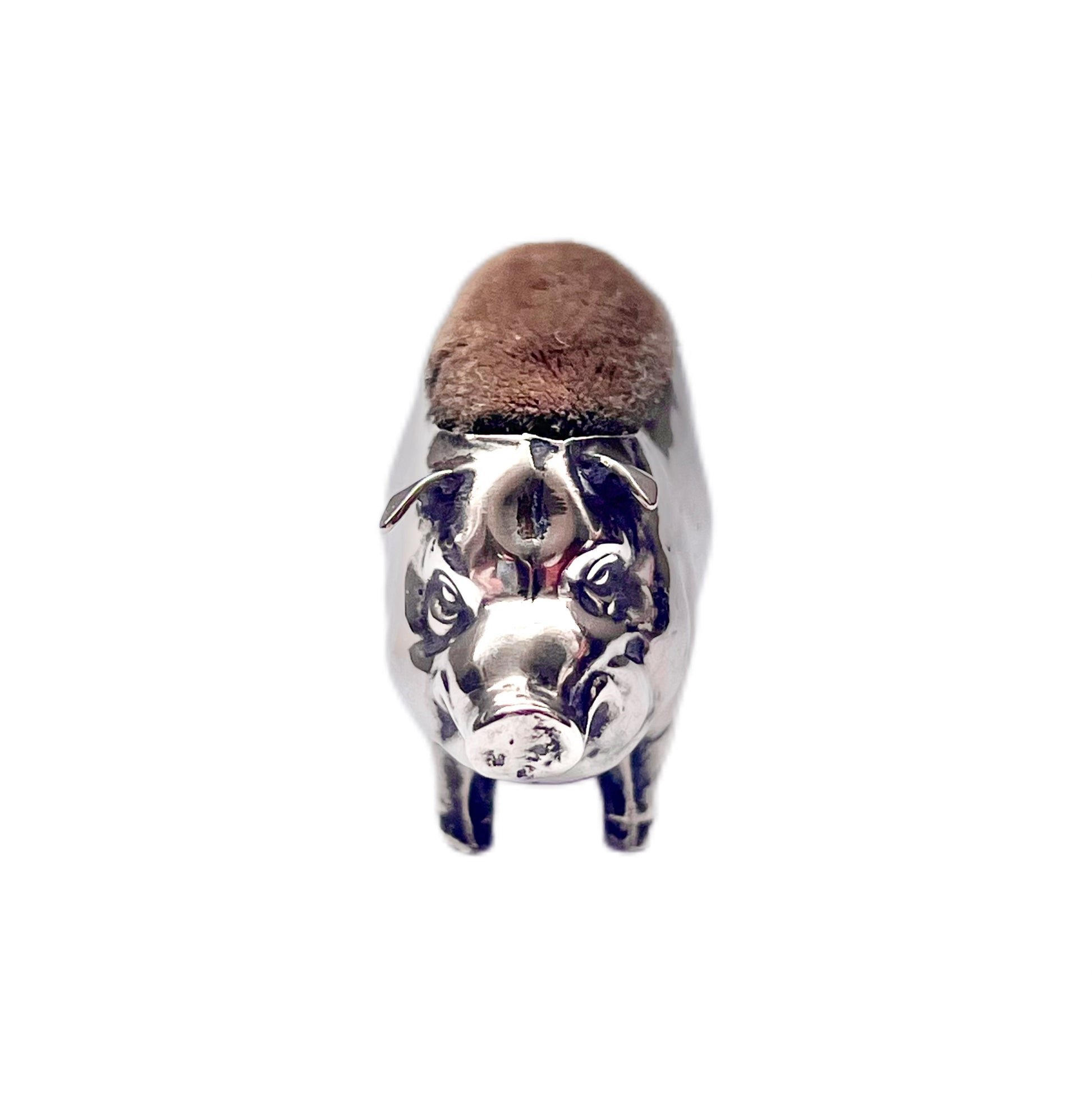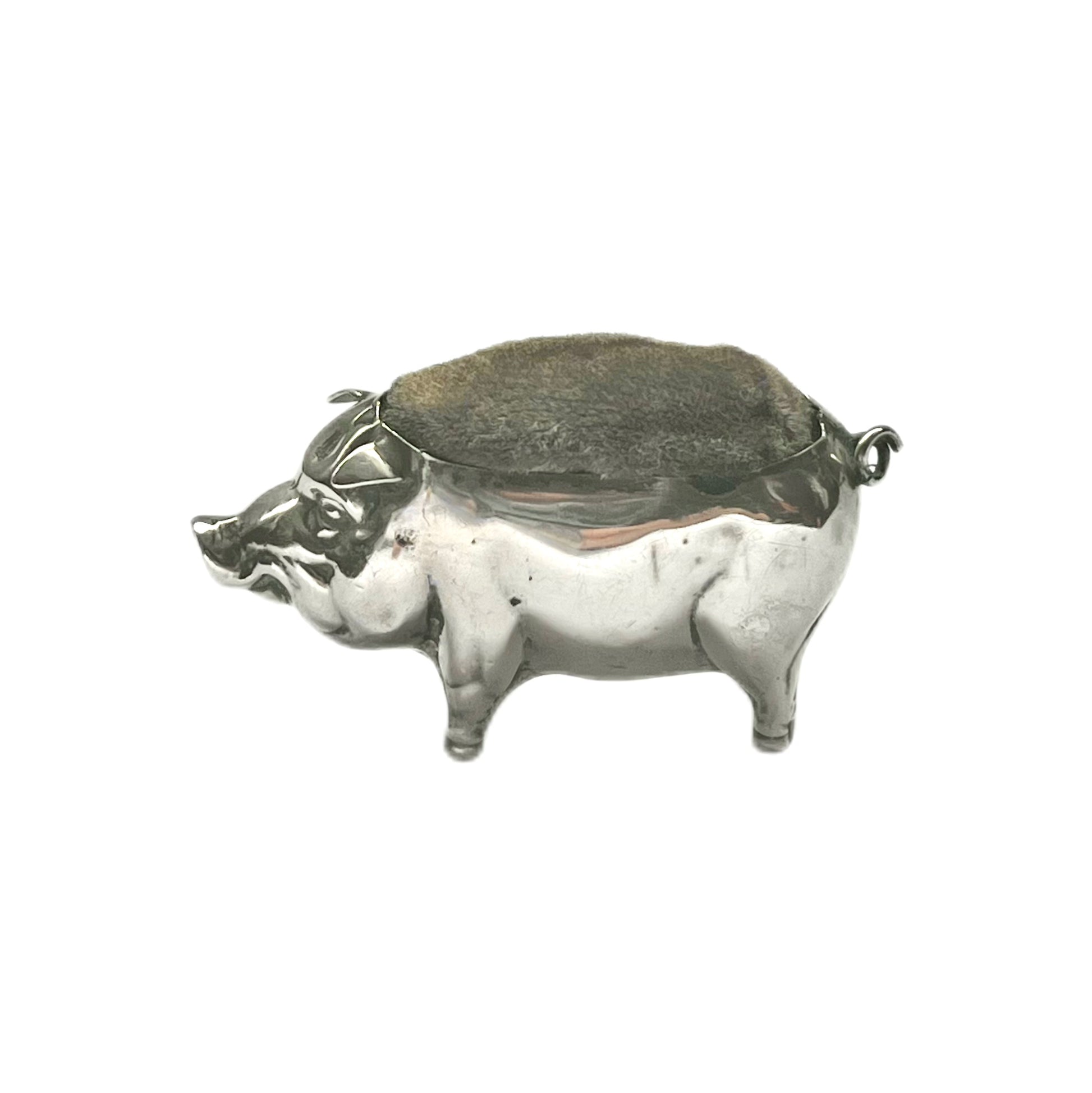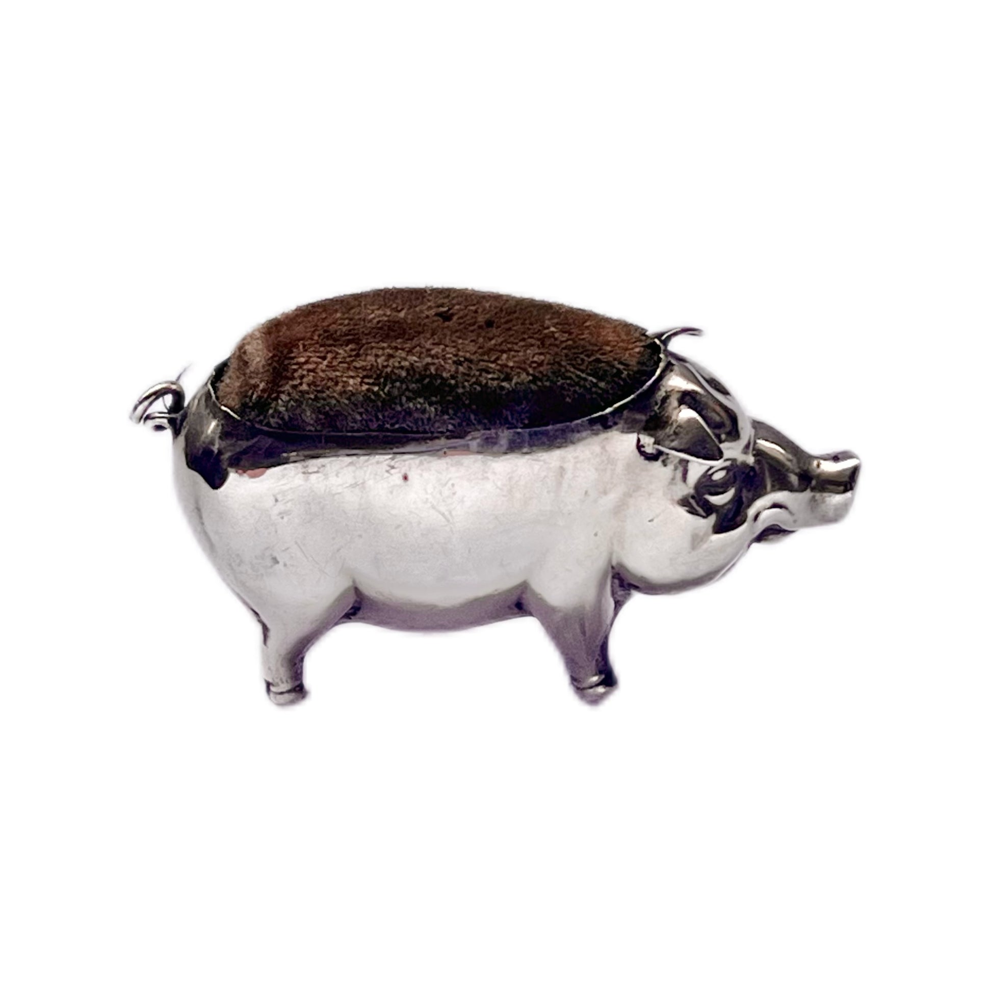 A charming antique sterling silver pig pincushion with assay marks for E.C, Birmingham 1907.
