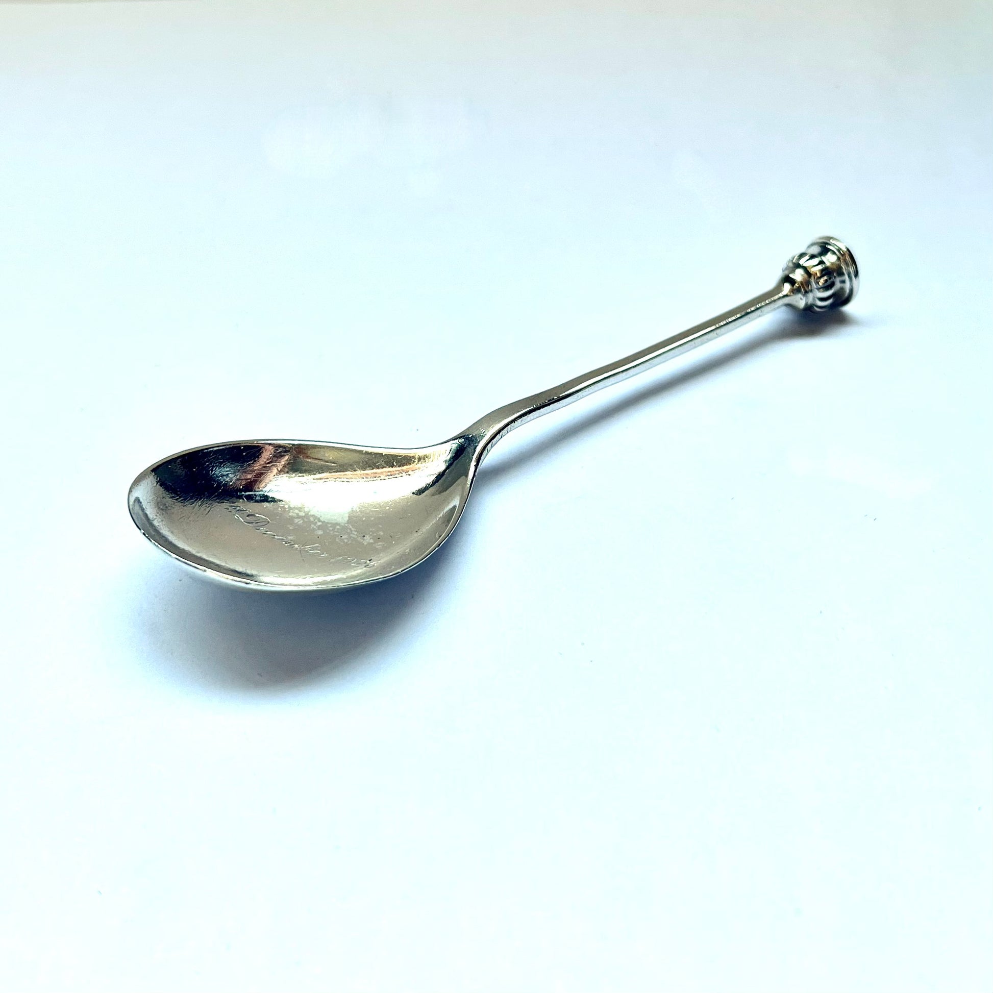 A very charming Art Deco George V sterling silver seal-top spoon, marked for F J Ross & Sons (Frederick James Ross), Chester, 1925. With knopped stem and inscription to bowl for December 1926, intitials to the seal top for C Mac A H.