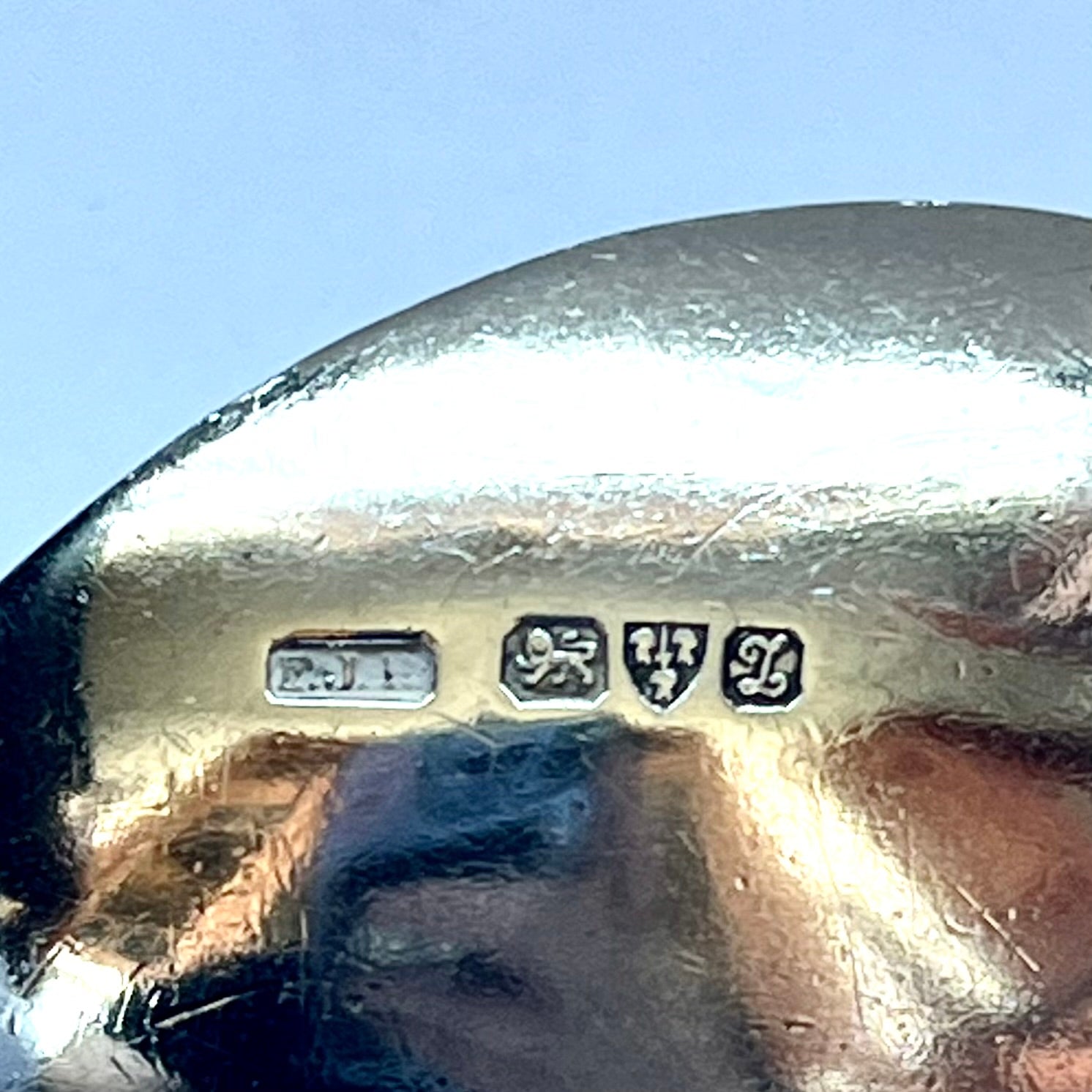 Very good near antique condition. Thick gauge and crisp assay marks, light wear to maker’s mark. Slight bend to stem.