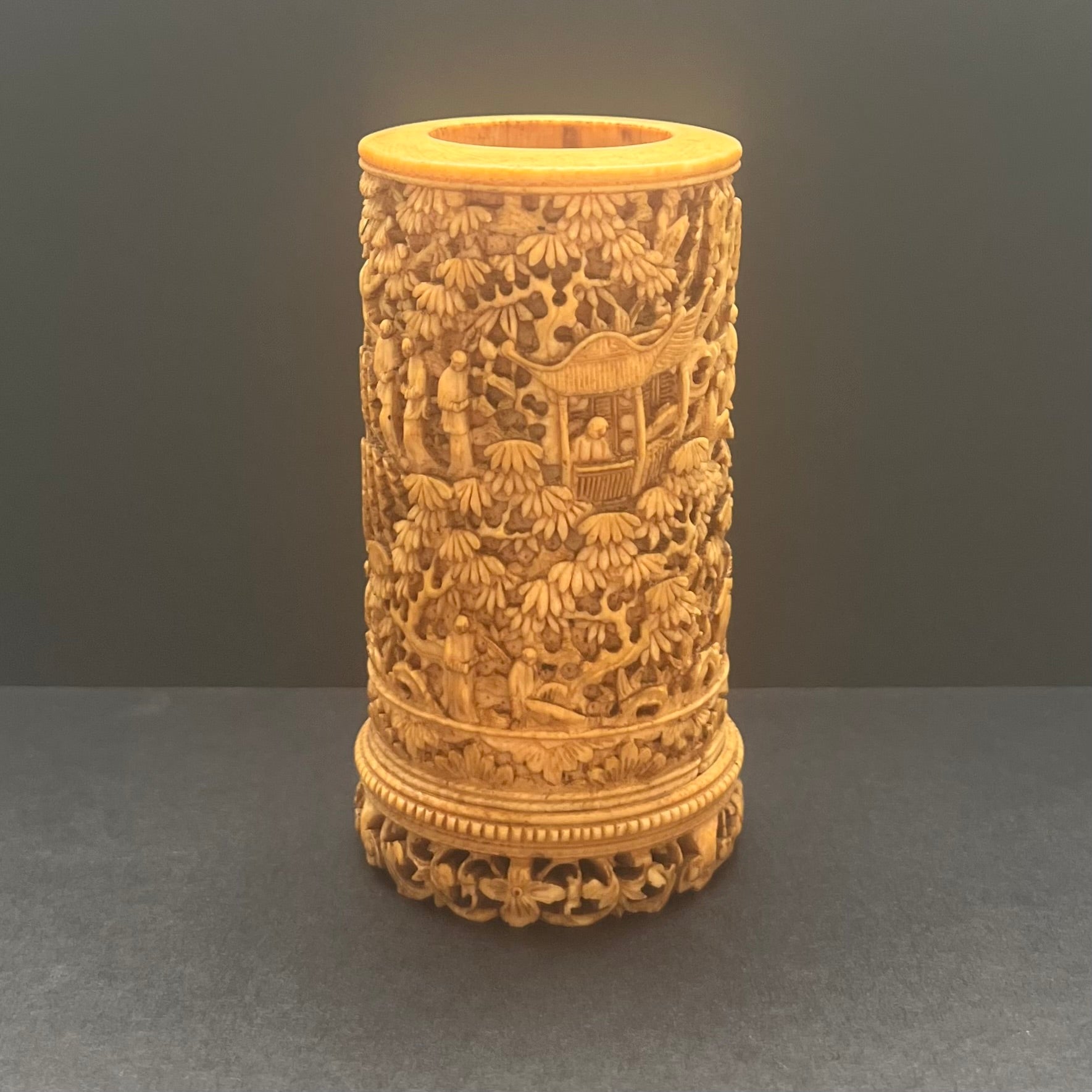 Pictures do not do this piece justice; the entire surface of this piece’s main body, carved from a single large piece of ivory, boasts some of the most detailed work we have seen. The entire exterior is carefully carved with scenes of people conversing, pavilions and more. The composition subtly shows depth of detail; there are both pine trees and willow trees which allows the eye to be naturally drawn to the many tiny details hidden in this brush holder. The people seated in the pavilions can be seen subtly gazing down at the people below, creating an effect of a mountain scene as well as a sense of aesthetic harmony.