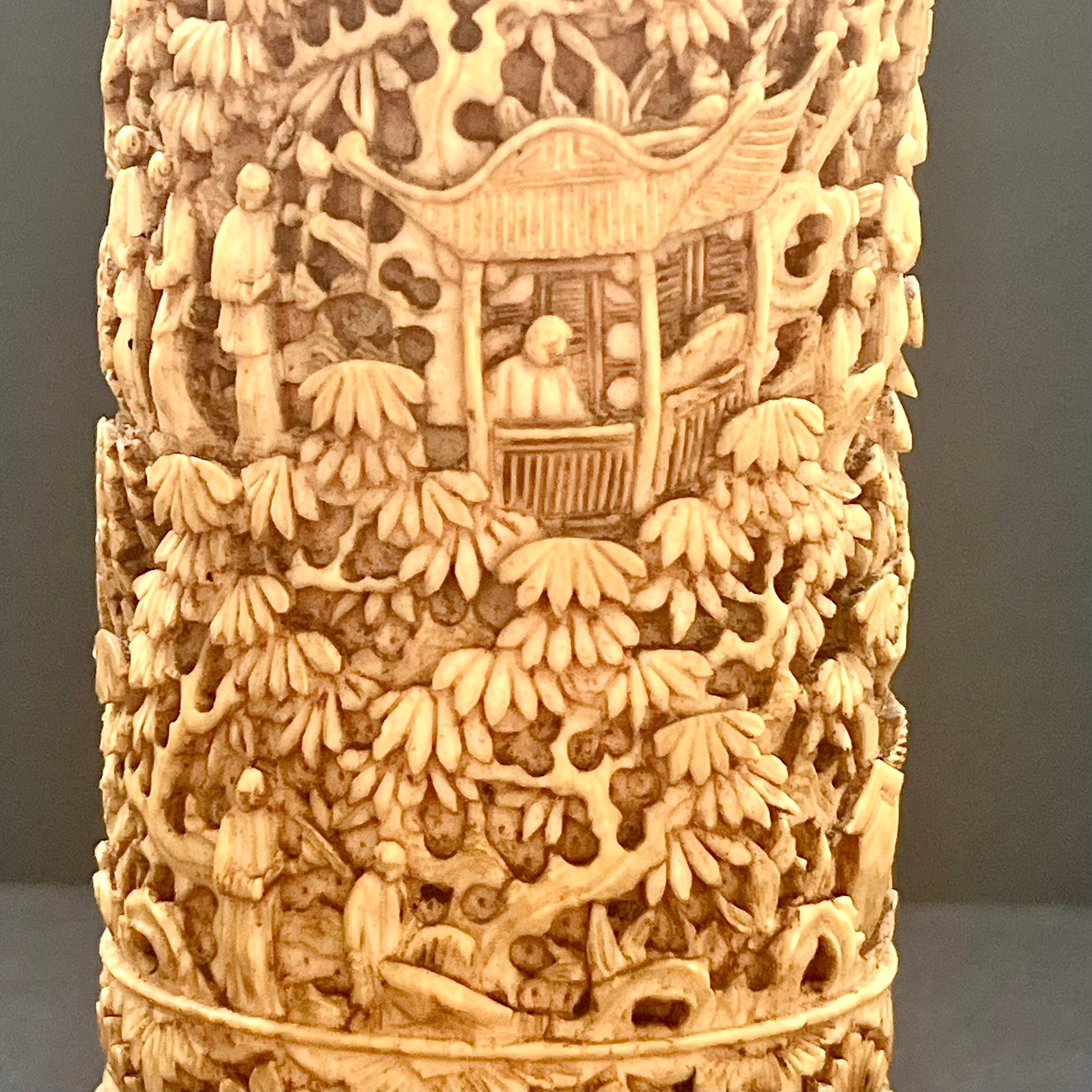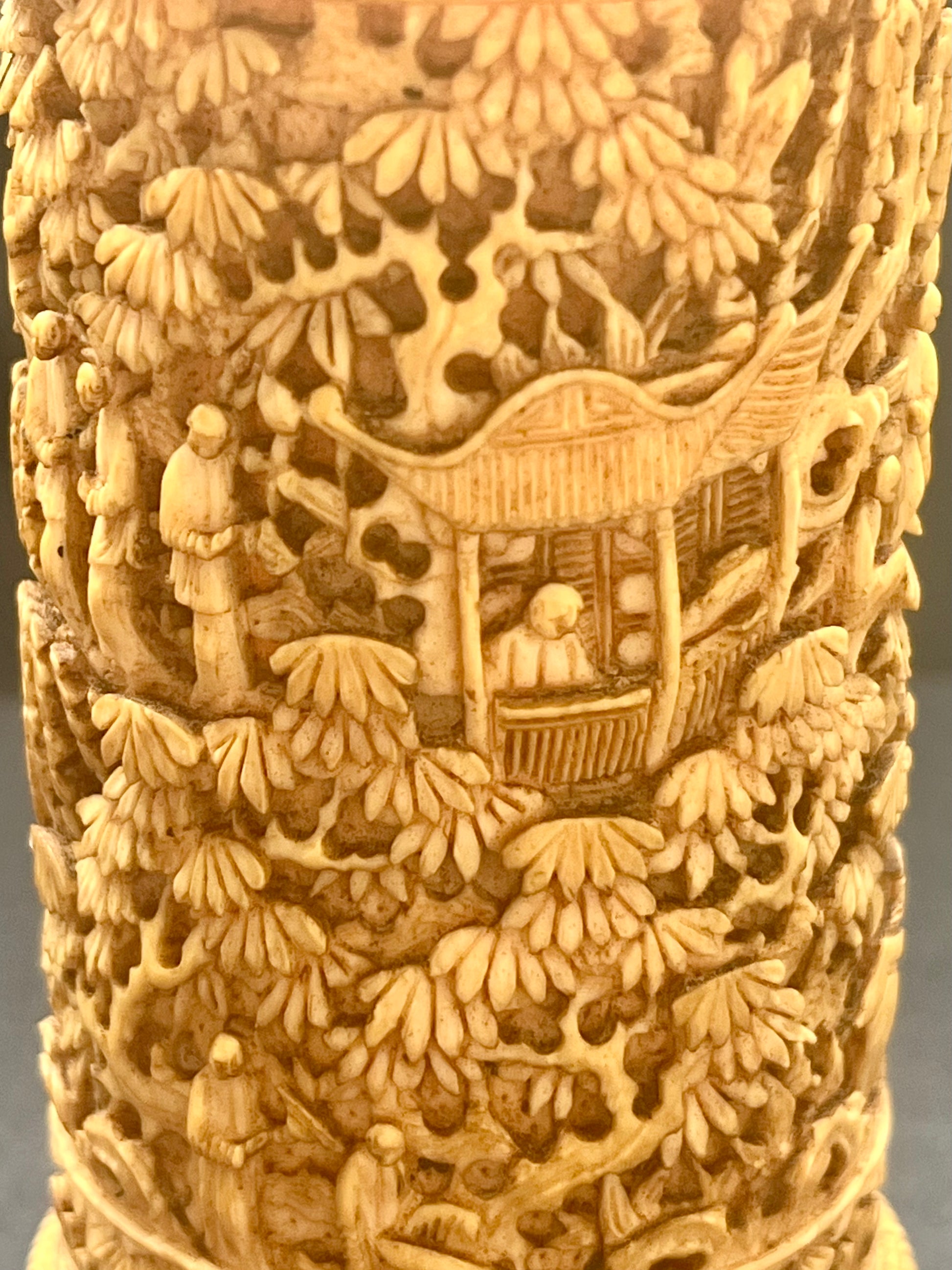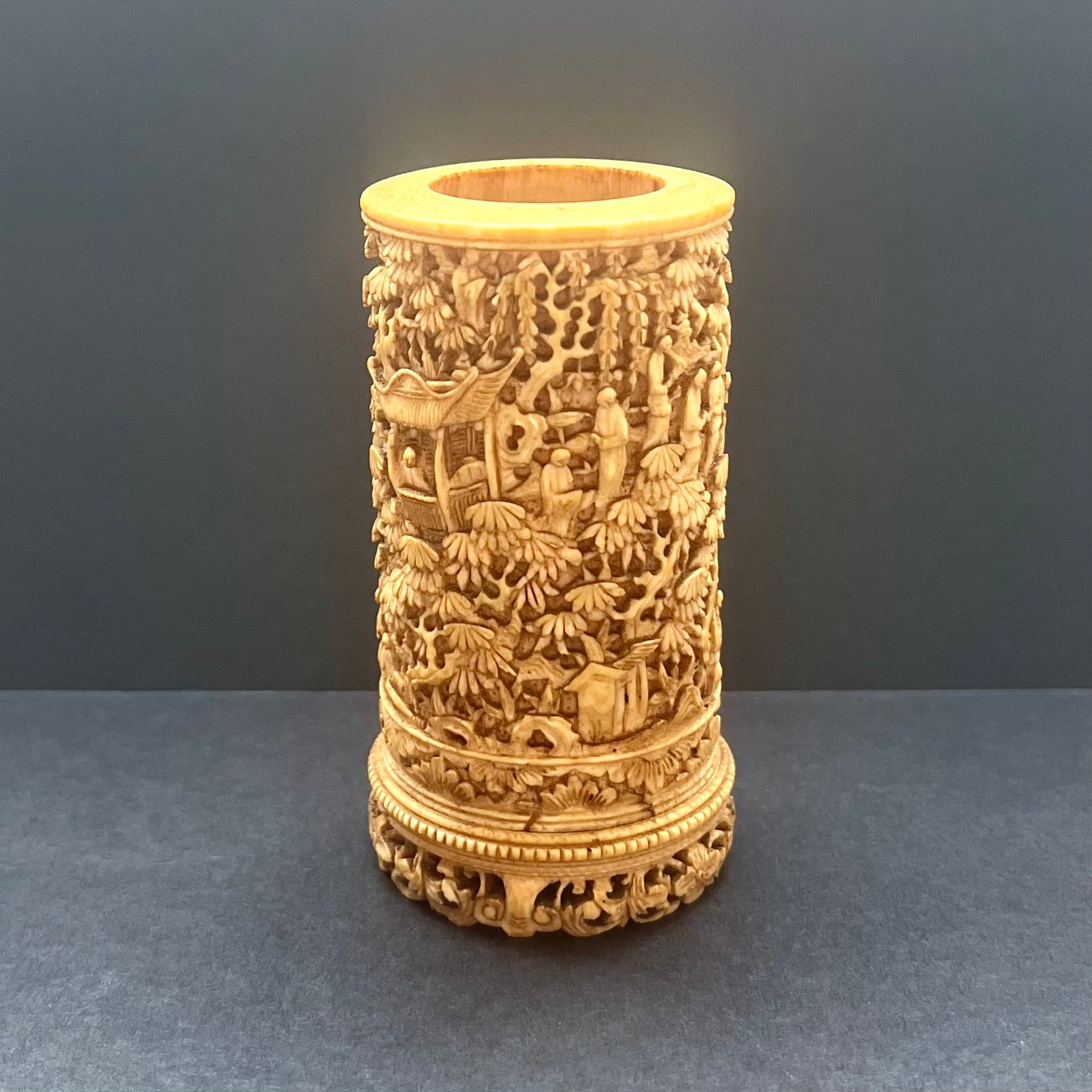 Exceptional late 18th to mid 19th century Qing Dynasty Chinese ivory brush holder with finely carved pavilion scenes