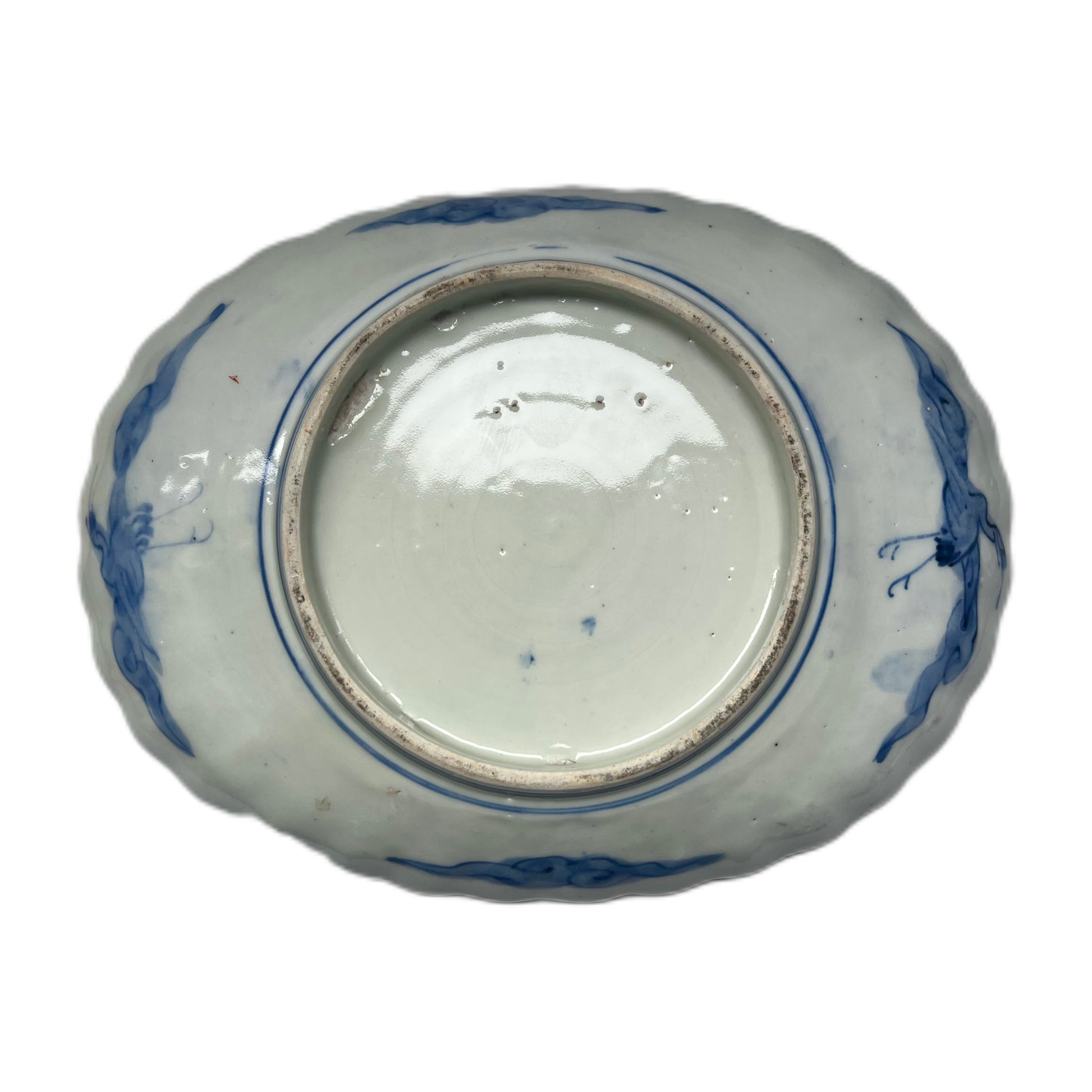Lovely hand-painted stylized motifs as well as handpainted crane motifs in underglaze cobalt blue to the back. Scalloped rim and well-executed details overall.