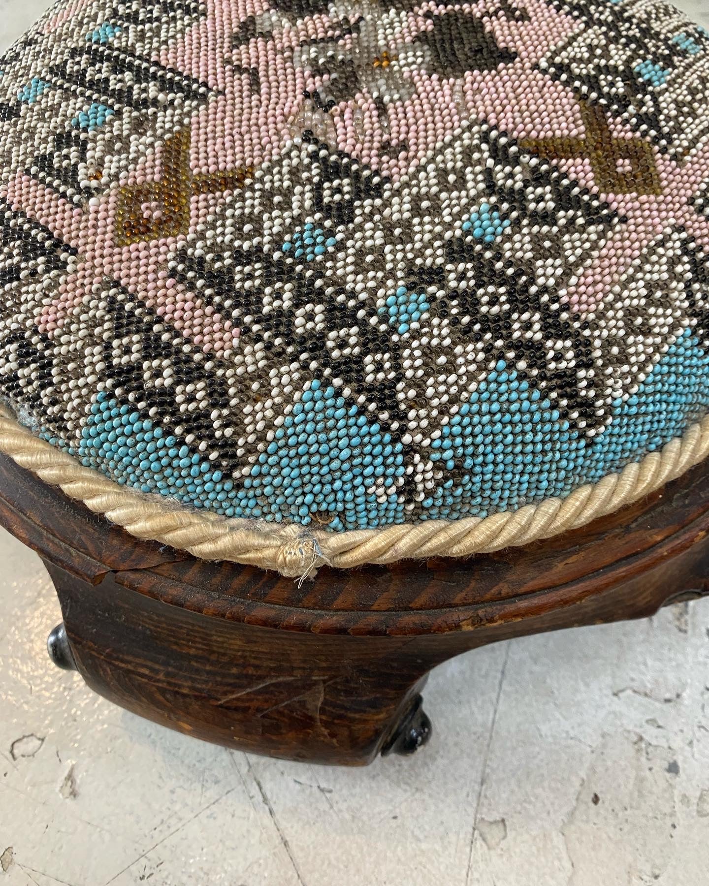 Today we have a lovely Victorian beaded footstool. This charming piece has carved feet with brass bearings and a intricate pattern of glass beads. These footstools are more often seen with embroidered or tapestry patterns, so the beads are a lovely and unusual choice.