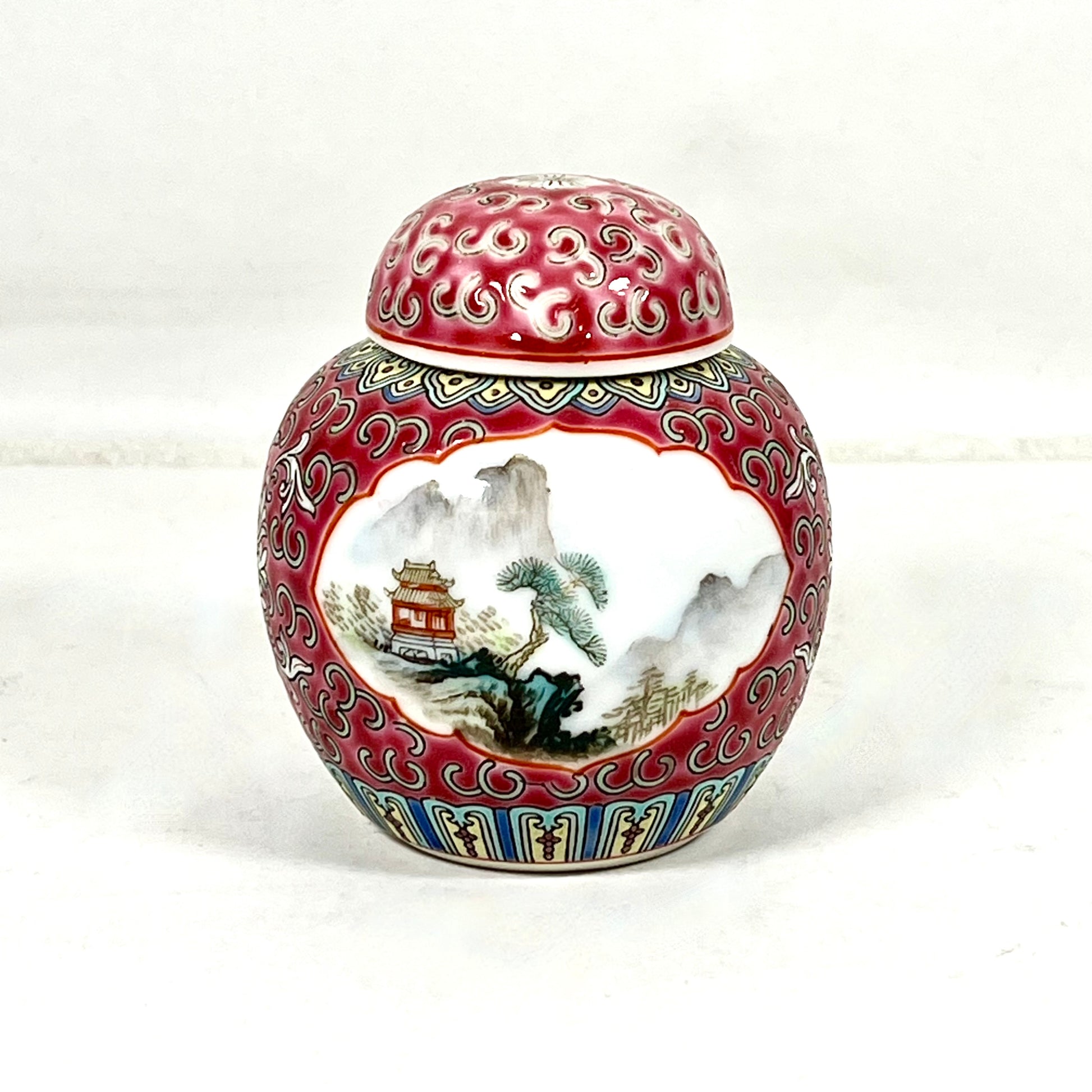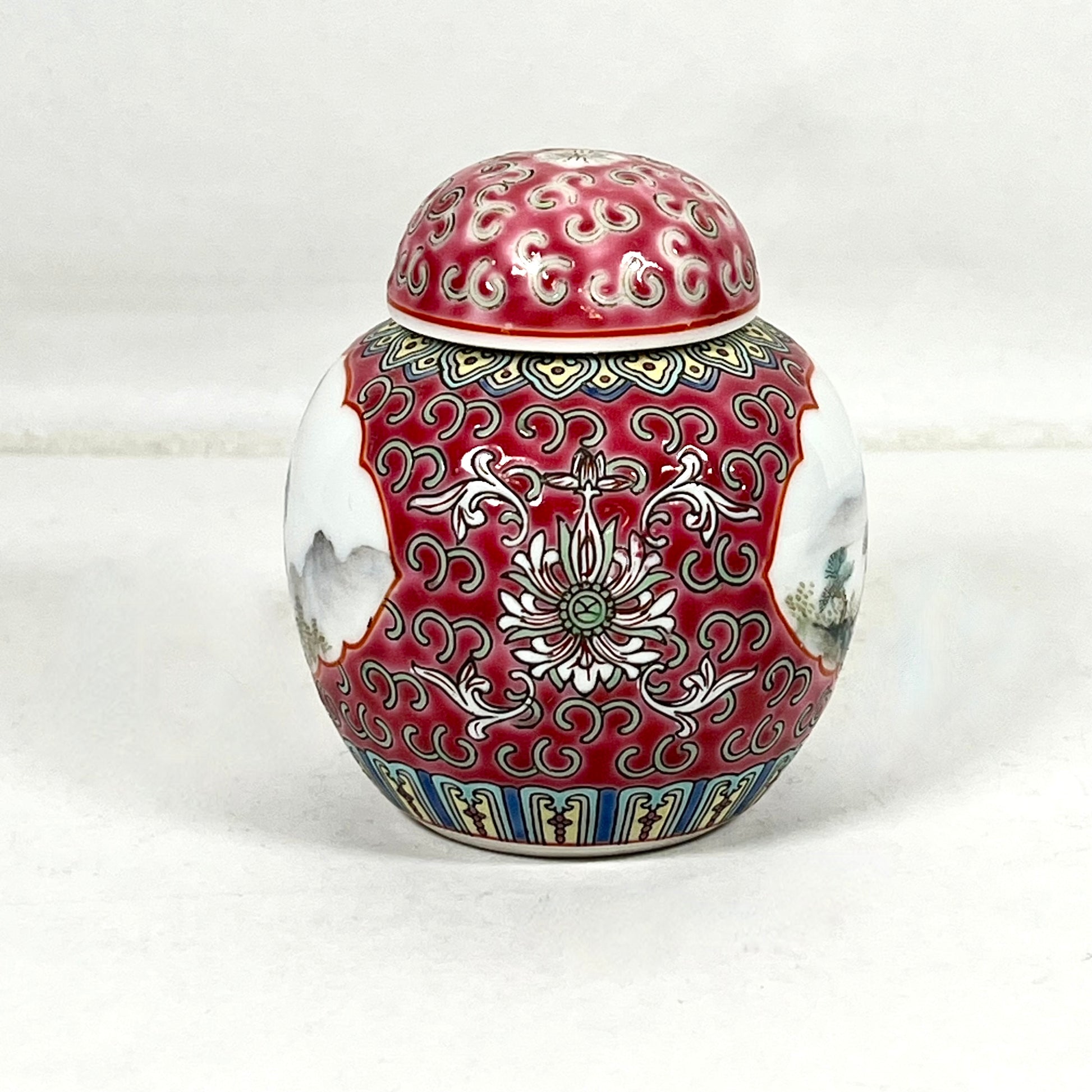 Here we have a vintage Chinese Jingdezhen lidded ginger jar with hand-painted mountain scenes. This jar features a lovely overglaze in tones of red, with vintage Jingdezhen enamels signature of the period. Other details include stylised blossom motifs as well as lingzhi shaped motifs all over the main body of the vase. A highlight is the beautifully hand-painted front and back centre panels depicting a mountain river and mountain pagoda scene respectively.