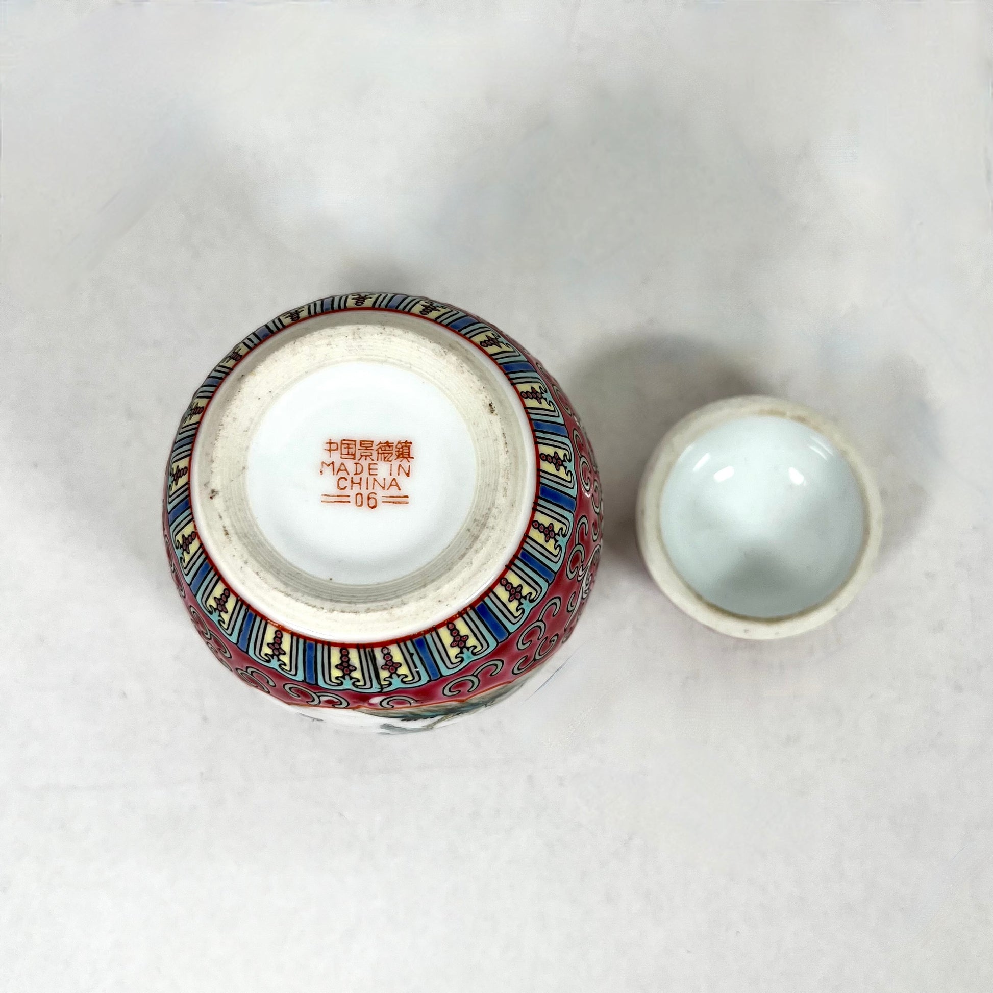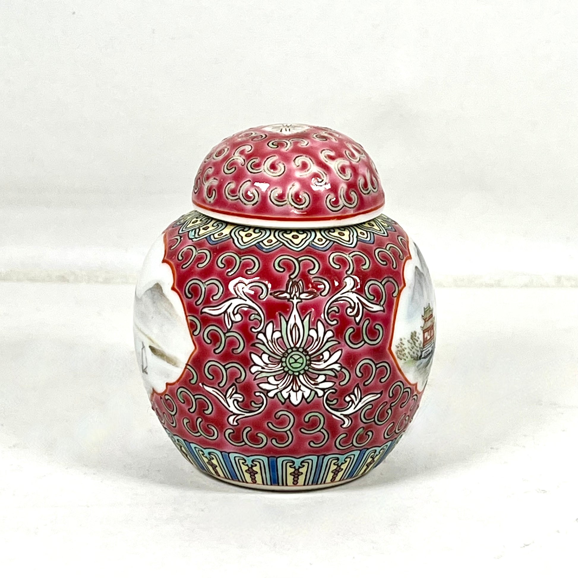 Midcentury 1960s-1980s Lidded Red Jingdezhen Ginger Jar with Hand-painted Mountain Scenes