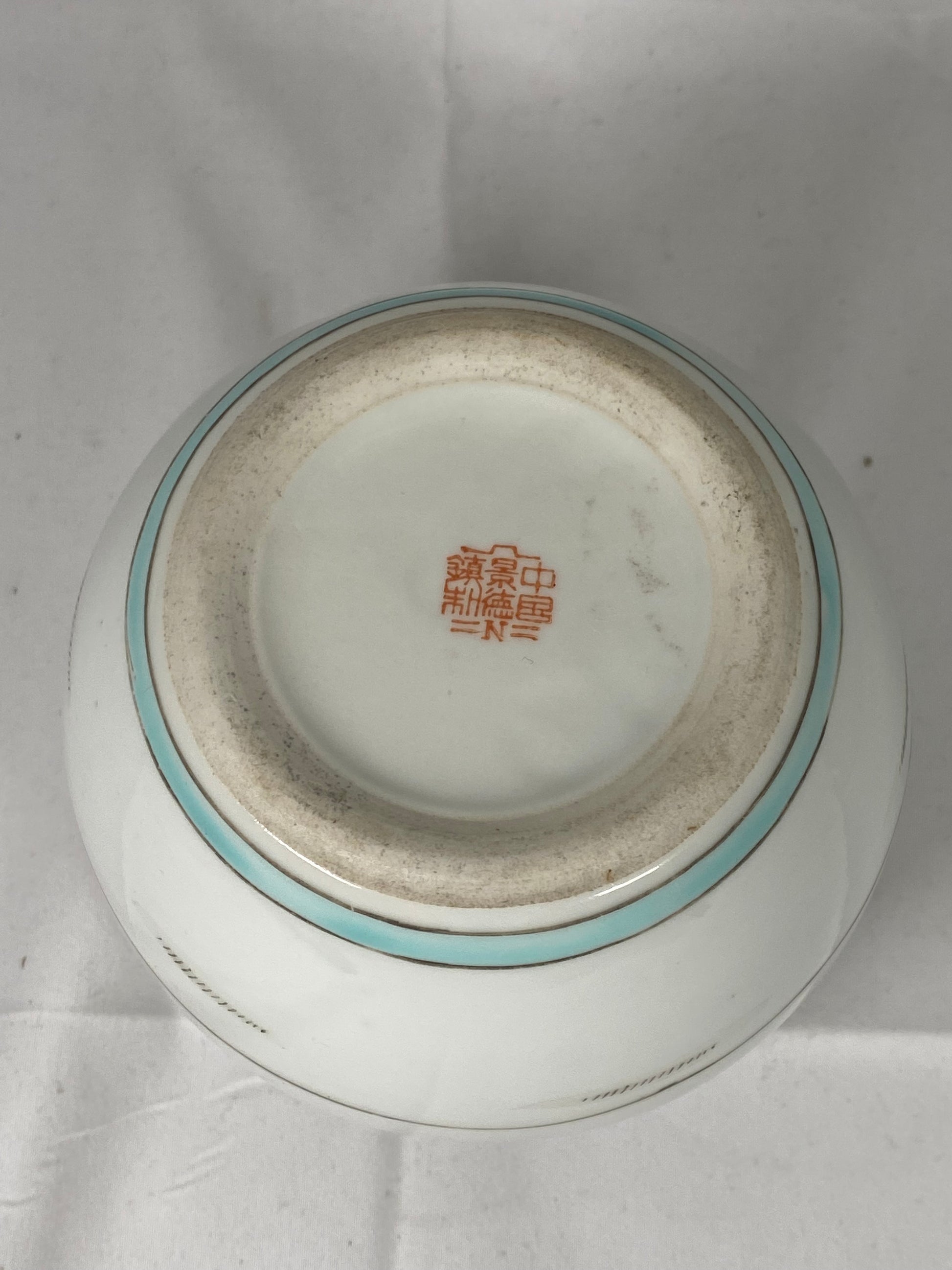 This lovely midcentury Jingdezhen ginger jar features the signature Jingdezhen style border pattern to the top. The porcelain mark indicates this to be made in Jingdezhen Factory N, which hearkens to the Cultural Revolution era practice of factory collectivisation. This factory code specifically dates it to the 60s to 70s, and by Xinguang Porcelain Factory 新光瓷厂, which was the city’s ceramic painting factory at that time. There is some research indicating that this jar was used by Amoy Canning Corporation, a Hong Kong company, for its soy and dairy products.