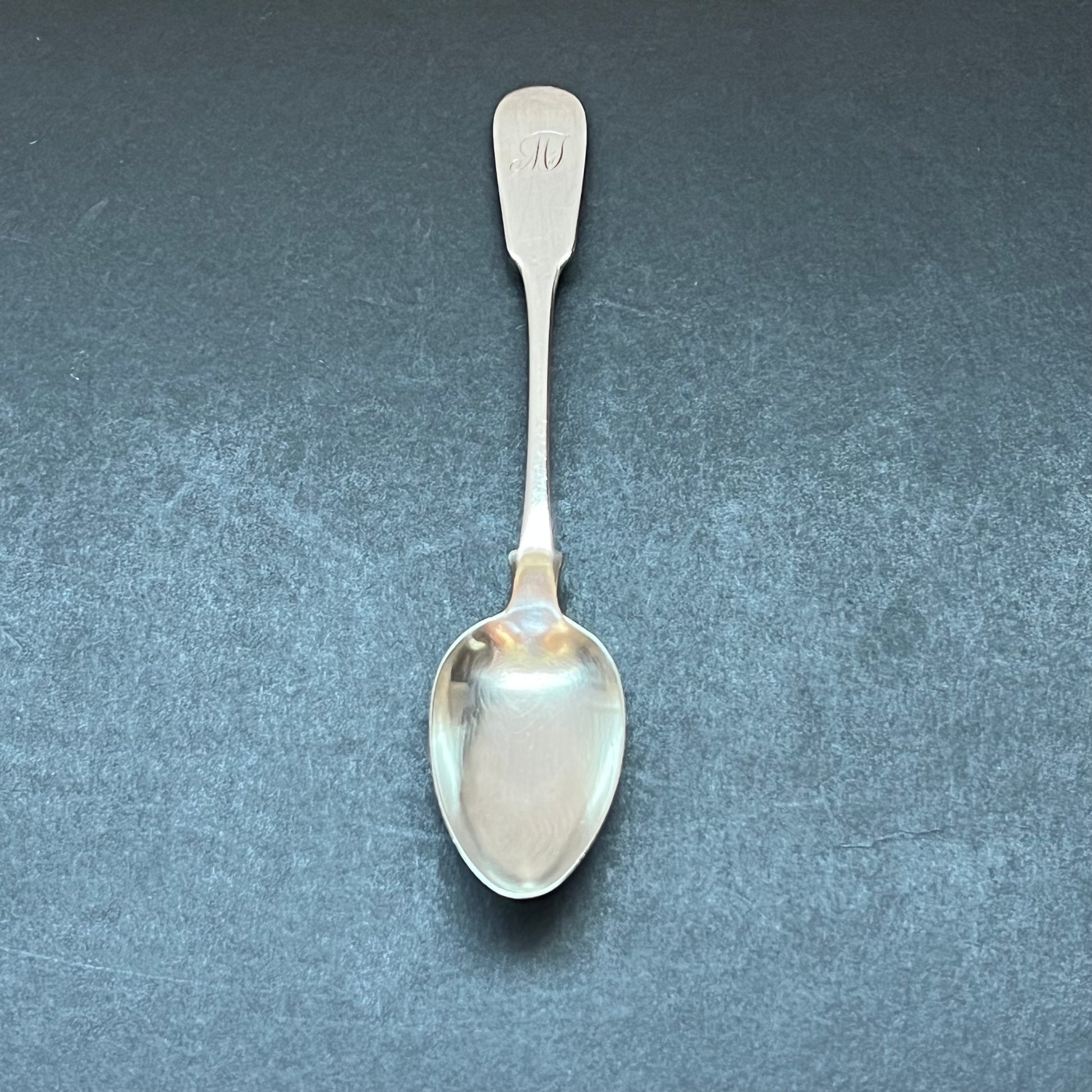 Lovely pair of 2 early Victorian sterling silver spoons, with marks for John Menzies, 1839 and 1840 respectively, Glasgow. Glasgow is a relatively rare mark to find, and this makes this set a collectible example of antique Scottish provincial silver. Monogrammed MJ to the handles of both spoons in elegant cursive.