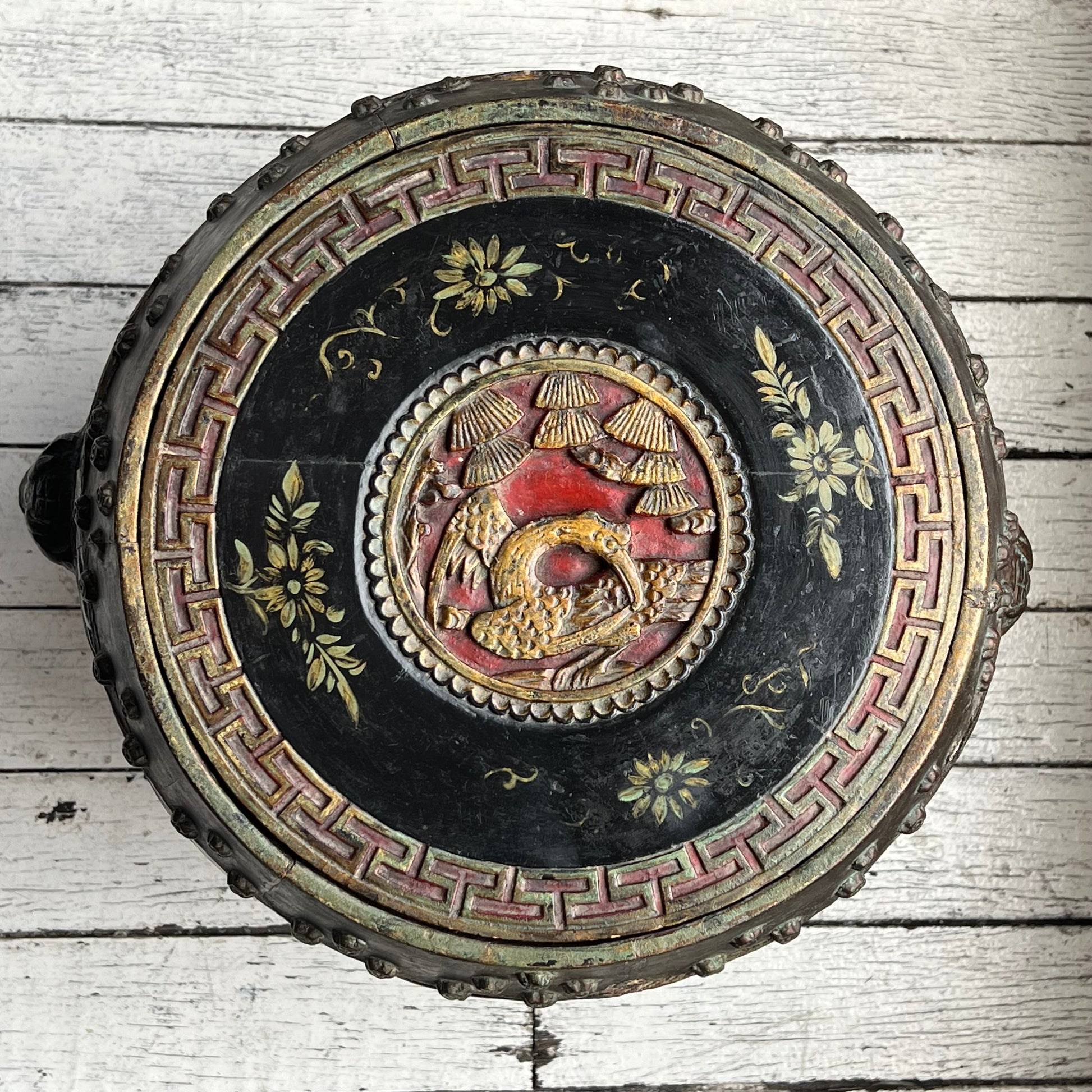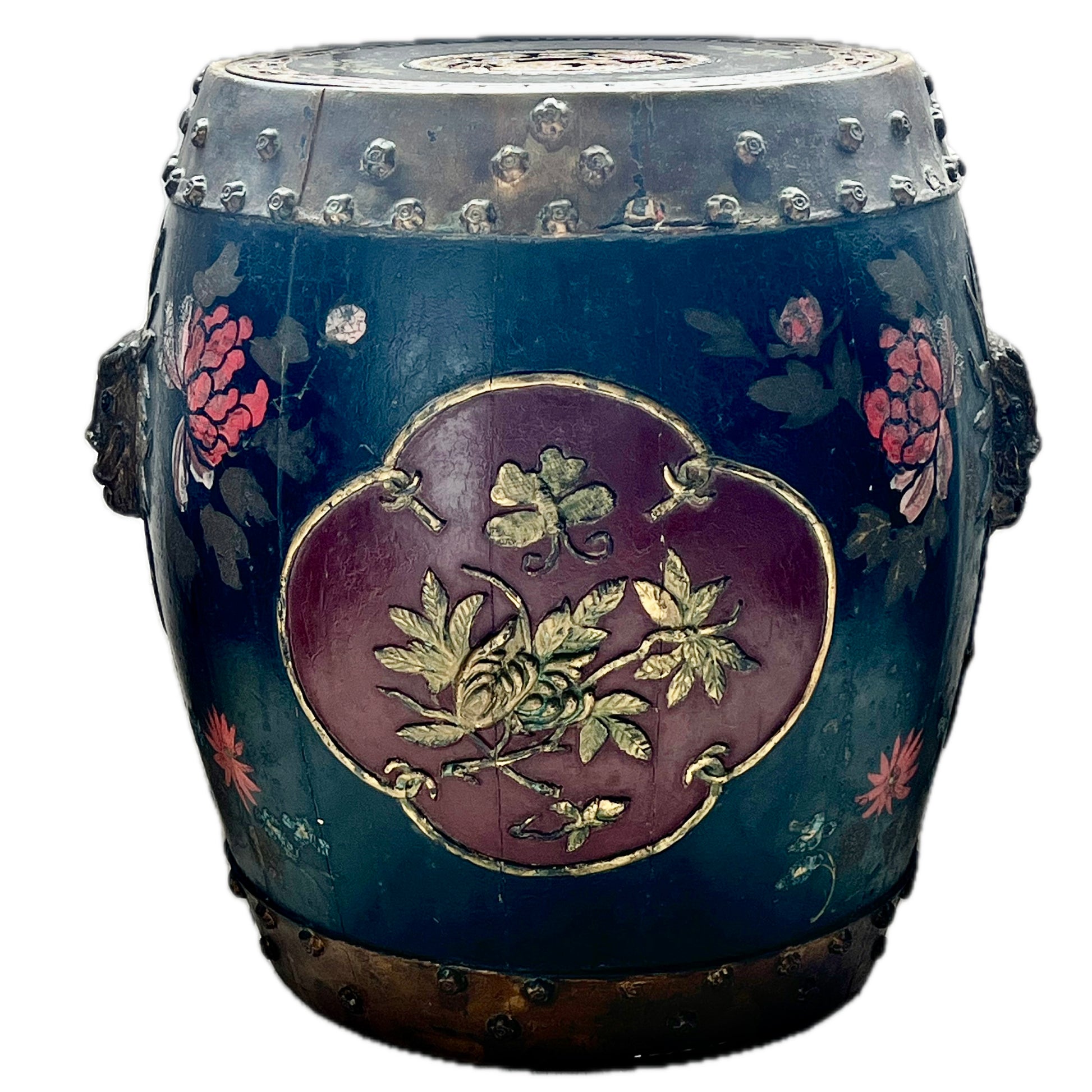 Today we have a rare and stunning pair of mid to late 19th century Qing Dynasty spice barrels. Beautifully handpainted and lacquered, there are two panels on each barrel depicting auspicious motifs such as bats, lotus flowers and butterflies. Overall, these classical scenes, including a carved crane motif to each barrel’s lid, combine to indicate auspiciousness, prosperity and longevity.