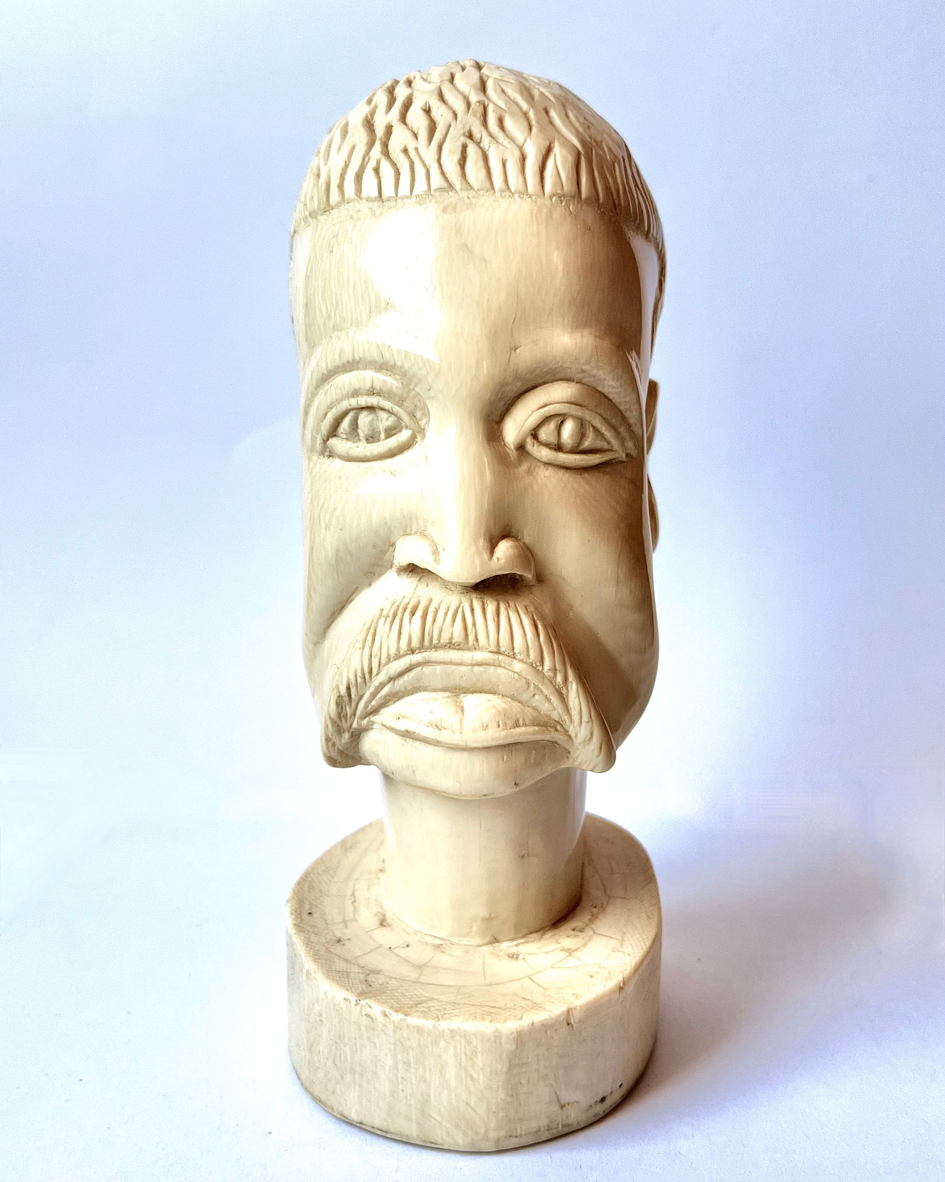 This vintage near antique carved African ivory tribal head circa 1920s to 1930s is a rare and substantial piece. It is one of the largest and finest pieces of ivory we have seen; an African Ivory Coast (Côte d'Ivoire) piece that would have been produced prior to World War II (1939). It displays the magnificent sheen and glossy grain signature to African ivory. The interior and exterior grain has been used to remarkable effect in carving the features and hair of this tribal bust.