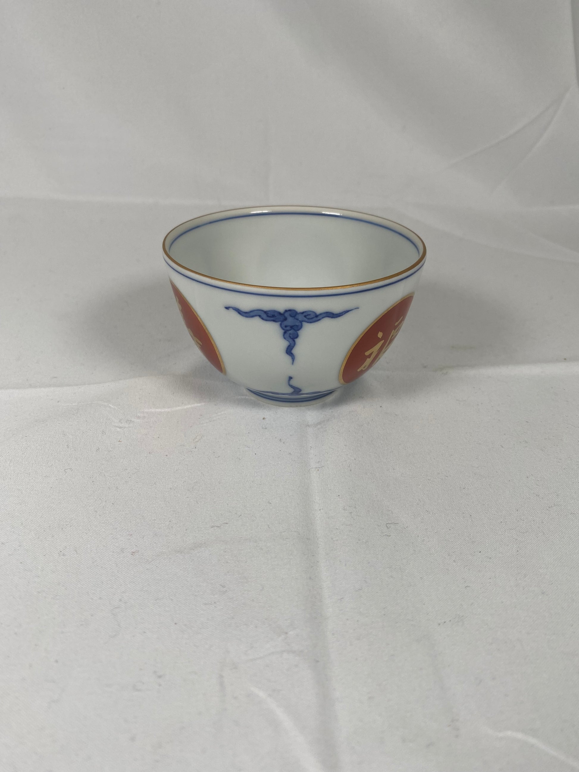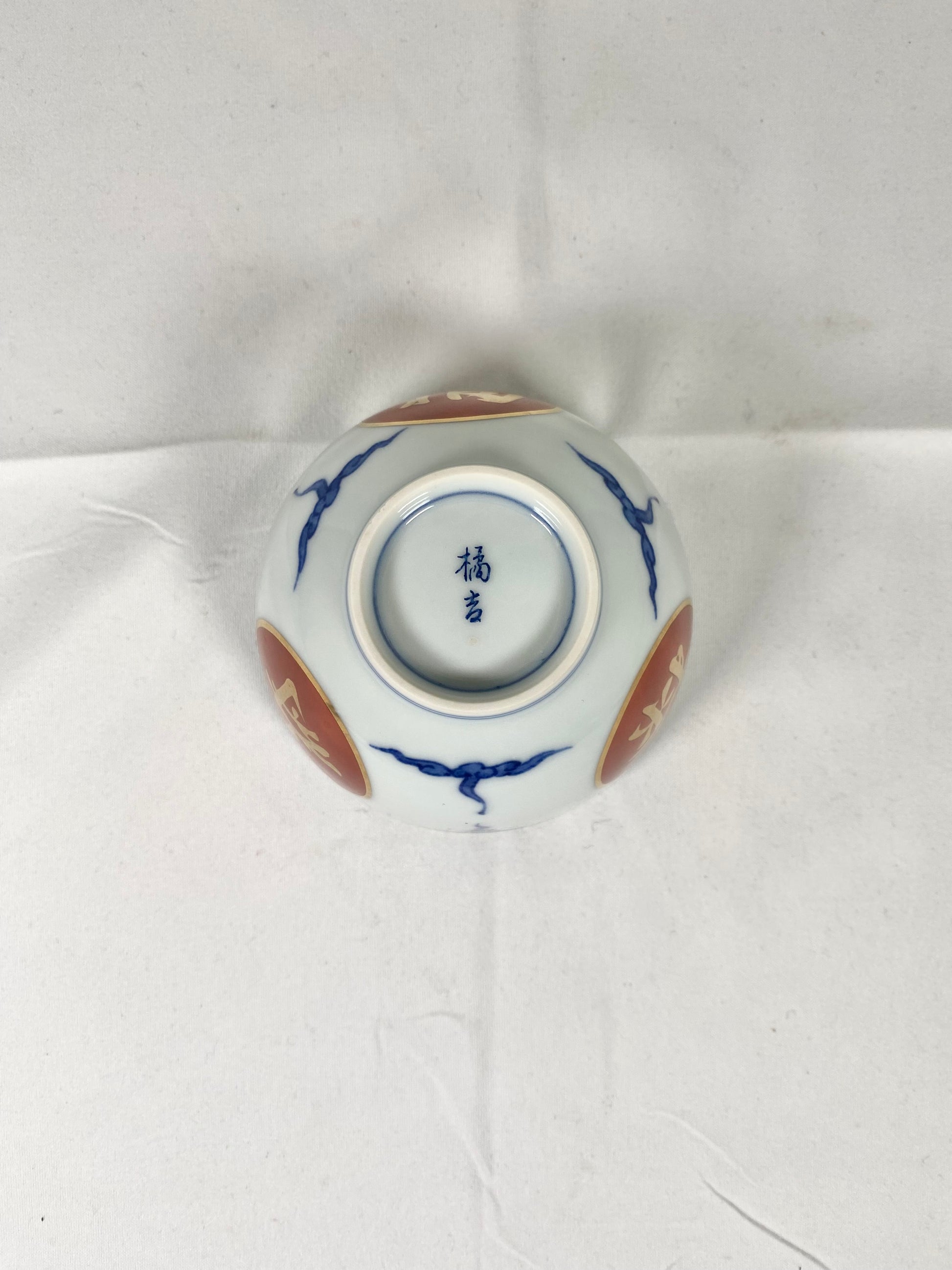 These particular bowls, with their fine gilt embellishment, Arita style handpainted decoration and auspicious characters for prosperity and longevity make them outstanding examples of contemporary Japanese ceramics. The finishing touch is that of a shi lion / foo dog hand-painted in cobalt glaze to each bowl's interior.