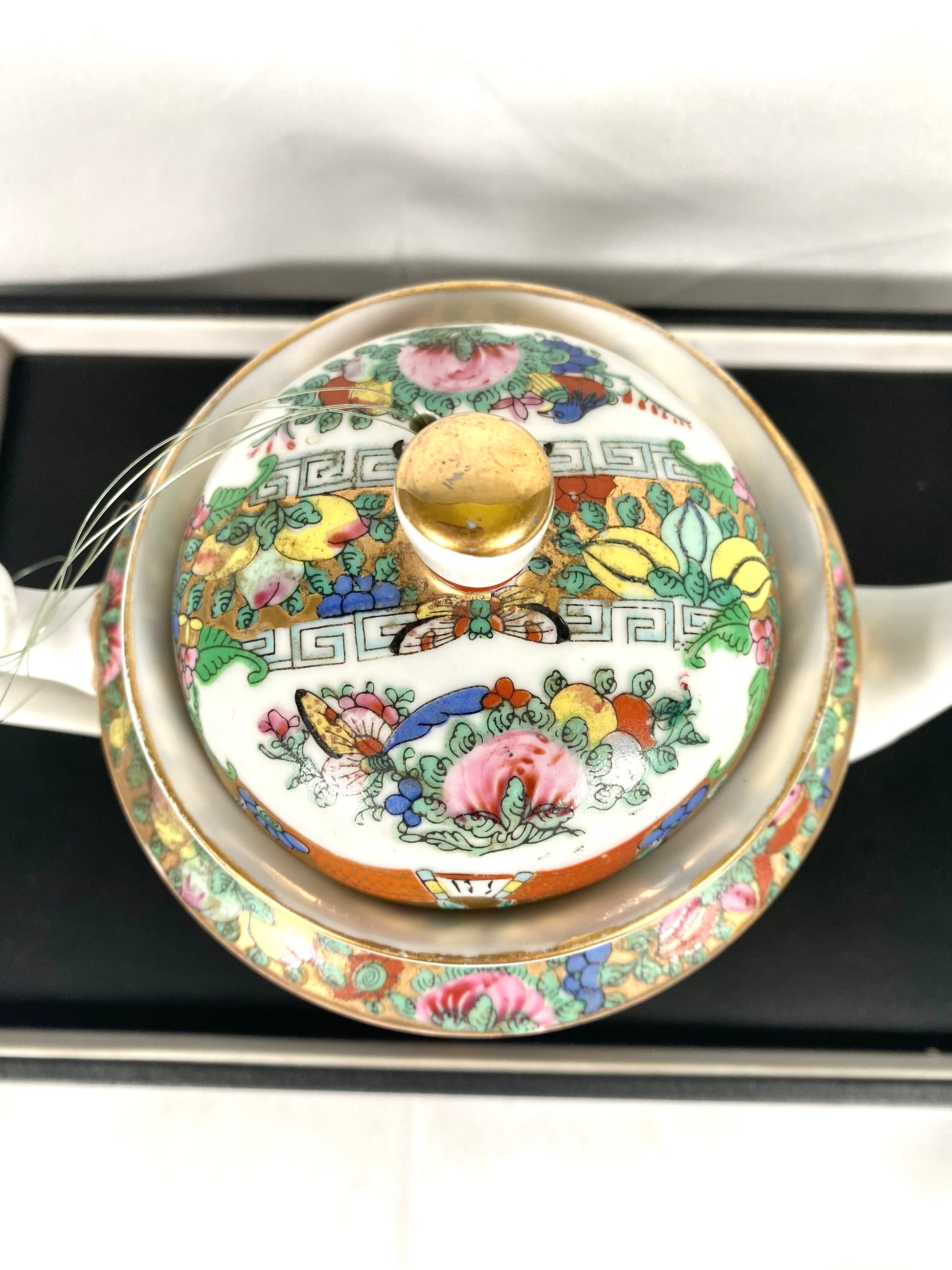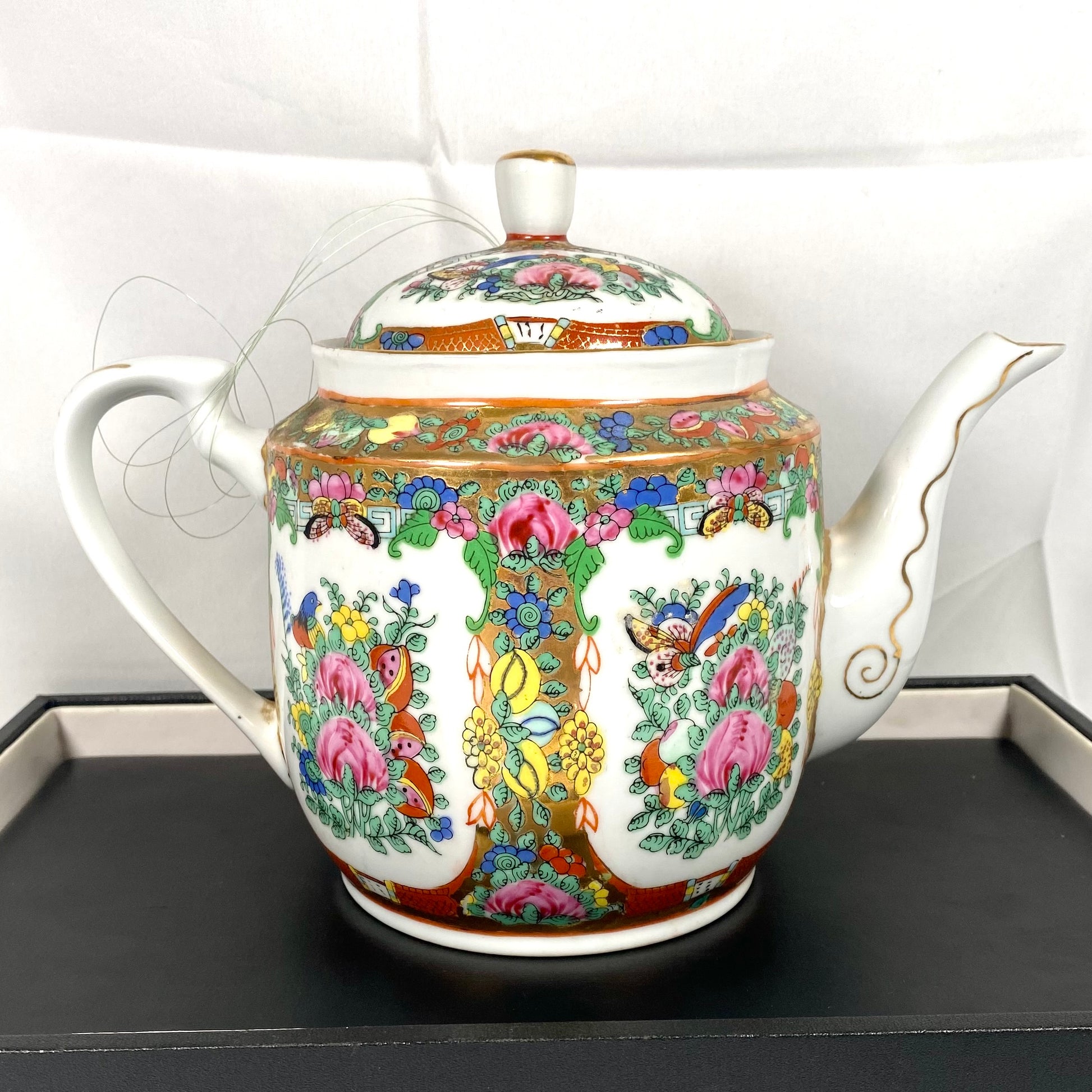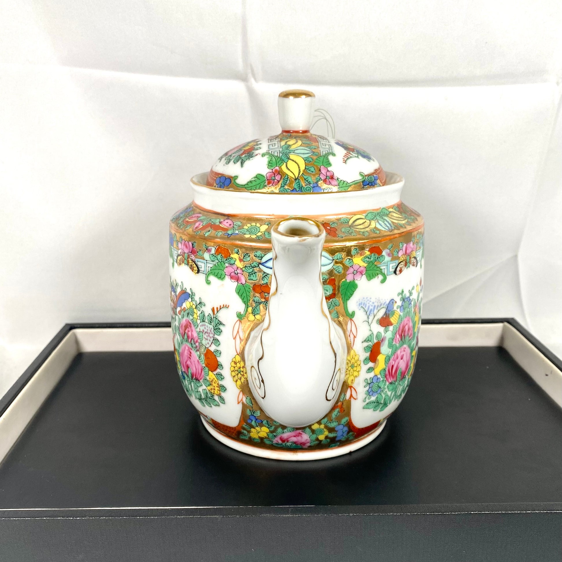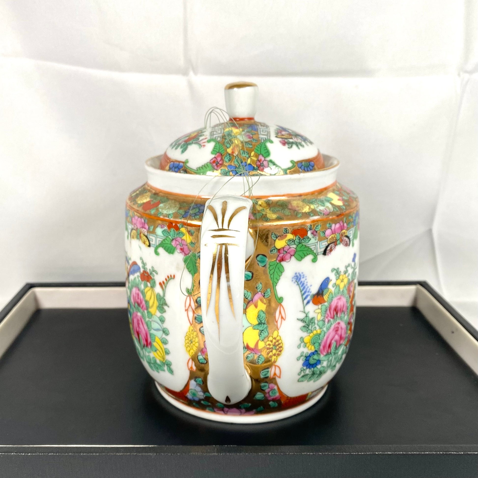 A very fine vintage mid 20th century teapot with Cantonese famille rose enamels and rich gilt accents. This excellent quality piece was likely made as a blank in Jingdezhen then shipped to either Guangdong (Canton) province or Hong Kong where it would then have been carefully handpainted and the gilt accents layered on. From the richness of the gilt and fine quality of work, we can tell this is a quality place, one likely made prior to 1970.