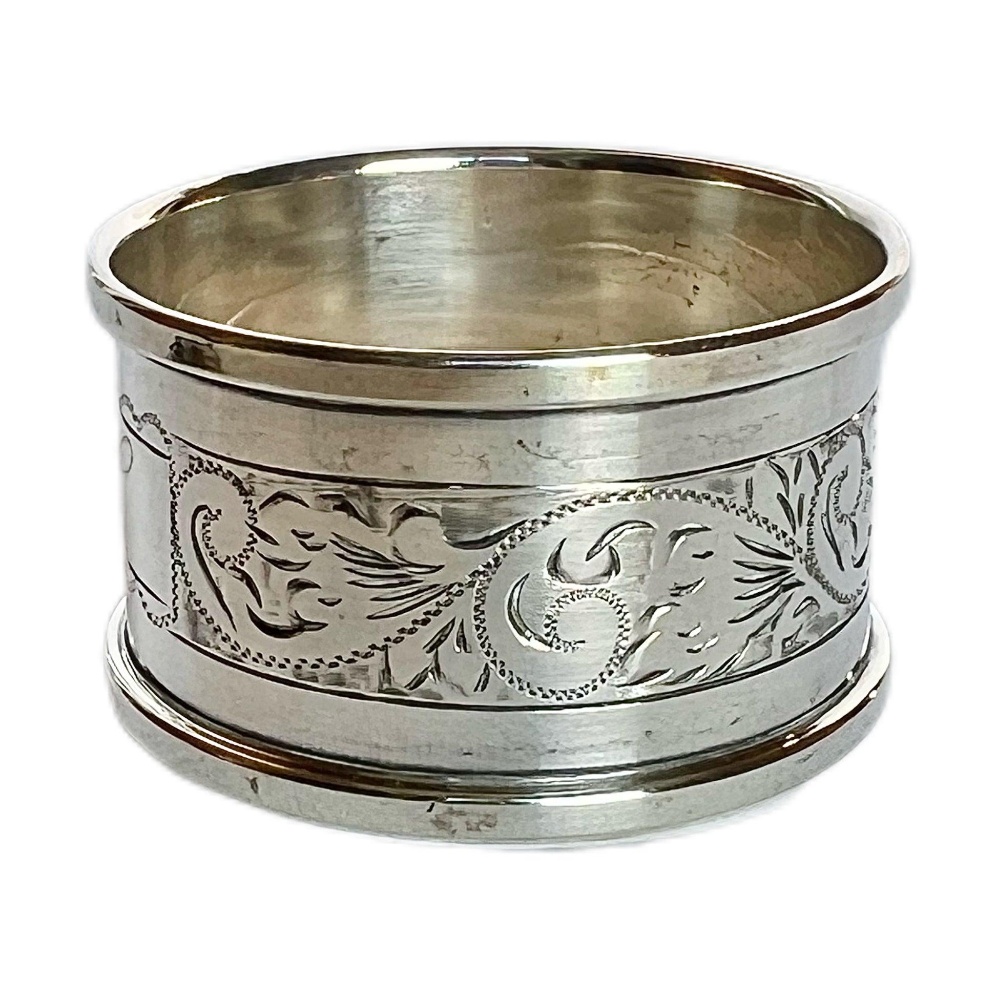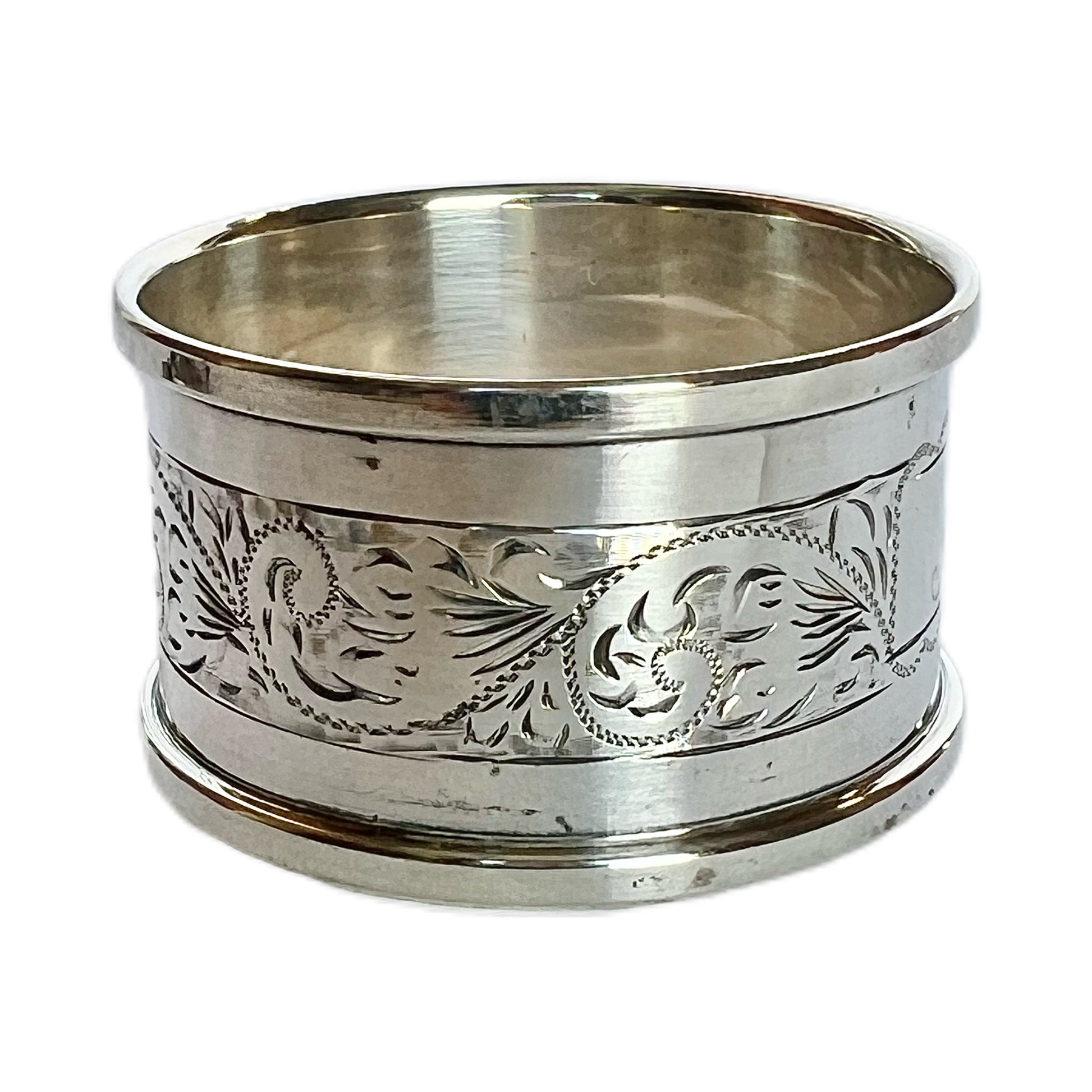 A vintage sterling silver napkin ring with marks for Birmingham, 1970, Henry Griffith & Sons Ltd, which was active from 1890 to 1975. Beautiful engraved details with H monogrammed of the period.