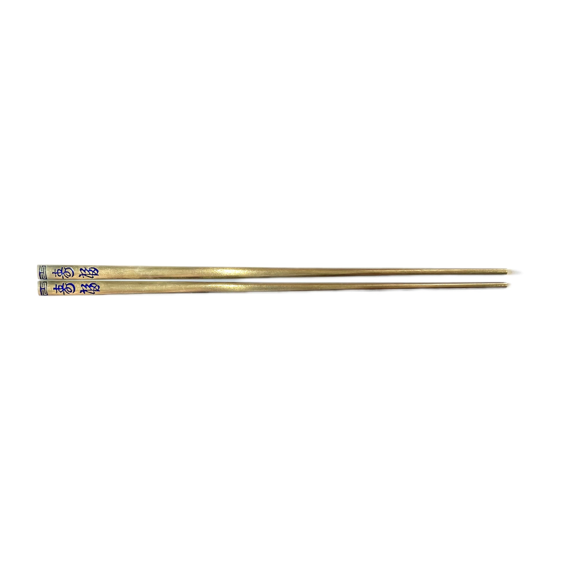 An elegant pair of vintage Korean .700 silver and enamel chopsticks, circa 1970s to 1980s. Elegant “Fu” and “Shou” enamel motifs in cobalt blue enamel to each side. We have 3 pairs in this design available.