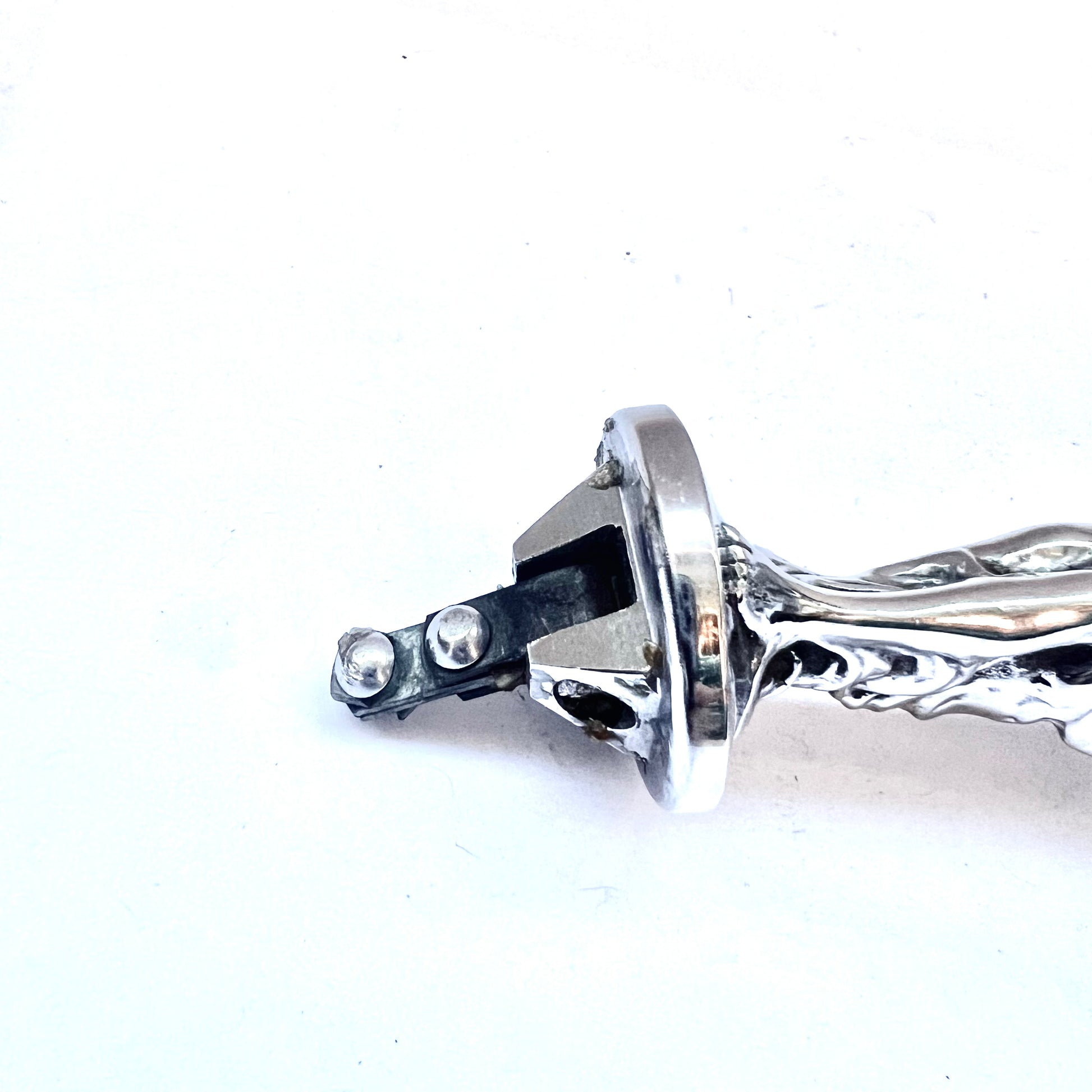 We believe this to be a mascot likely belonging to a 1963 Silver Cloud III model; during this time there was some variation in base shape, wing inclination and stamp. Originally designed by the artist Charles Sykes, the Spirit of Ecstasy was designed by him for the second Lord Montagu of Beaulieu. Inspired by Eleanor Thornton, Montagu’s longterm lover, Emily was first known as The Whisper before becoming the iconic version we know today.