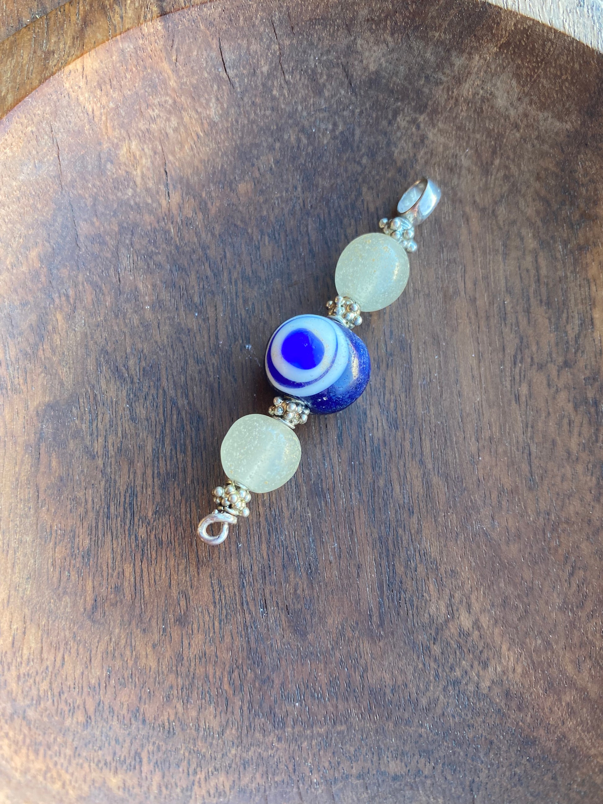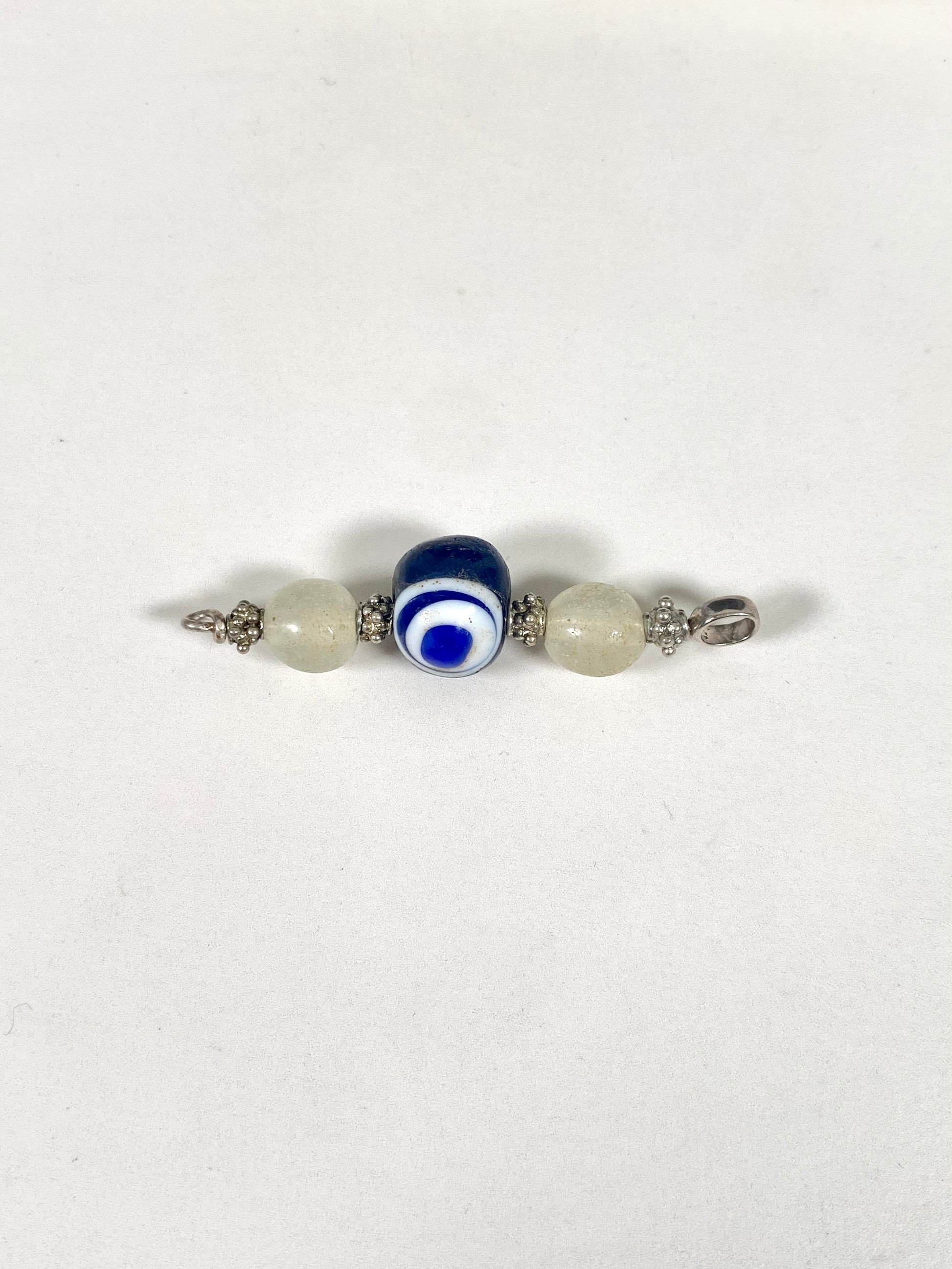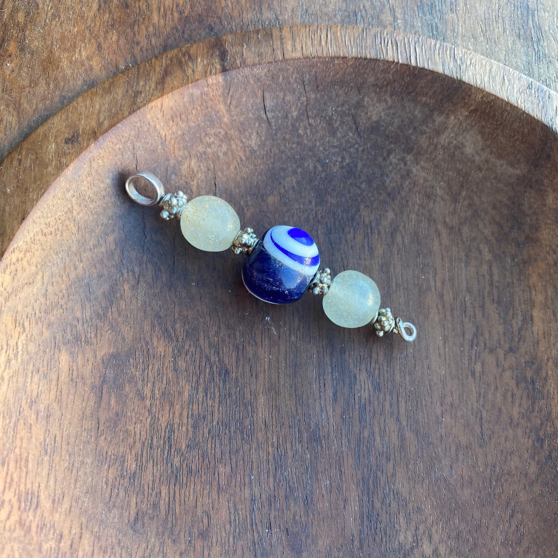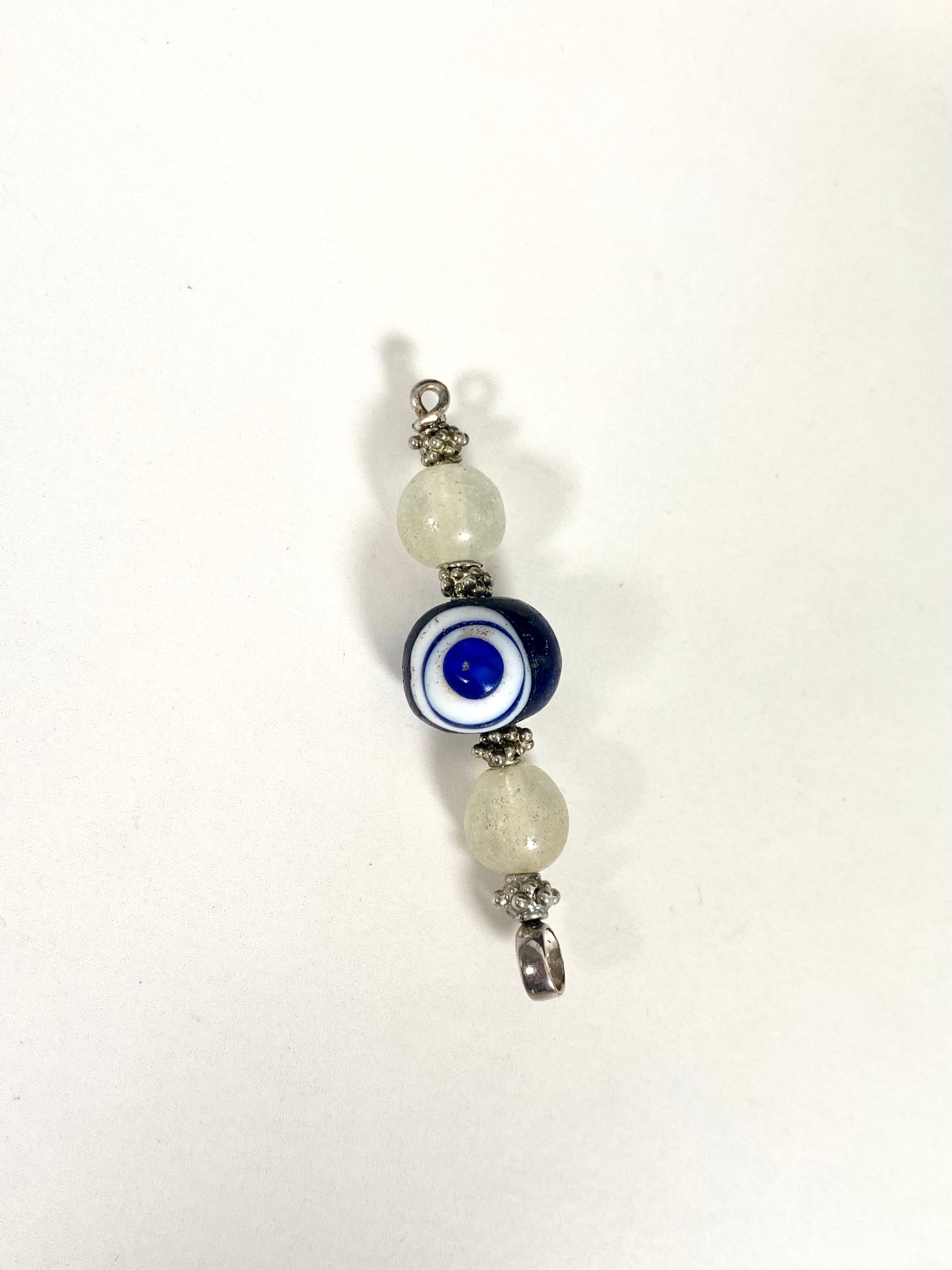 Este anuncio en particular corresponde a un colgante con una cuenta de ojo con detalles en blanco y cobalto, así como dos cuentas del Indo-Pacífico de color blanco a transparente. La cuenta central presenta cuatro ojos millefiori y cada segmento presenta características únicas de laminado a mano. Los engastes son de plata de ley, incluyendo modernas cuentas espaciadoras que protegen la integridad de la cuenta, y está marcado con 925 en el asa.