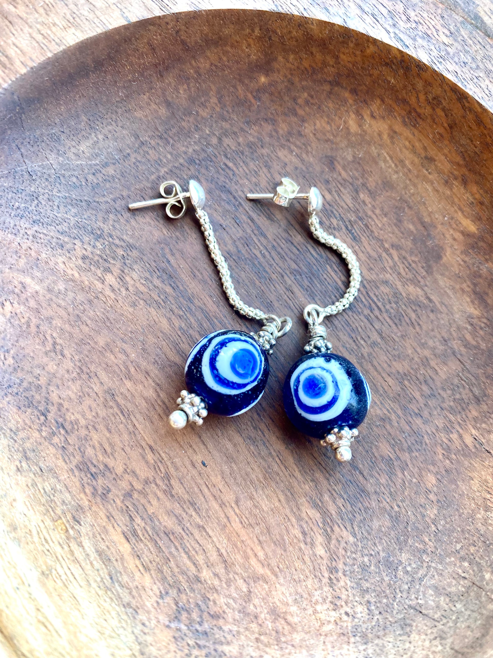Pendientes de cuentas de comercio javanesas antiguas/antiguas: cuentas de ojo de millefiori, circa siglos X al XIV, engastadas en plata de ley.