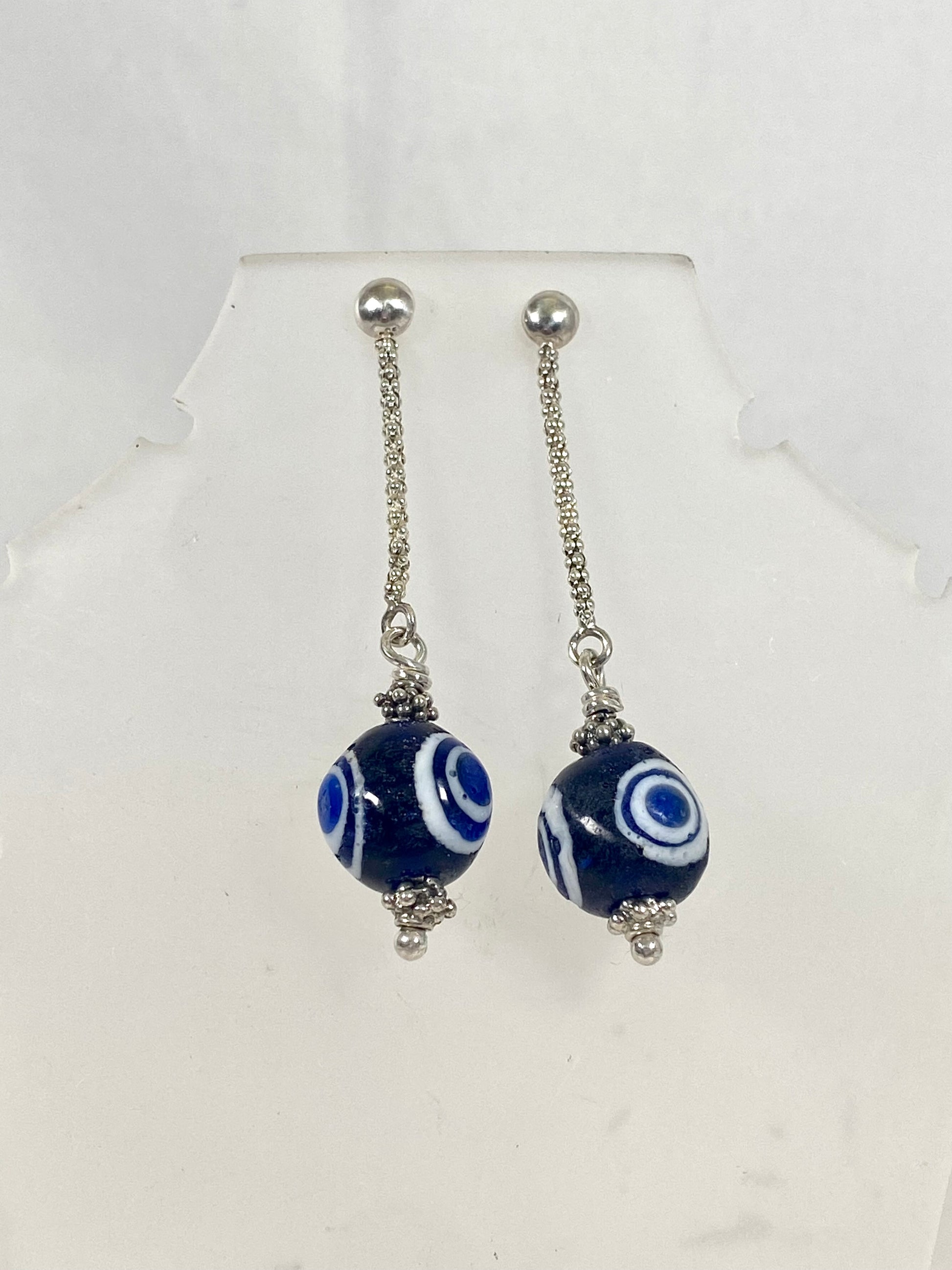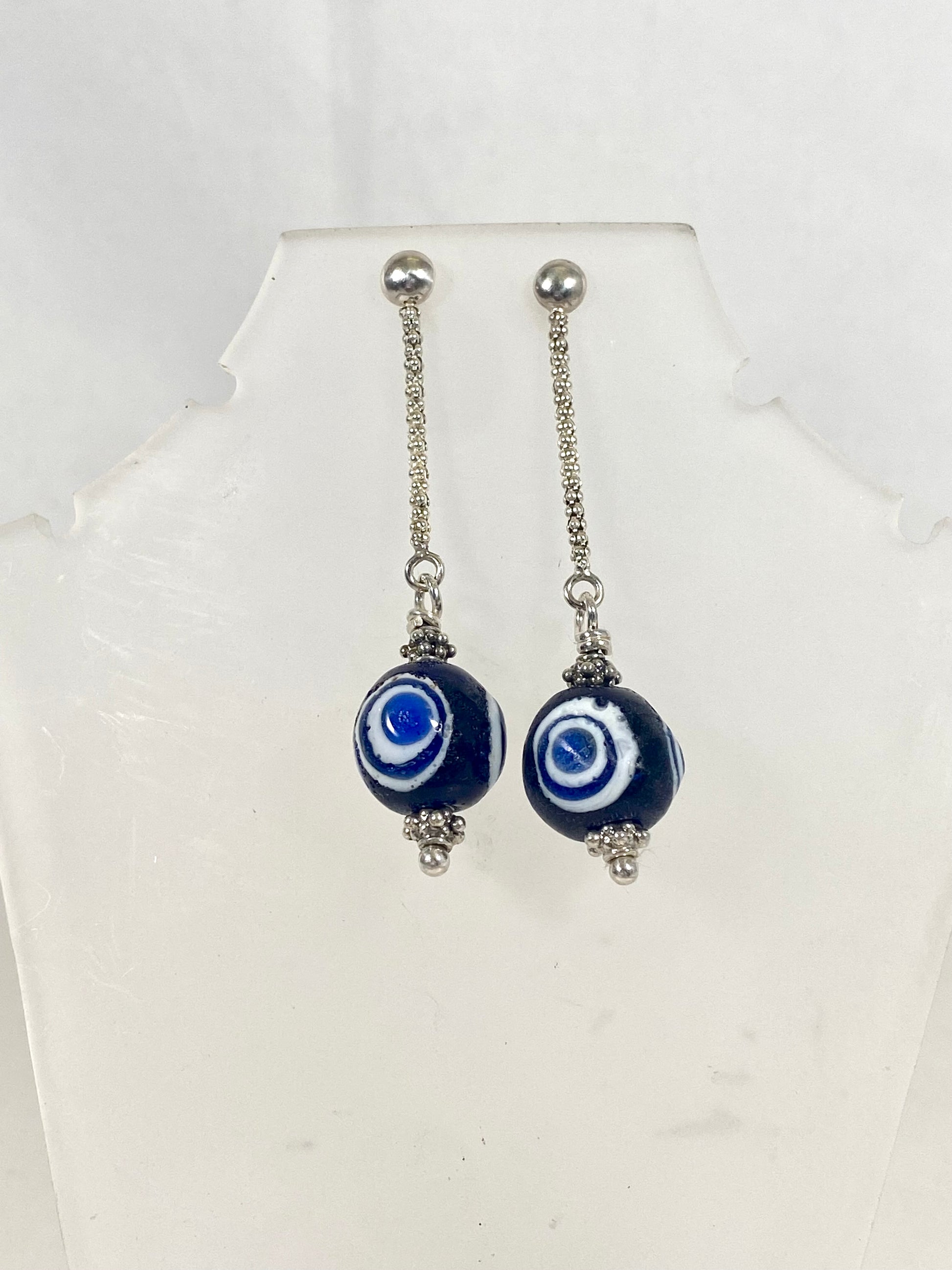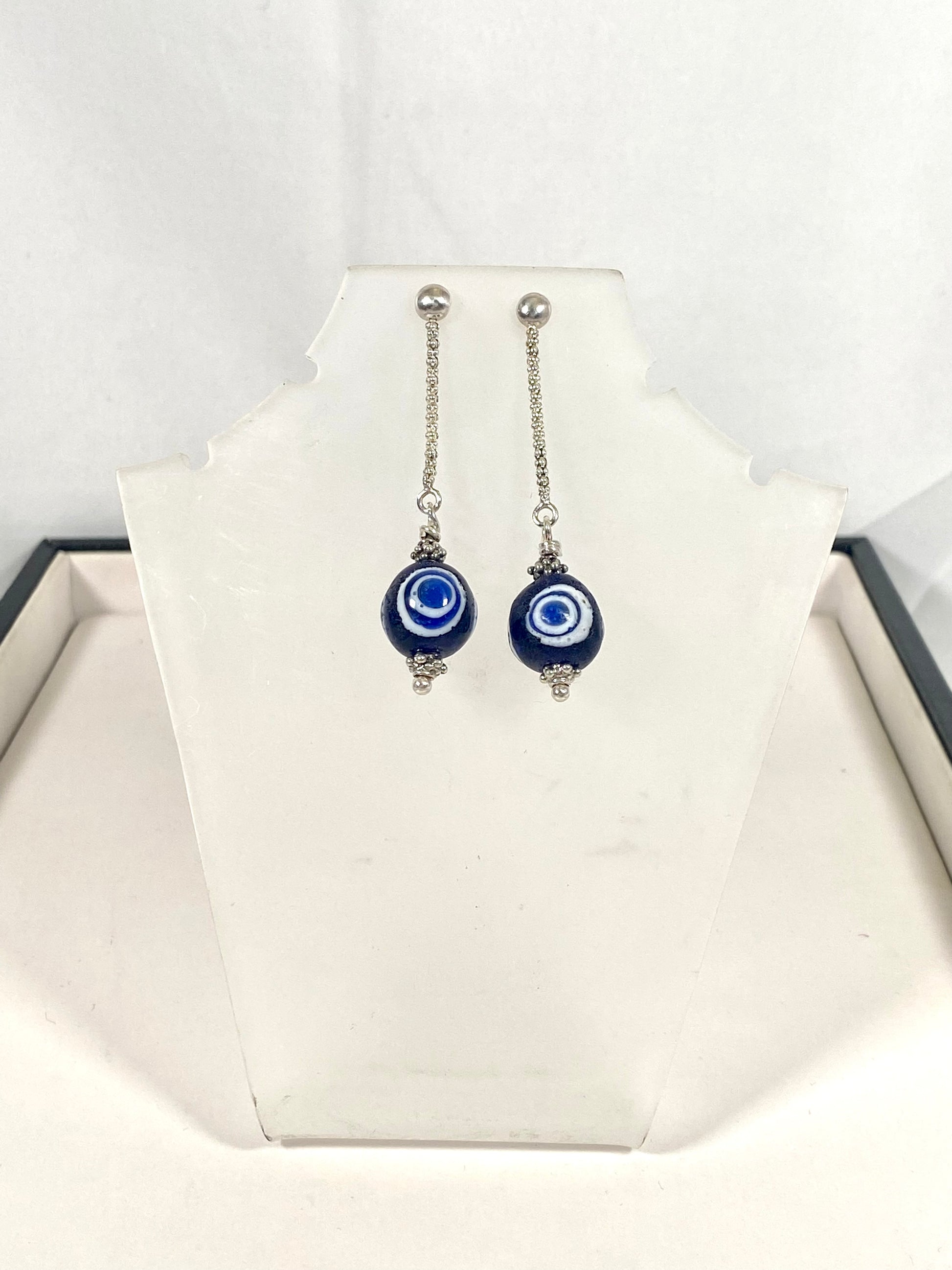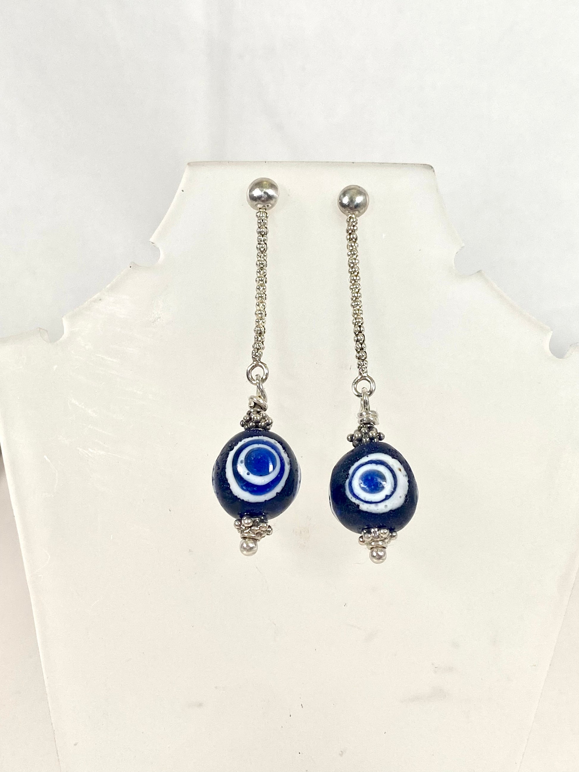 Este anuncio en particular incluye un juego de dos pendientes colgantes con grandes cuentas millefiori de cobalto con detalles en blanco y azul que combinan a la perfección. Cada cuenta tiene cuatro cuentas millefiori y cada segmento presenta características únicas hechas a mano. Están engastados en plata de ley, e incluyen dos modernas cuentas espaciadoras que protegen la integridad de la cuenta, y cuentan con pasadores de mariposa con sello distintivo.