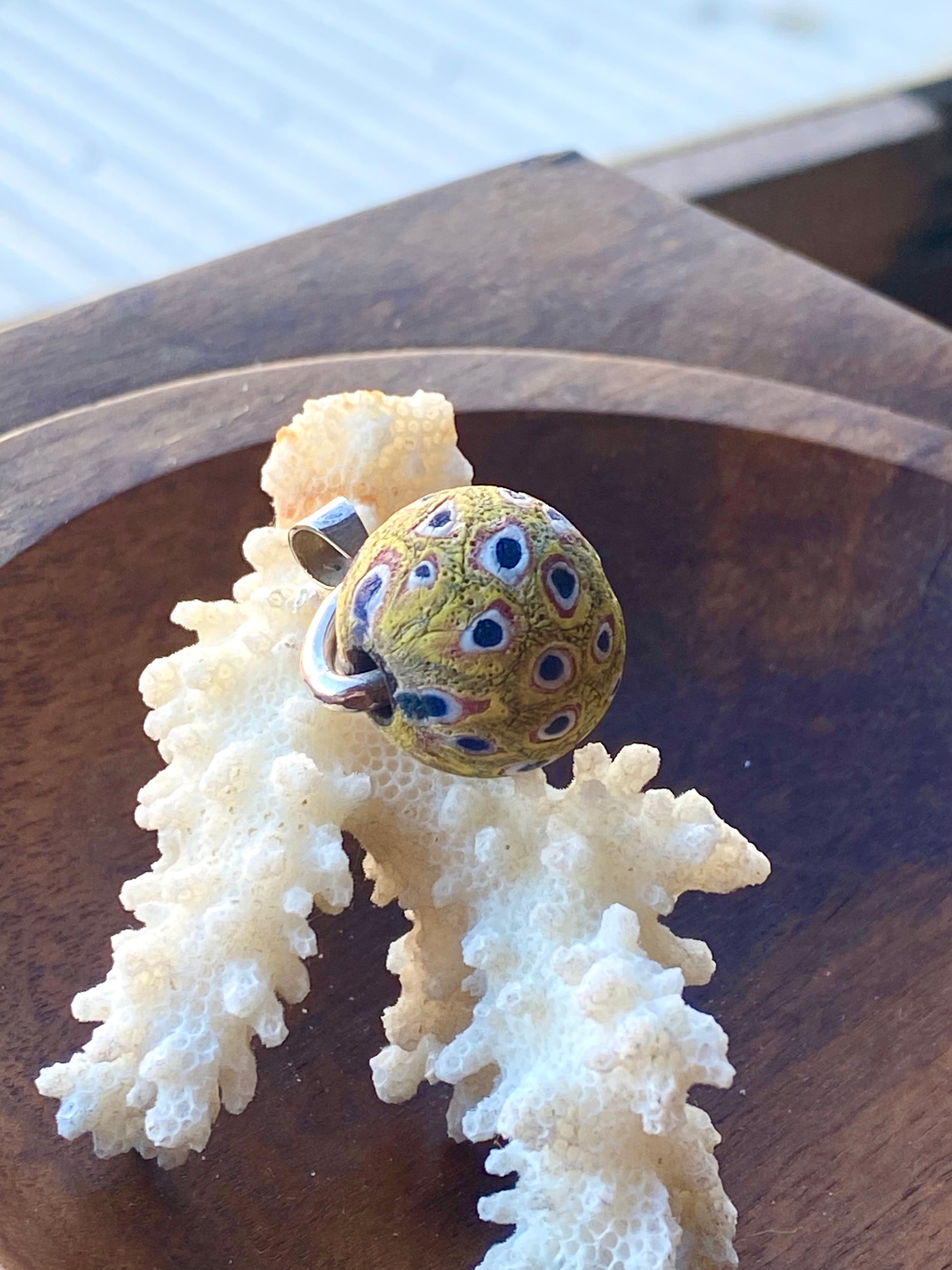 Esta serie en particular presenta antiguas cuentas de ojo indonesias elaboradas con el método millefiori, creado durante el período helenístico y romano. En particular, seleccionamos a mano las cuentas más grandes e interesantes para montarlas en engastes de dijes giratorios, realzando al máximo cada faceta de estas cuentas y preservando su integridad histórica.