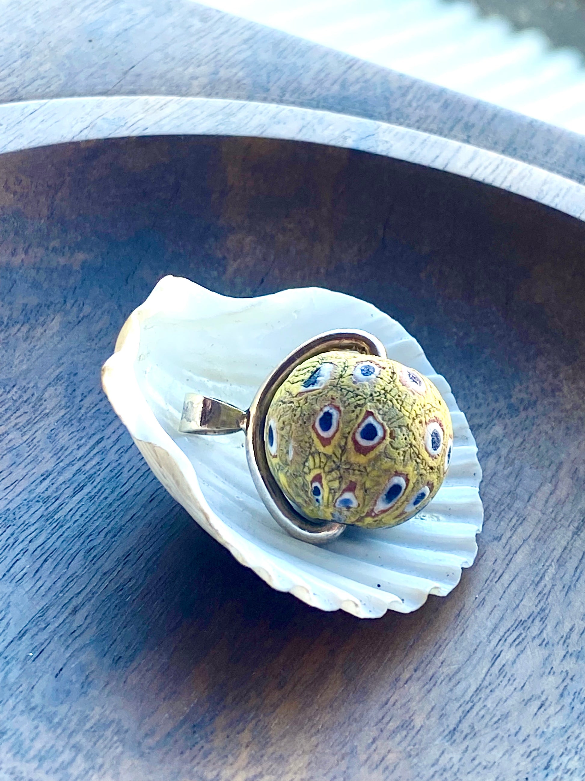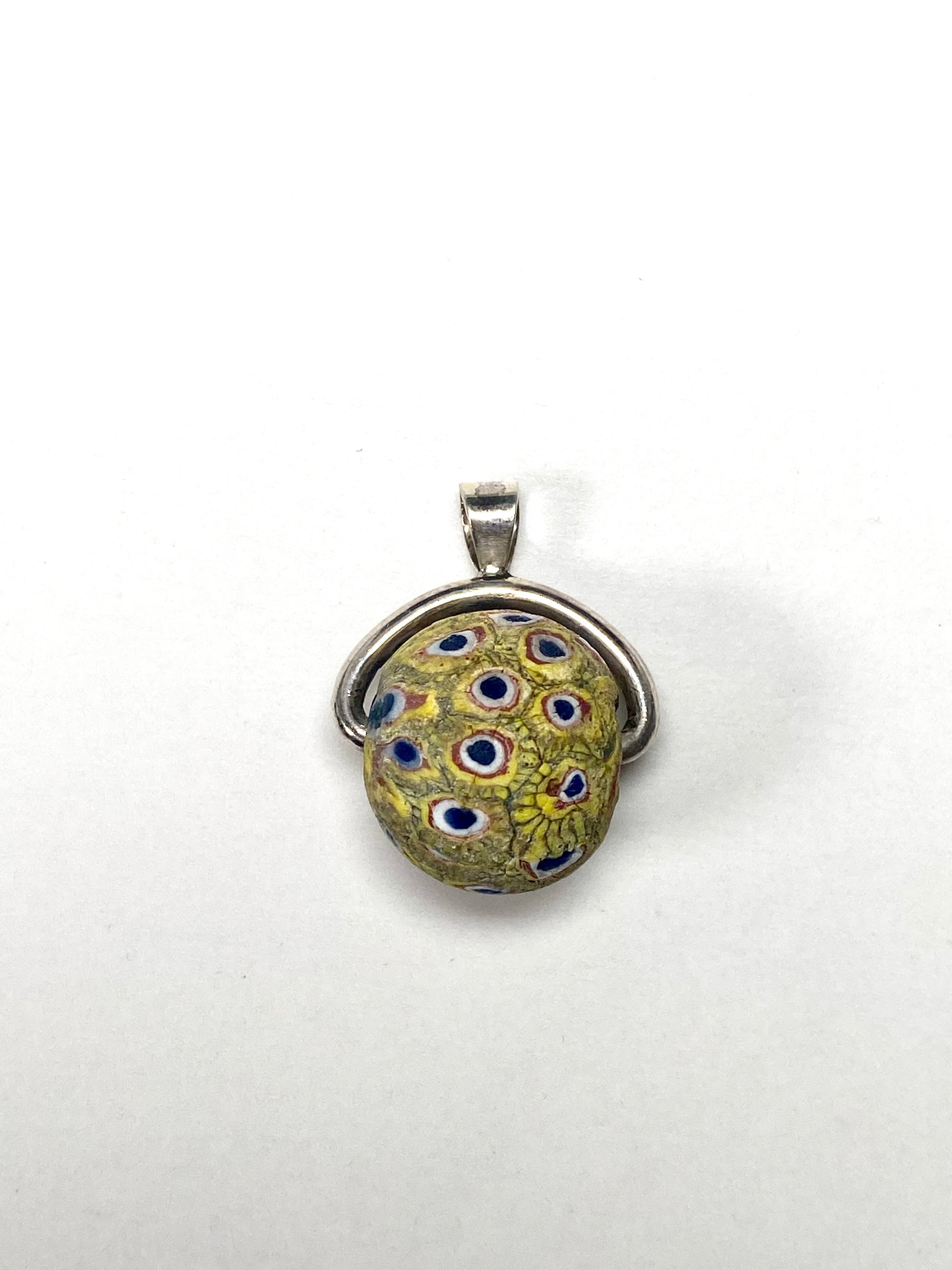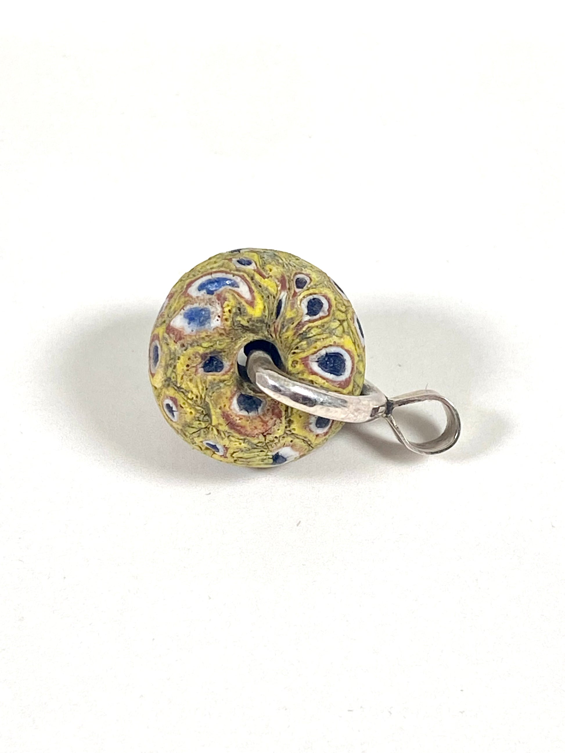 Este anuncio en particular corresponde a un colgante giratorio con una cuenta millefiori estratificada con ojos azules y rojos cobrizos sobre fondo amarillo. Esta cuenta no solo presenta características únicas de laminado a mano en cada segmento, sino que el engaste es de plata de ley, hecho a medida por nuestro equipo de artesanos y lleva la marca 925 en el asa.