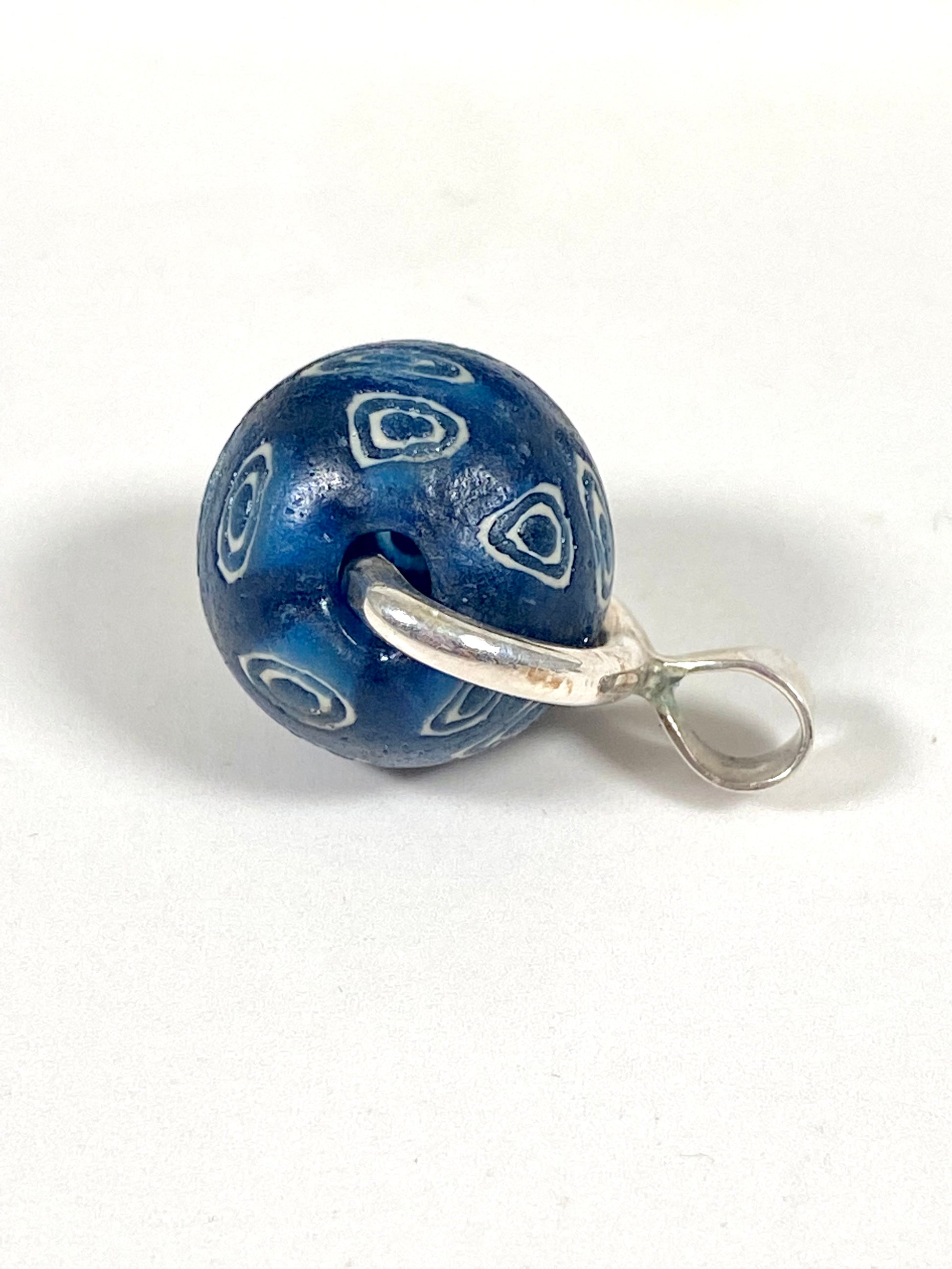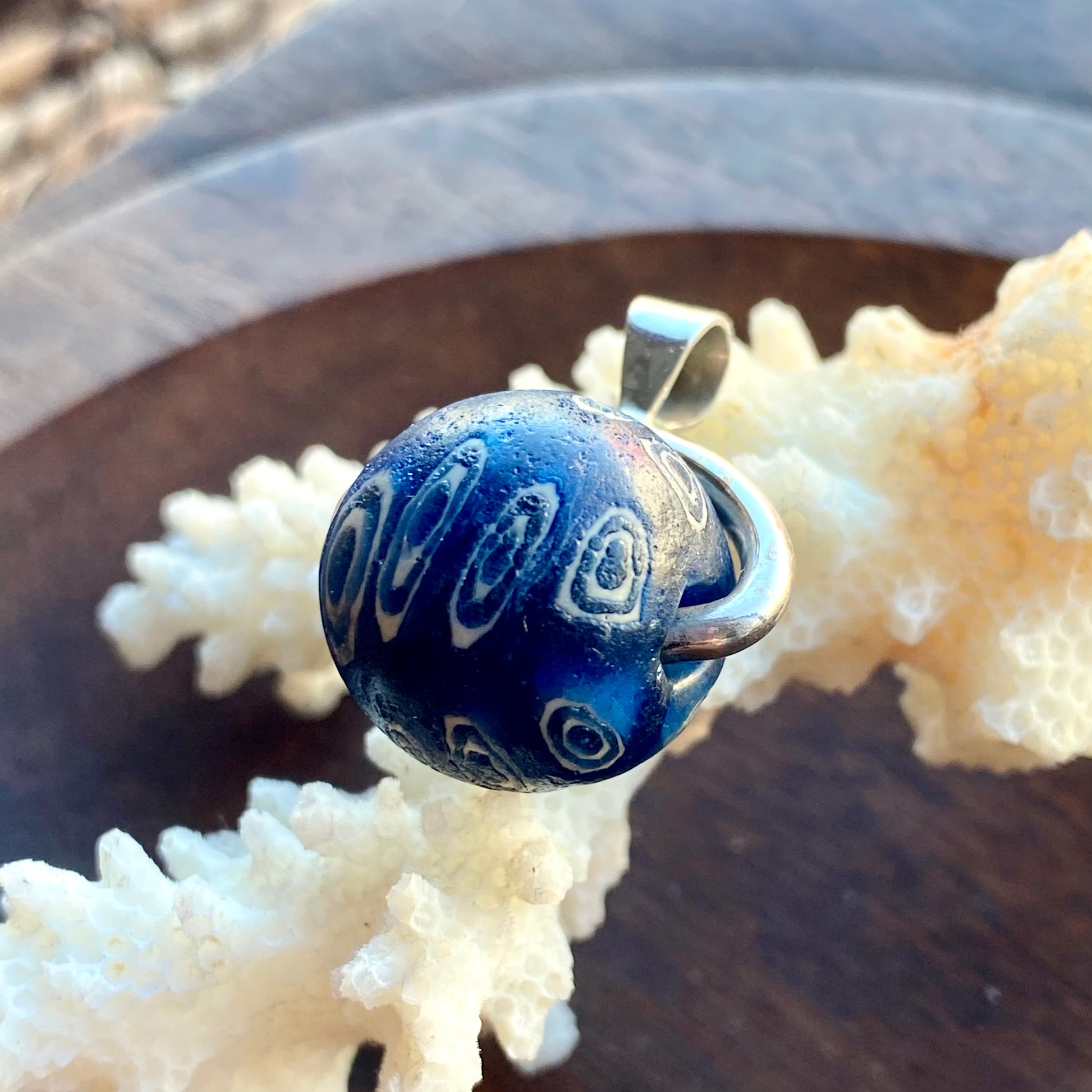 Este anuncio en particular corresponde a un colgante giratorio con una cuenta millefiori estratificada con detalles en blanco y cobalto. Esta cuenta no solo presenta características únicas de su laminado a mano en cada segmento, sino que también posee una profundidad de color particularmente rica, casi índigo. El engaste es de plata de ley, hecho a medida por nuestro equipo de artesanos y lleva la marca 925 en el asa.