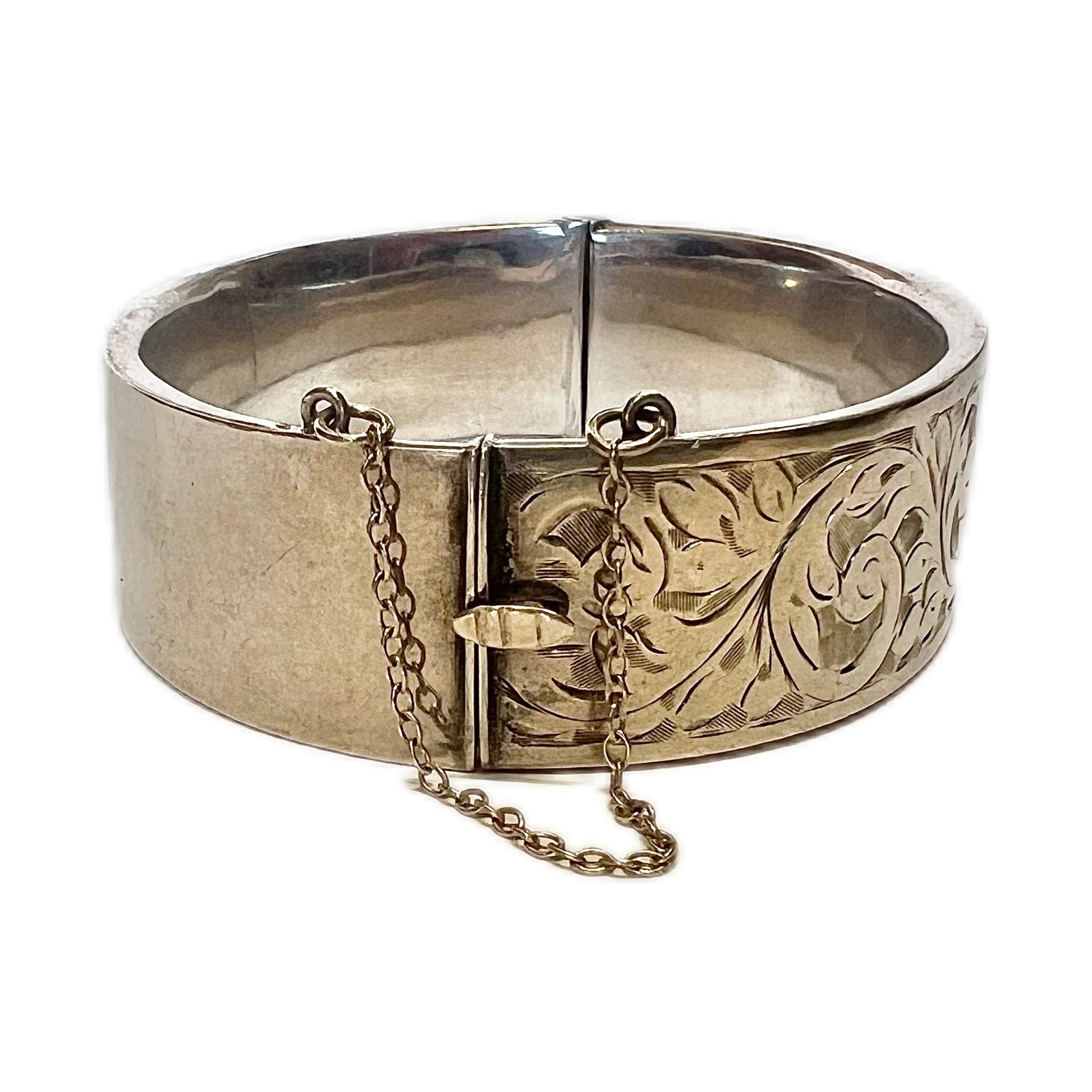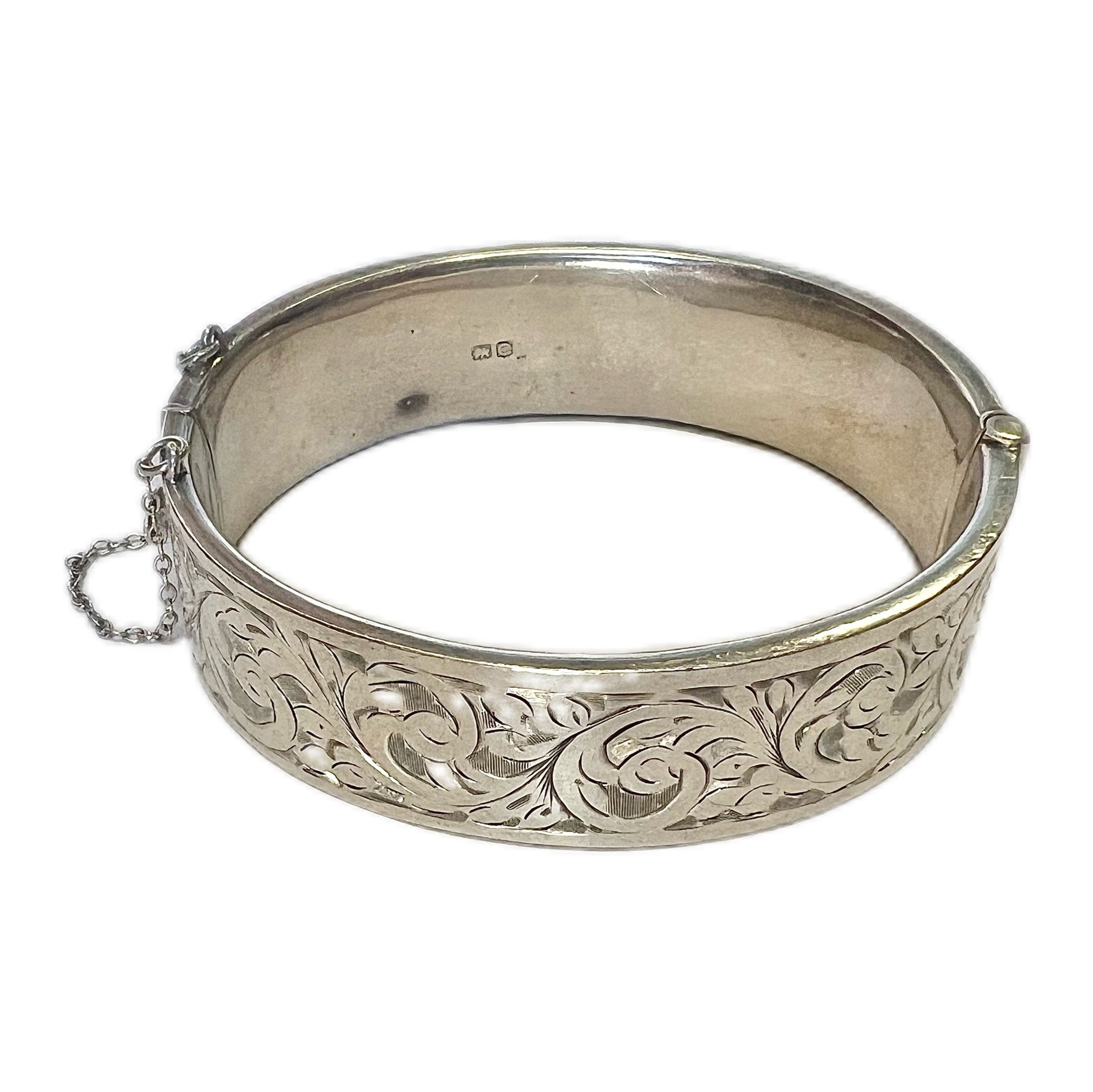 An elegant Victorian sterling silver bangle with safety chain and marks for Chester, 1886. Beautifully made with safety chain, secure clasp and engraved front.