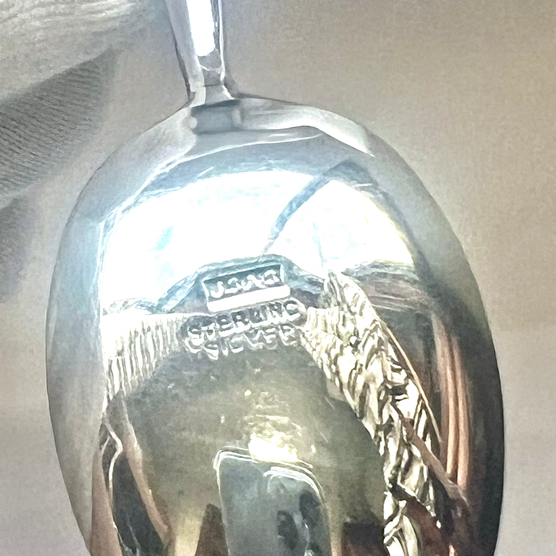 Esta rara cuchara de recuerdo antigua de plata esterlina neozelandesa con mango de jade nefrita lleva la marca del patrocinador Joseph Swindell & Son, plateros de Christchurch, cuya sociedad estuvo activa entre 1880 y 1905. La nefrita es originaria de Nueva Zelanda, entre otros países, y ha sido apreciada a lo largo del tiempo por su belleza y su rico tono verde. Lleva la inscripción "NZ" en hermosa cursiva en el cuenco, representando a Nueva Zelanda, y un encantador motivo maorí en el mango.