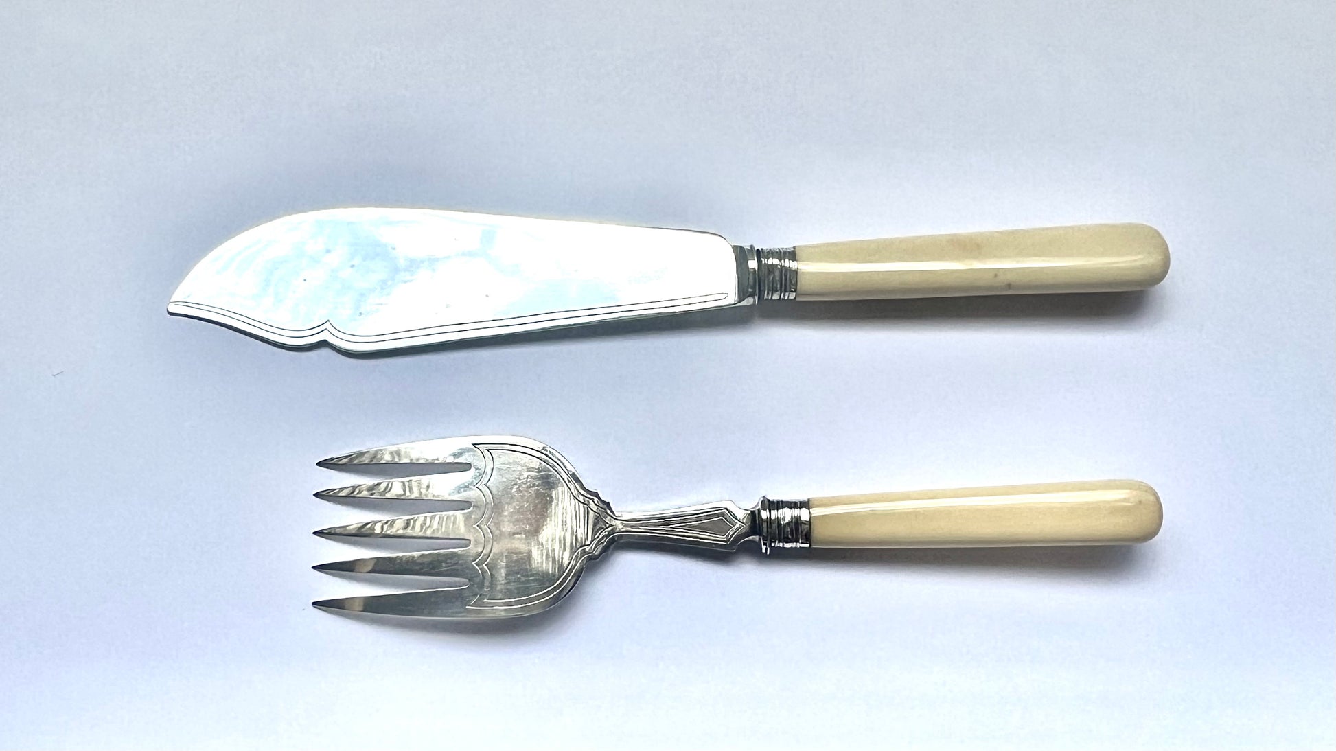 Precioso par de cubiertos para pescado de plata de ley inglesa de finales de la época victoriana con mangos de marfil, con marcas de Frederick Wilson & Co., Sheffield, 1900. Registrada por primera vez en 1883, Wilson & Co. era una empresa especializada en pequeños artículos de plata y vajilla fina. Este juego es particularmente elegante, con robustas hojas de plata y mangos de marfil pulidos con esmero. Gracias a las propiedades antimicrobianas de la plata, es la manera perfecta de servir mariscos y, al mismo tiempo, crear una mesa elegante.