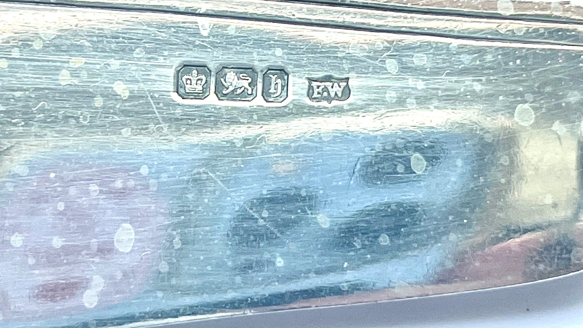 Excelente estado general de antigüedad; una pequeña hendidura en el mango, estable y con forma de rebanada de pescado, en excelente estado general. Ligero desgaste acorde con su antigüedad, leves rozaduras en las marcas, pero en general nítido y legible.
