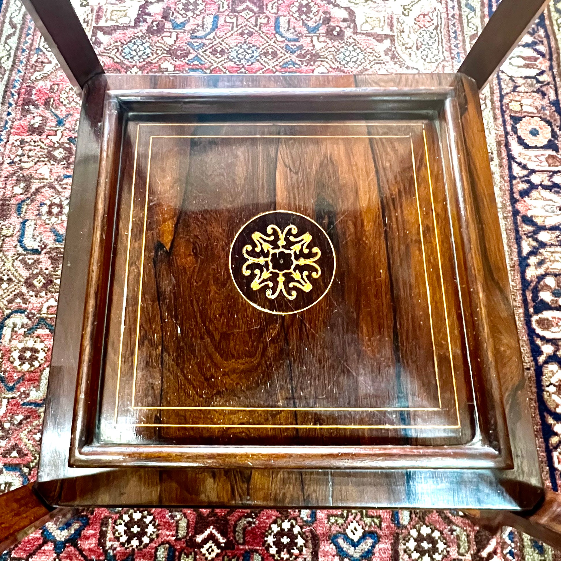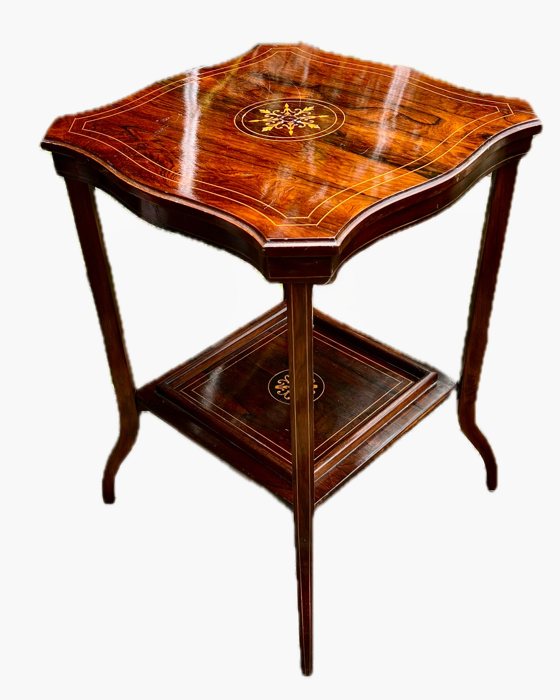 Mesa auxiliar antigua de palisandro eduardiano con incrustaciones de marquetería