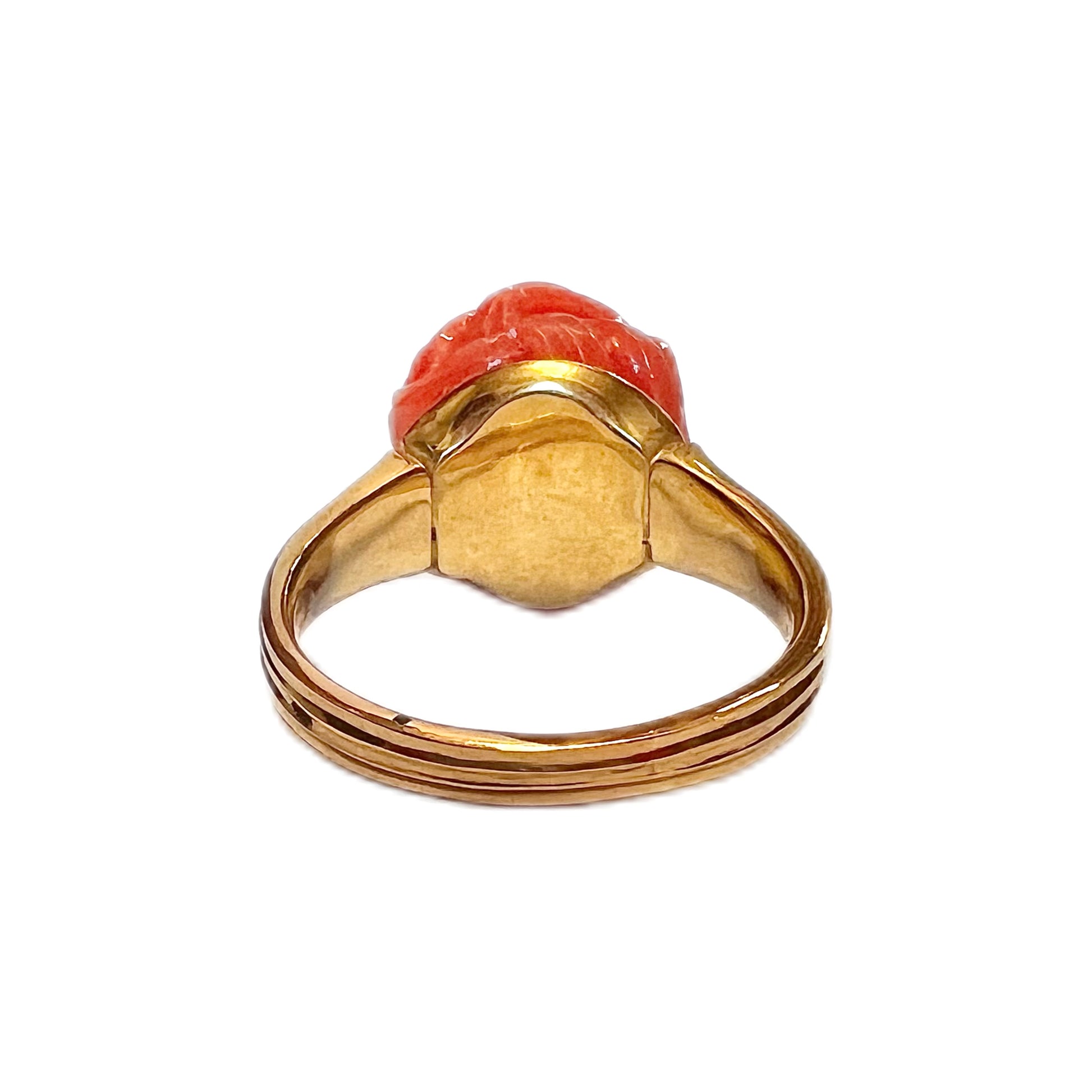 The 19th century coral knot ornament was mounted in a later 20th century Italian 18k setting. With wide shoulders and elegant detail to band, this is sure to be a future heirloom for any lady or gentleman of discerning taste.