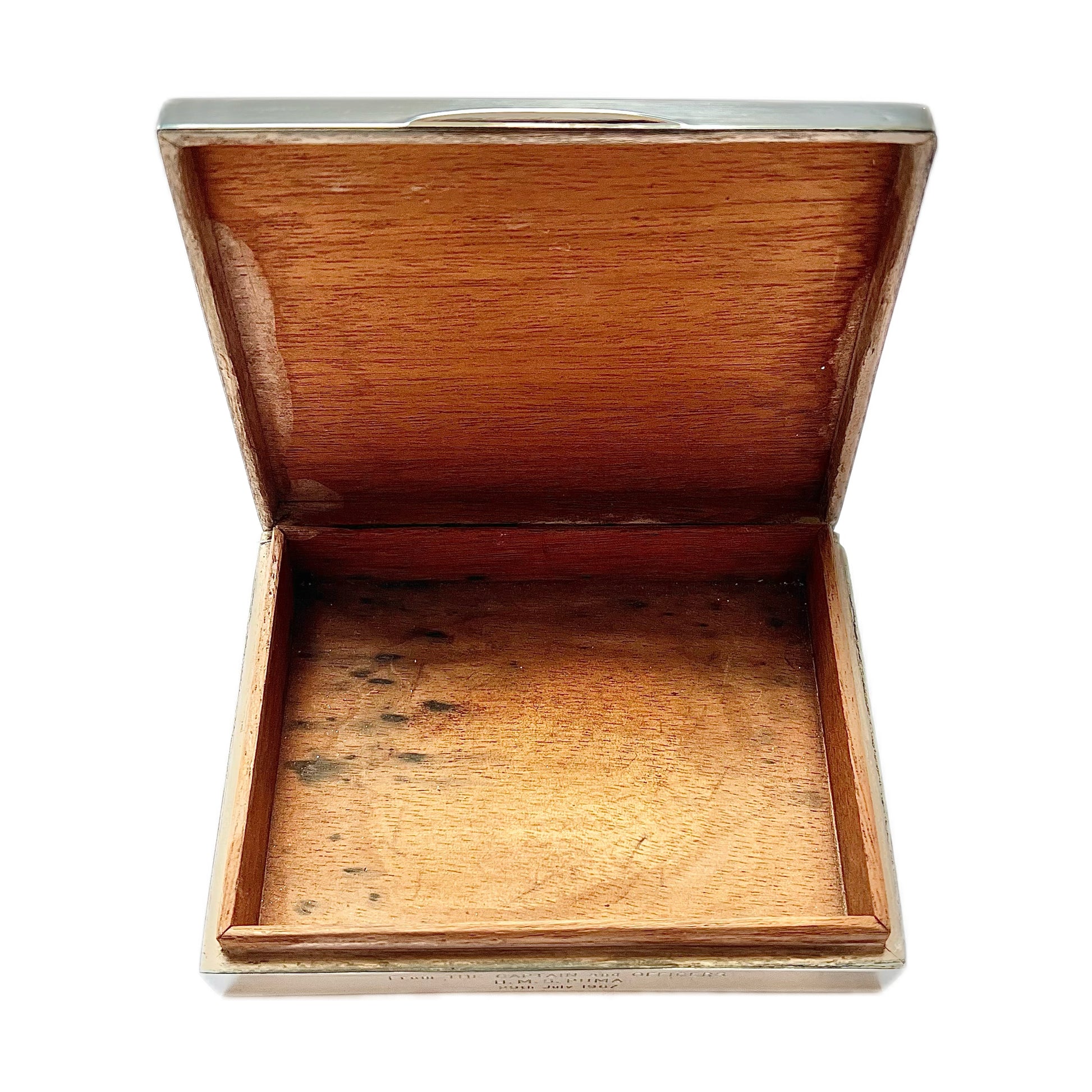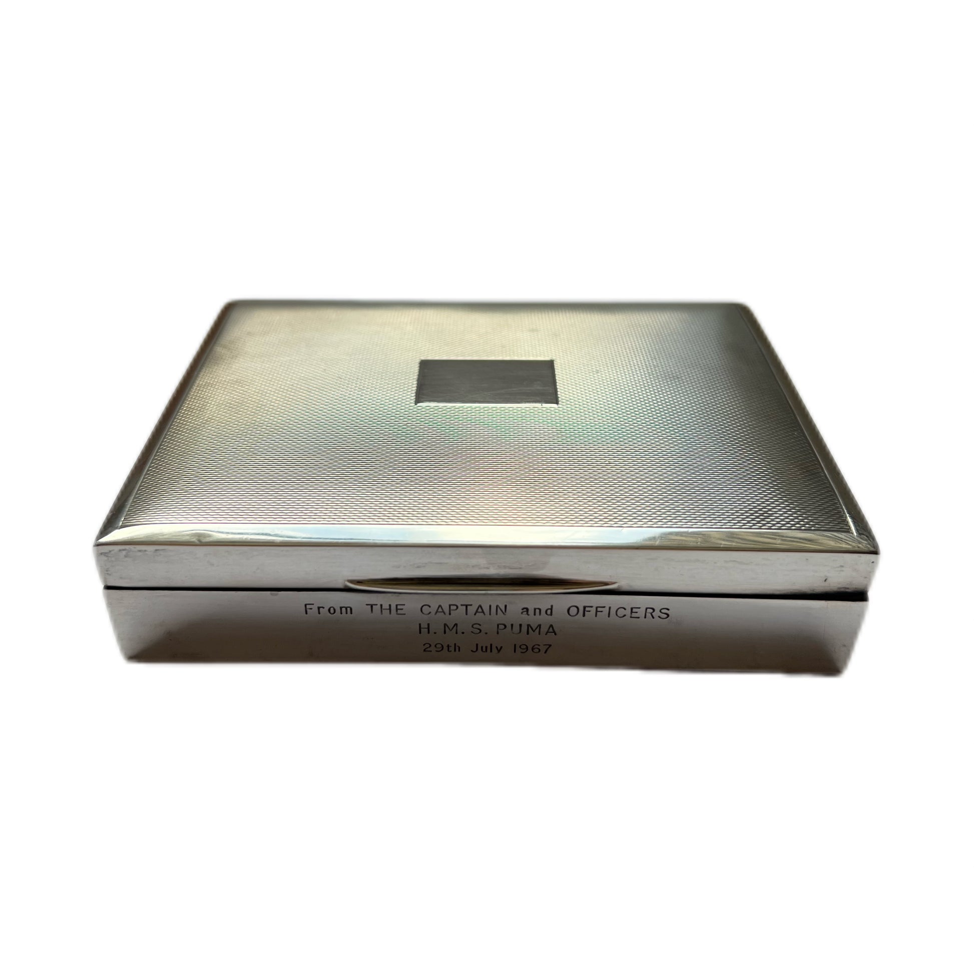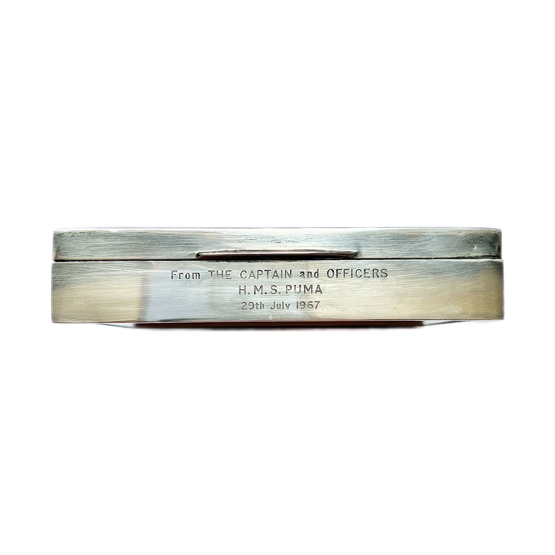 Una hermosa caja de cigarrillos Hardy Bros. de mediados de siglo, forrada en plata de ley y madera, que, como se aprecia en la inscripción grabada, fue obsequiada por el capitán y el oficial del HMS Puma (1957-1972), una fragata antiaérea clase Leopard de la Marina Real Británica. Marcas de ensayo para Hardy Brothers, Birmingham, 1966.