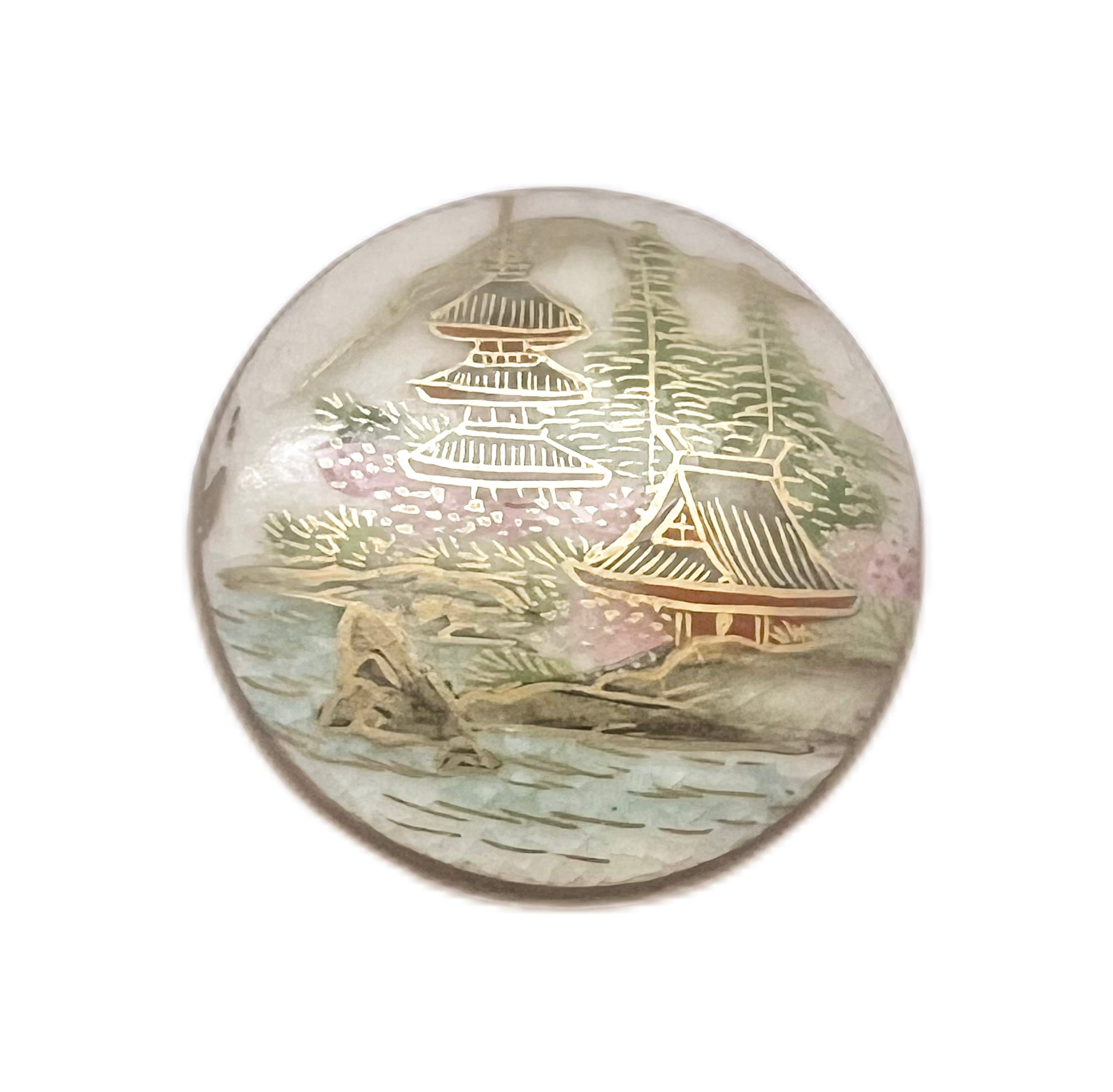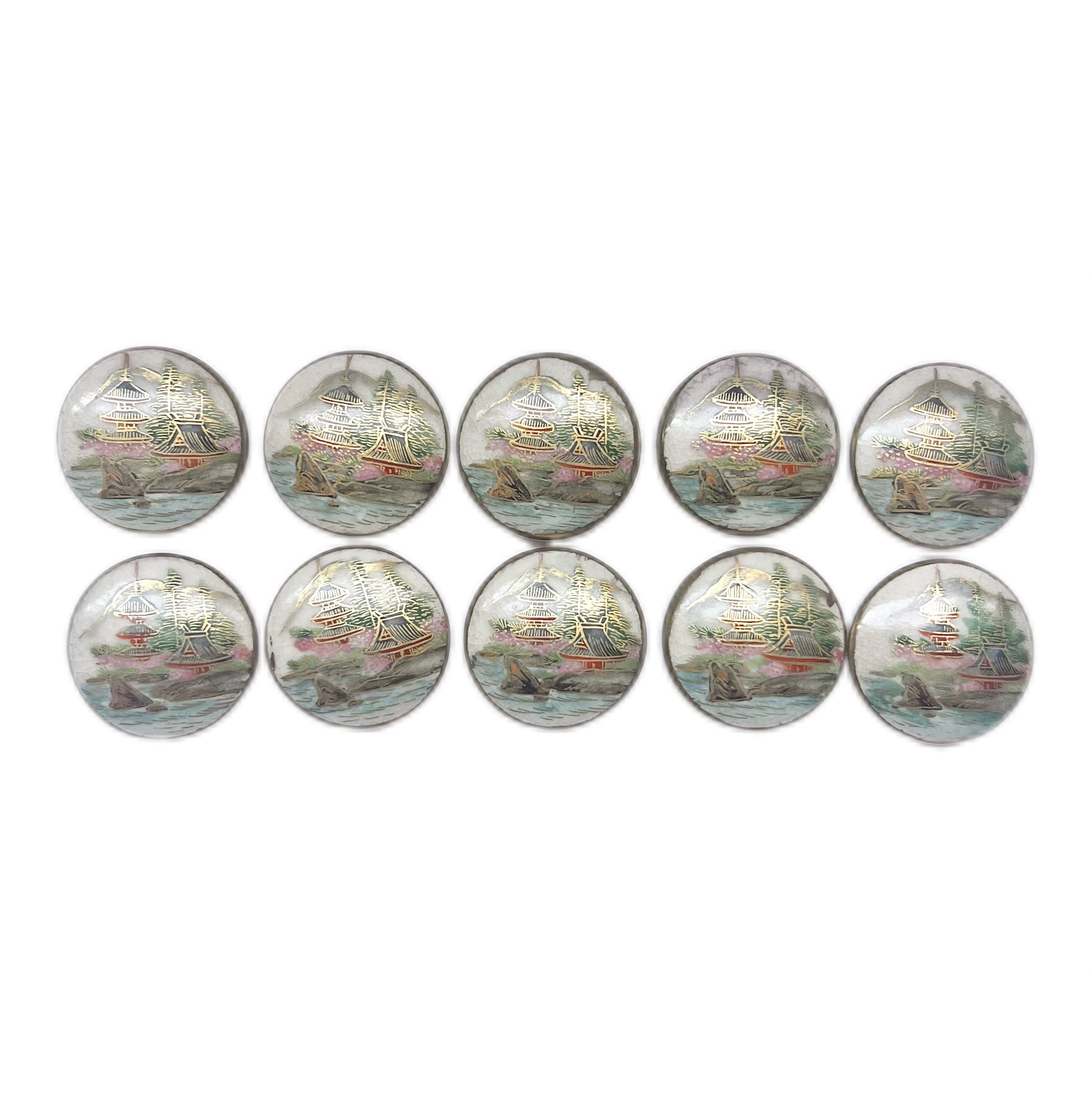 A beautiful set of 10 antique Satsuma handpainted buttons with temple and pagoda motifs, late Meiji Period circa 1900s. Rare to find, a set of this size would be perfect for any historical costumer or collector.