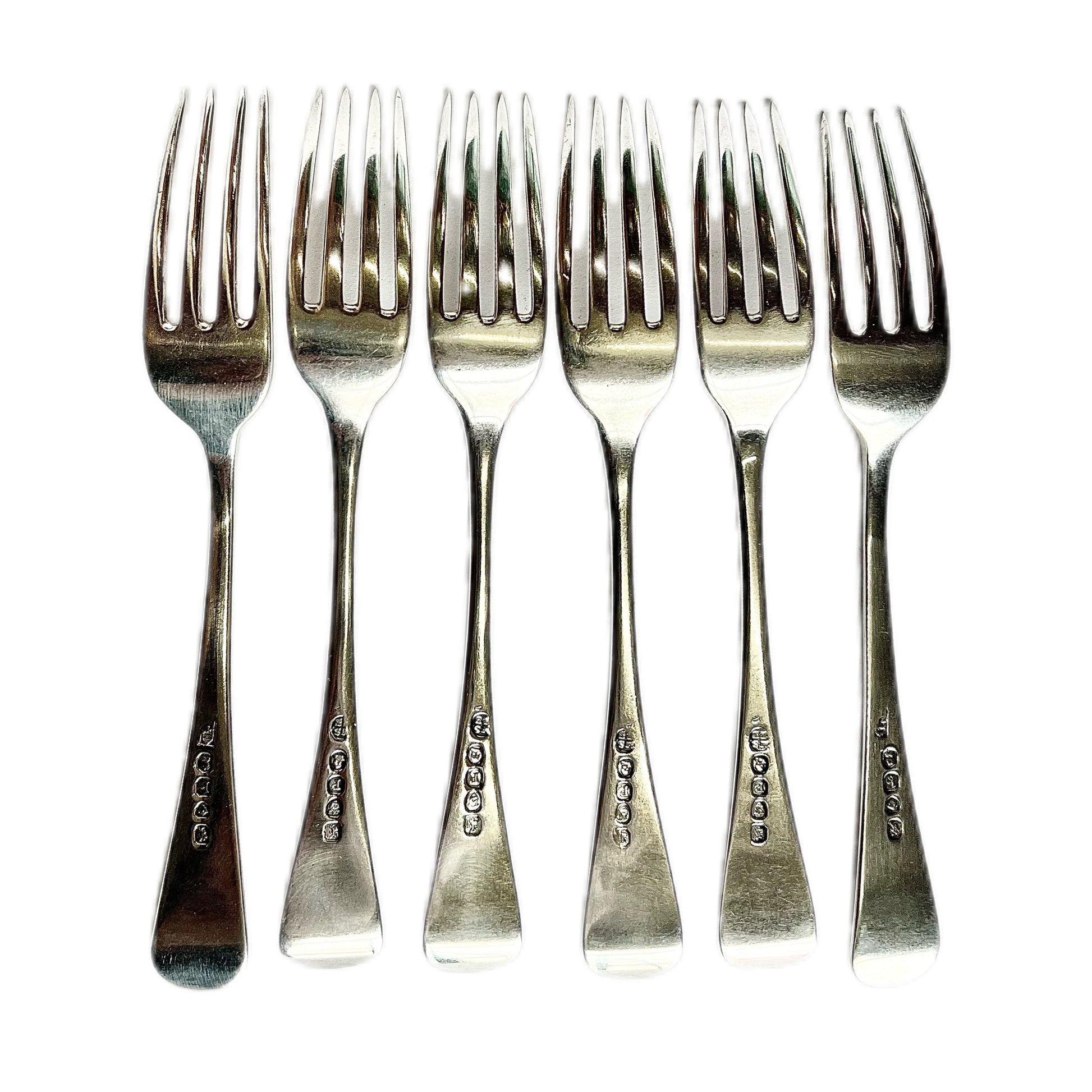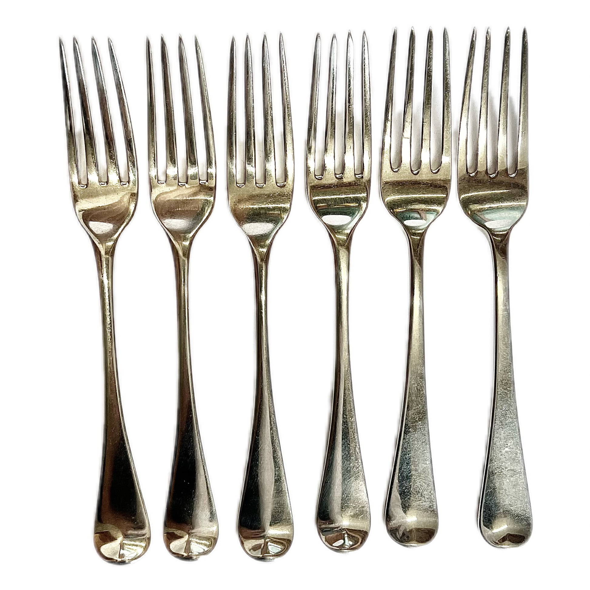Set of 6 Regency period sterling silver entree forks with marks for London 1810 (4 forks) and 1825 (2 forks), and by Mary & Eliza Sumner and Thomas Dicks respectively.